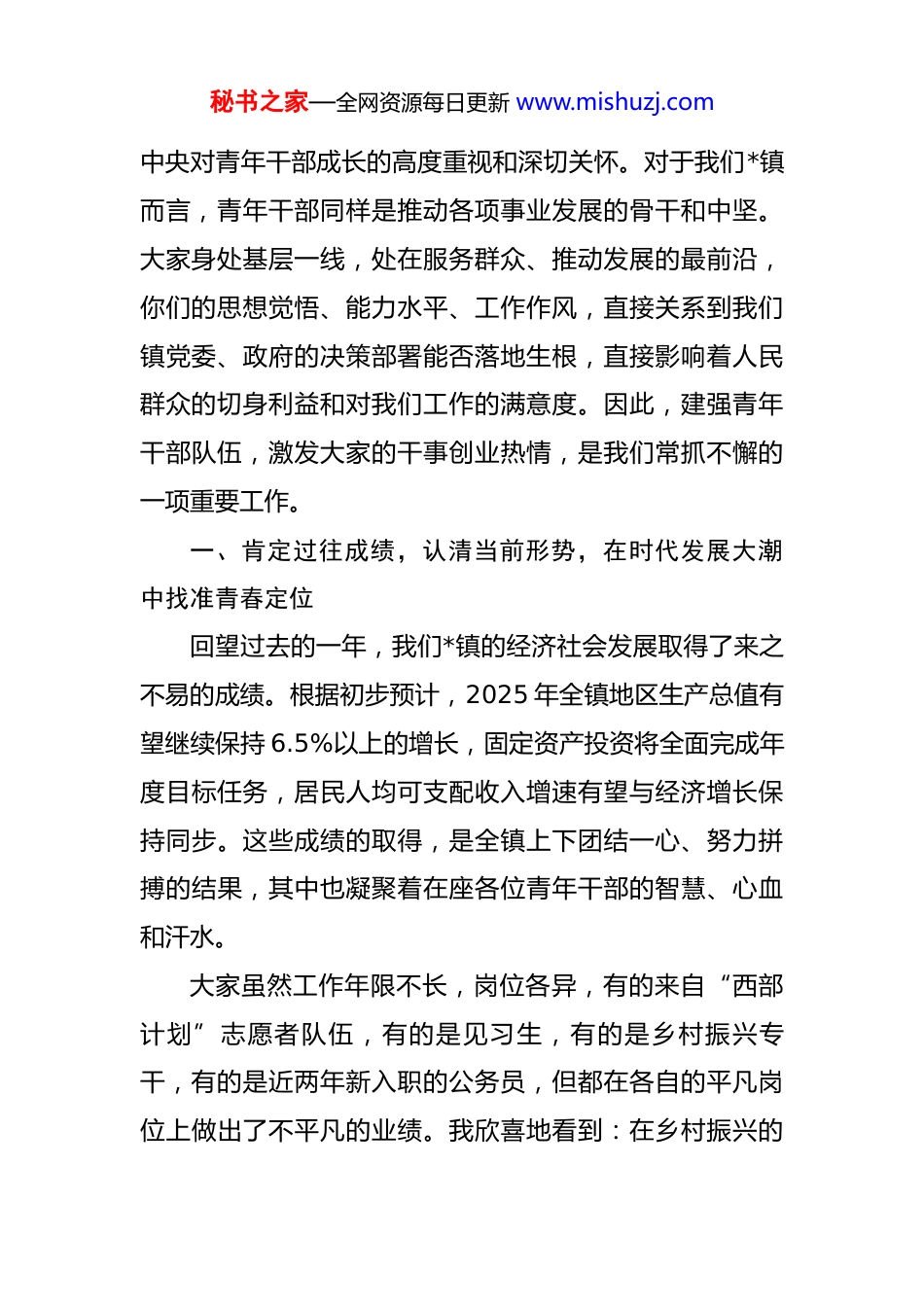 秘书之家—全网资源每日更新 www.mishuzj.com在 2025 年全镇青年干部座谈会上的讲话提纲 同志们:大家好!今天,我们专门安排时间,把全镇的青年干部召集到一起,召开这次座谈会。刚才,听了各位青年同志结合各自岗位所作的发言,大家谈认识、讲体会、说感悟、提建议,充满了朝气与锐气,展现了思考与担当,我听了之后深受感染,也深感欣慰。从你们身上,我看到了*镇未来的希望和发展的力量。今天的会议,既是一次交流会,也是一次谈心会,更是一次加油鼓劲的动员会。目的就是为了倾听大家的心声,了解大家的思想动态,帮助大家解决成长中的困惑,同时,也对大家提出一些希望和要求,激励大家在*镇这片热土上更好地成长成才、建功立业。青年是整个社会力量中最积极、最有生气的力量,国家的希望在青年,民族的未来在青年。我们党和国家的事业,归根结底要靠一代又一代的青年接续奋斗。习近平总书记多次强调,“年轻干部是党和国家事业发展的生力军,是中国特色社会主义事业的接班人”。在 2024 年春季学期中央党校中青年干部培训班开班之际,总书记再次作出重要指示,对年轻干部寄予殷切期望。这充分体现了党秘书之家—全网资源每日更新 www.mishuzj.com中央对青年干部成长的高度重视和深切关怀。对于我们*镇而言,青年干部同样是推动各项事业发展的骨干和中坚。大家身处基层一线,处在服务群众、推动发展的最前沿,你们的思想觉悟、能力水平、工作作风,直接关系到我们镇党委、政府的决策部署能否落地生根,直接影响着人民群众的切身利益和对我们工作的满意度。因此,建强青年干部队伍,激发大家的干事创业热情,是我们常抓不懈的一项重要工作。一、肯定过往成绩,认清当前形势,在时代发展大潮中找准青春定位回望过去的一年,我们*镇的经济社会发展取得了来之不易的成绩。根据初步预计,2025 年全镇地区生产总值有望继续保持 6.5%以上的增长,固定资产投资将全面完成年度目标任务,居民人均可支配收入增速有望与经济增长保持同步。这些成绩的取得,是全镇上下团结一心、努力拼搏的结果,其中也凝聚着在座各位青年干部的智慧、心血和汗水。大家虽然工作年限不长,岗位各异,有的来自“西部计划”志愿者队伍,有的是见习生,有的是乡村振兴专干,有的是近两年新入职的公务员,但都在各自的平凡岗位上做出了不平凡的业绩。我欣喜地看到:在乡村振兴的秘书之家—全网资源每日更新 www.mishuzj.com主战场上,有你们奔波忙碌的身影。有的同志为了一个产业项目能够顺利落地,反复深入村组,与群众促膝长谈,耐心细致地讲解政策、化解疑虑,最终推动了*村数字农业示范基地的成功建立,让现代农业技术在田间地头开花结果。有的同志积极探索“党建+电商”模式,帮助本地的特色农产品“出山进城”,拓宽了群众的增收渠道,被乡亲们亲切地称为“咱们自己的带货员”。在基层治理的第一线,有你们服务群众的真情。有的同志在综治维稳岗位上,面对复杂的矛盾纠纷,不回避、不退缩,运用学到的法律知识和群众工作方法,成功调处了多起邻里积怨,维护了一方和谐稳定。有的同志在便民服务中心窗口,每天面对群众的各种咨询和诉求,始终报以微笑和耐心,通过优化流程、简化手续,让“最多跑一次”的承诺真正落到了实处,赢得了群众的广泛赞誉。还有的青年同志自发组织起来,利用周末时间开办“伴学乐园”,为留守儿童提供课业辅导和亲情陪伴,用爱心点亮了孩子们的童年。在急难险重的任务面前,有你们挺身而出的担当。无论是去年的防汛抗洪,还是日常的安全生产巡查,亦或是重大项目建设的攻坚扫尾,总能看到青年干部冲锋在前的身影。大家敢于到任务最重、困难最多的地方去,在实践中经风雨、见世面、壮筋骨,用实际行动诠释了“关键时刻站得秘书之家—全网资源每日更新 www.mishuzj.com出、顶得上、靠得住”的青春誓言。这些点点滴滴的成绩,充分证明了我们*镇的青年干部是一支有理想、有本领、有担当,值得信赖和依靠的队伍。在此,我代表镇党委、政府,向大家表示衷心的感谢!在肯定成绩的同时,我们更要清醒地认识到当前面临的形势和任务。当前,*镇正处在巩固拓展脱贫攻坚成果同乡村...
