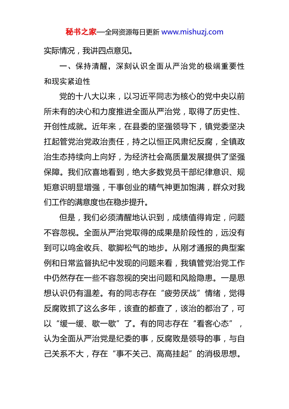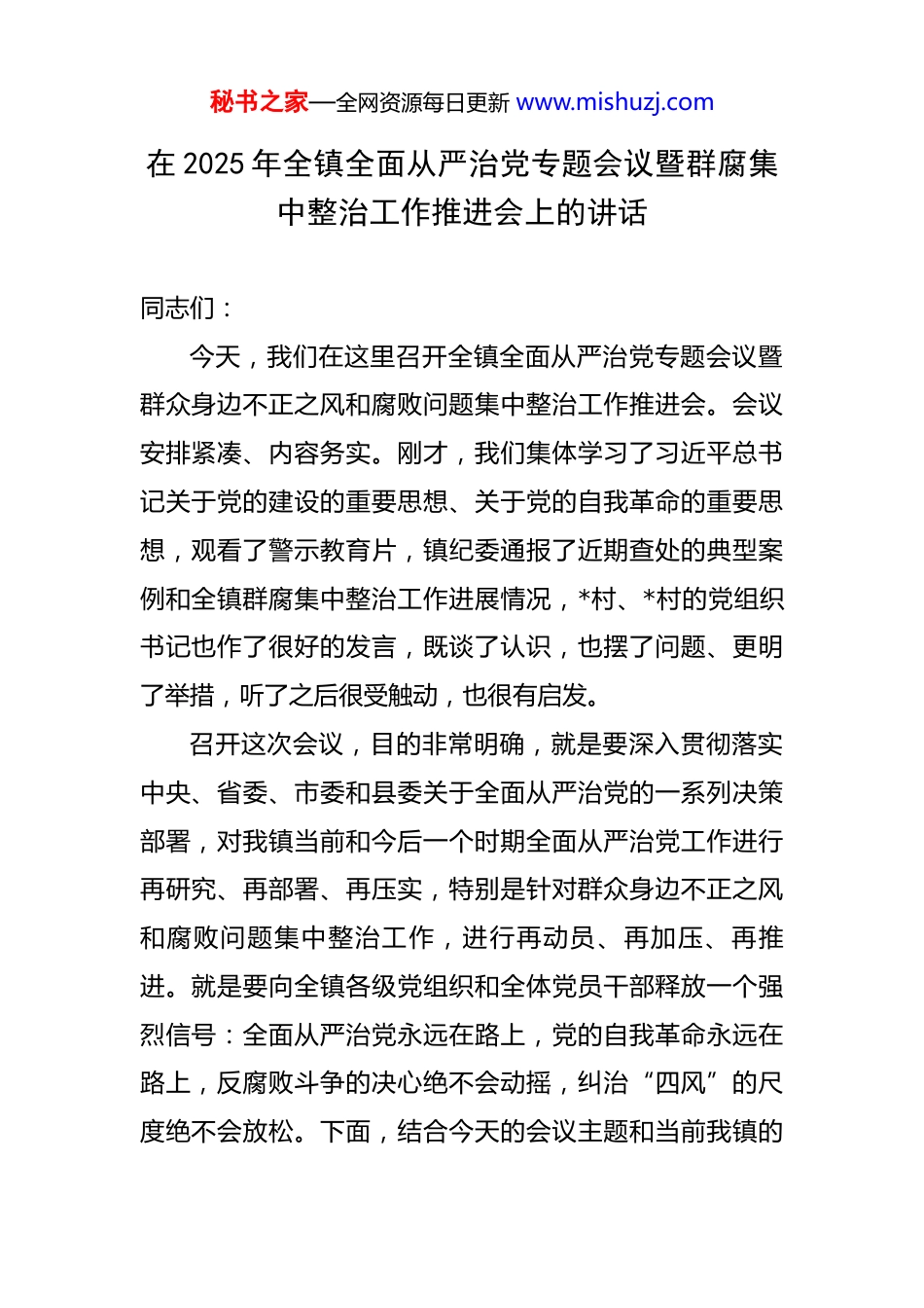 秘书之家—全网资源每日更新 www.mishuzj.com在 2025 年全镇全面从严治党专题会议暨群腐集中整治工作推进会上的讲话 同志们:今天,我们在这里召开全镇全面从严治党专题会议暨群众身边不正之风和腐败问题集中整治工作推进会。会议安排紧凑、内容务实。刚才,我们集体学习了习近平总书记关于党的建设的重要思想、关于党的自我革命的重要思想,观看了警示教育片,镇纪委通报了近期查处的典型案例和全镇群腐集中整治工作进展情况,*村、*村的党组织书记也作了很好的发言,既谈了认识,也摆了问题、更明了举措,听了之后很受触动,也很有启发。召开这次会议,目的非常明确,就是要深入贯彻落实中央、省委、市委和县委关于全面从严治党的一系列决策部署,对我镇当前和今后一个时期全面从严治党工作进行再研究、再部署、再压实,特别是针对群众身边不正之风和腐败问题集中整治工作,进行再动员、再加压、再推进。就是要向全镇各级党组织和全体党员干部释放一个强烈信号:全面从严治党永远在路上,党的自我革命永远在路上,反腐败斗争的决心绝不会动摇,纠治“四风”的尺度绝不会放松。下面,结合今天的会议主题和当前我镇的秘书之家—全网资源每日更新 www.mishuzj.com实际情况,我讲四点意见。一、保持清醒,深刻认识全面从严治党的极端重要性和现实紧迫性党的十八大以来,以习近平同志为核心的党中央以前所未有的决心和力度推进全面从严治党,取得了历史性、开创性成就。近年来,在县委的坚强领导下,镇党委坚决扛起管党治党政治责任,持之以恒正风肃纪反腐,全镇政治生态持续向上向好,为经济社会高质量发展提供了坚强保障。我们欣喜地看到,绝大多数党员干部纪律意识、规矩意识明显增强,干事创业的精气神更加饱满,群众对我们工作的满意度也在稳步提升。但是,我们必须清醒地认识到,成绩值得肯定,问题不容忽视。全面从严治党取得的成果是阶段性的,远没有到可以鸣金收兵、歇脚松气的地步。从刚才通报的典型案例和日常监督执纪中发现的问题来看,我镇管党治党工作中仍然存在一些不容忽视的突出问题和风险隐患。一是思想认识仍有温差。有的同志存在“疲劳厌战”情绪,觉得反腐败抓了这么多年,该查的都查了,该治的都治了,可以“缓一缓、歇一歇”了。有的同志存在“看客心态”,认为全面从严治党是纪委的事,反腐败是领导的事,与自己关系不大,存在“事不关己、高高挂起”的消极思想。秘书之家—全网资源每日更新 www.mishuzj.com还有的村级干部认为自己岗位“位微权轻”,不容易出问题,对廉政风险缺乏应有的警惕。这些思想上的松懈和麻痹,是滋生腐败和作风问题的温床,是我们必须坚决克服的最大敌人。二是责任落实仍有落差。“主体责任”和“一岗双责”的压力传导还存在层层递减的现象。有的班子成员对分管领域的党风廉政建设工作研究不深、抓得不实,习惯于当“甩手掌柜”,满足于开会讲讲、文件转转,对干部存在的苗头性、倾向性问题“睁一只眼闭一只眼”。有的村党组织书记履行第一责任人职责不到位,对村务监督委员会的工作支持不够,对村干部的教育、管理和监督失之于宽、失之于软。三是重点领域风险依然突出。从近年来的案件查处情况和信访举报线索看,工程建设、征地拆迁、惠民资金发放、农村集体“三资”管理等领域,依然是腐败问题易发多发的“重灾区”。一些“蝇贪蚁腐”花样翻新、隐形变异,有的利用职务便利在工程项目中优亲厚友、违规插手;有的在惠农补贴、社会救助等款项分配上动歪脑筋、玩“障眼法”;有的在管理集体资产资源时监守自盗、侵占挪用。这些问题虽然发生在基层,但啃食的是群众的获得感,挥霍的是群众的信任,动摇的是党的执政根基,危害极大。四是作风顽疾禁而未绝。“四风”问题树倒根存,土壤还在。形式主义、官僚秘书之家—全网资源每日更新 www.mishuzj.com主义问题仍然不同程度存在,有的干部抓工作习惯于“以会议落实会议、以文件落实文件”,调查研究“走马观花”,服务群众“推拖绕躲”。享乐主义、奢靡之风出现了一些新动向、新表现,比如“不吃公款吃老板”、违规收送电子红包、通过快递收送礼品等隐形变异问题,值得我们高度警...