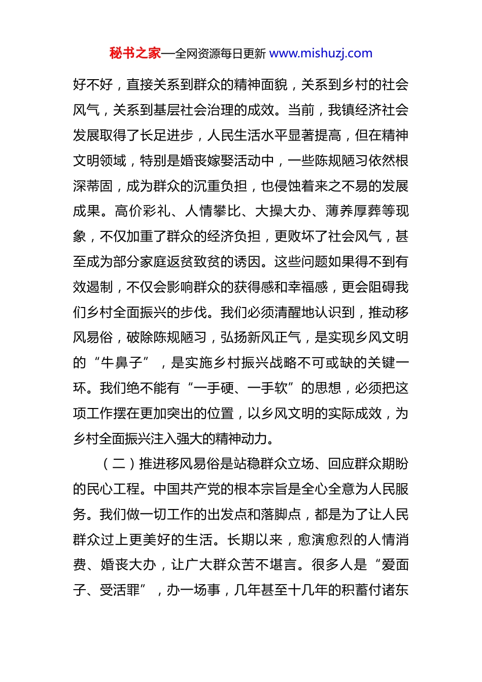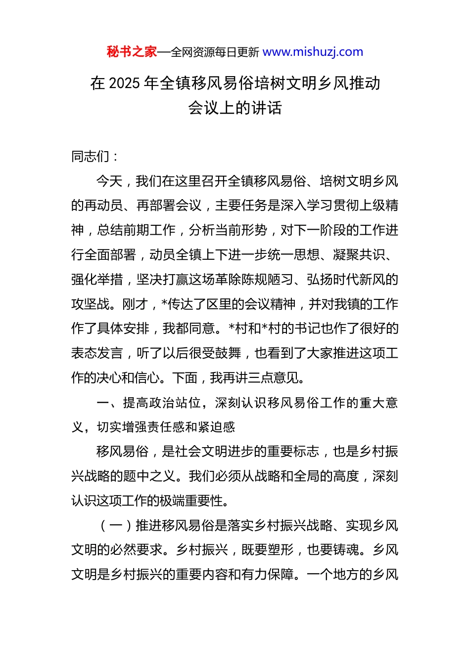 秘书之家—全网资源每日更新 www.mishuzj.com在 2025 年全镇移风易俗培树文明乡风推动会议上的讲话 同志们:今天,我们在这里召开全镇移风易俗、培树文明乡风的再动员、再部署会议,主要任务是深入学习贯彻上级精神,总结前期工作,分析当前形势,对下一阶段的工作进行全面部署,动员全镇上下进一步统一思想、凝聚共识、强化举措,坚决打赢这场革除陈规陋习、弘扬时代新风的攻坚战。刚才,*传达了区里的会议精神,并对我镇的工作作了具体安排,我都同意。*村和*村的书记也作了很好的表态发言,听了以后很受鼓舞,也看到了大家推进这项工作的决心和信心。下面,我再讲三点意见。一、提高政治站位,深刻认识移风易俗工作的重大意义,切实增强责任感和紧迫感移风易俗,是社会文明进步的重要标志,也是乡村振兴战略的题中之义。我们必须从战略和全局的高度,深刻认识这项工作的极端重要性。(一)推进移风易俗是落实乡村振兴战略、实现乡风文明的必然要求。乡村振兴,既要塑形,也要铸魂。乡风文明是乡村振兴的重要内容和有力保障。一个地方的乡风秘书之家—全网资源每日更新 www.mishuzj.com好不好,直接关系到群众的精神面貌,关系到乡村的社会风气,关系到基层社会治理的成效。当前,我镇经济社会发展取得了长足进步,人民生活水平显著提高,但在精神文明领域,特别是婚丧嫁娶活动中,一些陈规陋习依然根深蒂固,成为群众的沉重负担,也侵蚀着来之不易的发展成果。高价彩礼、人情攀比、大操大办、薄养厚葬等现象,不仅加重了群众的经济负担,更败坏了社会风气,甚至成为部分家庭返贫致贫的诱因。这些问题如果得不到有效遏制,不仅会影响群众的获得感和幸福感,更会阻碍我们乡村全面振兴的步伐。我们必须清醒地认识到,推动移风易俗,破除陈规陋习,弘扬新风正气,是实现乡风文明的“牛鼻子”,是实施乡村振兴战略不可或缺的关键一环。我们绝不能有“一手硬、一手软”的思想,必须把这项工作摆在更加突出的位置,以乡风文明的实际成效,为乡村全面振兴注入强大的精神动力。(二)推进移风易俗是站稳群众立场、回应群众期盼的民心工程。中国共产党的根本宗旨是全心全意为人民服务。我们做一切工作的出发点和落脚点,都是为了让人民群众过上更美好的生活。长期以来,愈演愈烈的人情消费、婚丧大办,让广大群众苦不堪言。很多人是“爱面子、受活罪”,办一场事,几年甚至十几年的积蓄付诸东秘书之家—全网资源每日更新 www.mishuzj.com流;收一次礼,就背上了沉重的人情债。这种被“面子”和“人情”绑架的社会风气,已经成为群众普遍的“忧心事、烦心事”。我们作为党员干部,必须置身于群众的所思所想所困所盼之中,感同身受地去体会群众的难处。群众不是不想改,而是不敢改、不好改,怕捅破那层情面、脸面的“窗户纸”。我们党委、政府、村党组织就是要挺身而出,为群众撑腰鼓劲,帮助群众把想说而不敢说的话讲出来,把想做而不敢做的事做起来,旗帜鲜明地向陈规陋习宣战,坚决把群众从过重的人情负担和奢侈浪费的攀比风气中解放出来。这项工作,本质上就是一项减轻群众负担、增进民生福祉的德政工程、民心工程。民心所向,政之所行。我们必须以坚定的决心和务实的举措,把这件好事办好、实事办实,真正让文明新风吹进千家万户,让群众有实实在在的获得感。(三)推进移风易俗是深化基层治理、提升治理能力的现实考验。移风易俗工作,看似是社会风气问题,实则是对我们基层治理体系和治理能力的一次全面检验。这项工作涉及千家万户,牵扯到复杂的传统观念、人情关系和社会心理,治理难度很大。能不能啃下这块“硬骨头”,直接反映了我们基层党组织的组织力、号召力和战斗力,直接考验着我们党员干部的群众工作能力和担当作为精秘书之家—全网资源每日更新 www.mishuzj.com神。当前,我镇的移风易俗工作已经进入了攻坚克难、深化拓展的关键阶段。第一批典型样板村取得了一定成效,但成果尚不稳固;第二批重点推进村刚刚起步,面临着诸多挑战。时间紧、任务重。全镇上下决不能有任何“走形式”“走过场”的心态,更不能有畏难情绪和松劲思想。我们必须把这项工作作为锤炼干部作...