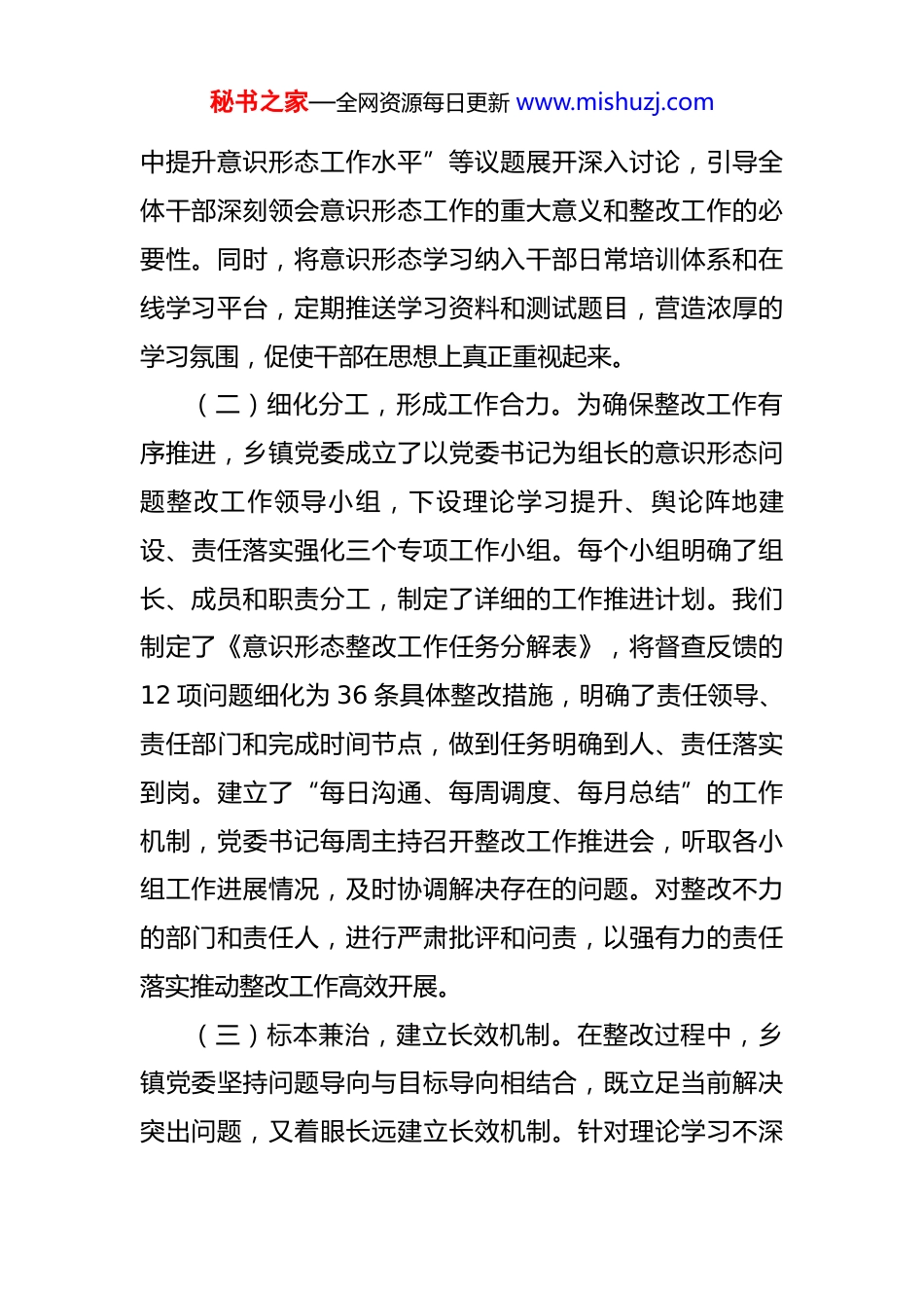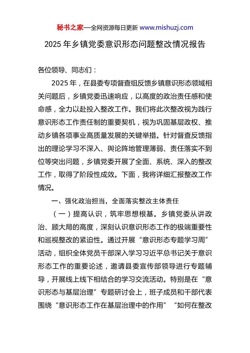 秘书之家—全网资源每日更新 www.mishuzj.com2025 年乡镇党委意识形态问题整改情况报告 各位领导、同志们:2025 年,在县委专项督查组反馈乡镇意识形态领域相关问题后,乡镇党委迅速响应,以高度的政治责任感和使命感,全力以赴投入整改工作。我们将此次整改视为践行意识形态工作责任制的重要契机,视为巩固基层政权、推动乡镇各项事业高质量发展的关键举措。针对督查反馈指出的理论学习不深入、舆论阵地管理薄弱、责任落实不到位等突出问题,乡镇党委开展了全面、系统、深入的整改工作,取得了阶段性成效。下面,我将详细汇报整改工作情况。一、强化政治担当,全面落实整改主体责任(一)提高认识,筑牢思想根基。乡镇党委从讲政治、顾大局的高度,深刻认识意识形态工作的极端重要性和巡视整改的紧迫性。通过开展“意识形态专题学习周”活动,组织全体党员干部深入学习习近平总书记关于意识形态工作的重要论述,邀请县委宣传部领导进行专题辅导,开展线上线下相结合的学习交流活动。特别是在“意识形态与基层治理”专题研讨会上,班子成员和干部代表围绕“意识形态工作在基层治理中的作用”“如何在整改秘书之家—全网资源每日更新 www.mishuzj.com中提升意识形态工作水平”等议题展开深入讨论,引导全体干部深刻领会意识形态工作的重大意义和整改工作的必要性。同时,将意识形态学习纳入干部日常培训体系和在线学习平台,定期推送学习资料和测试题目,营造浓厚的学习氛围,促使干部在思想上真正重视起来。(二)细化分工,形成工作合力。为确保整改工作有序推进,乡镇党委成立了以党委书记为组长的意识形态问题整改工作领导小组,下设理论学习提升、舆论阵地建设、责任落实强化三个专项工作小组。每个小组明确了组长、成员和职责分工,制定了详细的工作推进计划。我们制定了《意识形态整改工作任务分解表》,将督查反馈的12 项问题细化为 36 条具体整改措施,明确了责任领导、责任部门和完成时间节点,做到任务明确到人、责任落实到岗。建立了“每日沟通、每周调度、每月总结”的工作机制,党委书记每周主持召开整改工作推进会,听取各小组工作进展情况,及时协调解决存在的问题。对整改不力的部门和责任人,进行严肃批评和问责,以强有力的责任落实推动整改工作高效开展。(三)标本兼治,建立长效机制。在整改过程中,乡镇党委坚持问题导向与目标导向相结合,既立足当前解决突出问题,又着眼长远建立长效机制。针对理论学习不深秘书之家—全网资源每日更新 www.mishuzj.com入的问题,制定了《乡镇党员干部理论学习制度》,明确学习内容、学习方式和学习要求,建立学习档案,加强对学习情况的考核评价。针对舆论阵地管理薄弱的问题,出台了《乡镇舆论阵地管理制度》,加强对微信公众号、微博等新媒体平台和农村大喇叭、文化宣传栏等传统阵地的管理,规范信息发布流程,建立舆情监测和应急处置机制。针对责任落实不到位的问题,完善了《乡镇意识形态工作责任制实施细则》,明确各级党组织和领导干部的意识形态工作责任,建立健全责任考核和追究制度,确保意识形态工作责任落到实处。二、聚焦重点问题,精准发力推进整改落实(一)加强理论学习,提升思想素养。一是丰富学习内容。制定了详细的学习计划,将习近平新时代中国特色社会主义思想、党的二十大精神、意识形态工作相关文件等纳入学习内容,确保学习的系统性和全面性。二是创新学习方式。采用集中学习与个人自学相结合、线上学习与线下学习相结合、专家辅导与交流研讨相结合的方式,提高学习的针对性和实效性。例如,利用“学习强国”平台、微信公众号等开展线上学习,定期组织党员干部进行学习心得交流和研讨。三是强化学习考核。建立学习考勤制度和学习效果考核制度,对党员干部的学习情况进行定秘书之家—全网资源每日更新 www.mishuzj.com期检查和考核,将学习情况纳入干部年度考核和评先评优的重要内容,确保学习任务落到实处。(二)强化阵地建设,传播正能量。一是加强新媒体阵地管理。安排专人负责乡镇微信公众号、微博等新媒体平台的运营管理,定期发布政策解读、工作动态、先进典型等信息,传播正能量...