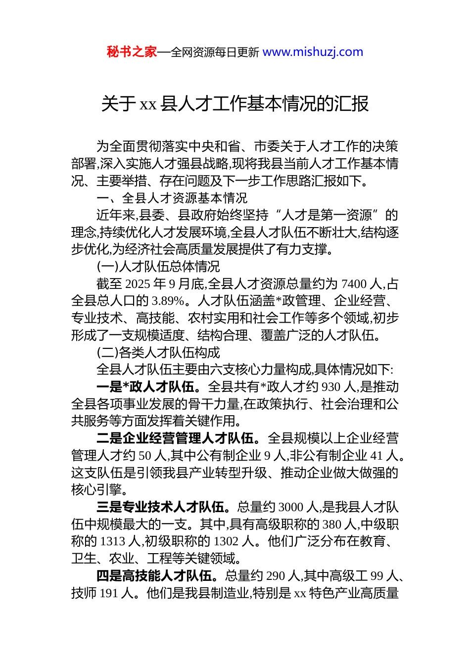 秘书之家—全网资源每日更新 www.mishuzj.com关于 xx 县人才工作基本情况的汇报为全面贯彻落实中央和省、市委关于人才工作的决策部署,深入实施人才强县战略,现将我县当前人才工作基本情况、主要举措、存在问题及下一步工作思路汇报如下。一、全县人才资源基本情况近年来,县委、县政府始终坚持“人才是第一资源”的理念,持续优化人才发展环境,全县人才队伍不断壮大,结构逐步优化,为经济社会高质量发展提供了有力支撑。(一)人才队伍总体情况截至 2025 年 9 月底,全县人才资源总量约为 7400 人,占全县总人口的 3.89%。人才队伍涵盖*政管理、企业经营、专业技术、高技能、农村实用和社会工作等多个领域,初步形成了一支规模适度、结构合理、覆盖广泛的人才队伍。(二)各类人才队伍构成全县人才队伍主要由六支核心力量构成,具体情况如下:一是*政人才队伍。全县共有*政人才约 930 人,是推动全县各项事业发展的骨干力量,在政策执行、社会治理和公共服务等方面发挥着关键作用。二是企业经营管理人才队伍。全县规模以上企业经营管理人才约 50 人,其中公有制企业 9 人,非公有制企业 41 人。这支队伍是引领我县产业转型升级、推动企业做大做强的核心引擎。三是专业技术人才队伍。总量约 3000 人,是我县人才队伍中规模最大的一支。其中,具有高级职称的 380 人,中级职称的 1313 人,初级职称的 1302 人。他们广泛分布在教育、卫生、农业、工程等关键领域。四是高技能人才队伍。总量约 290 人,其中高级工 99 人、技师 191 人。他们是我县制造业,特别是 xx 特色产业高质量秘书之家—全网资源每日更新 www.mishuzj.com发展的重要技术支撑。五是农村实用人才队伍。总量约 3070 人,是推进乡村振兴、带动农民增收致富的“田秀才”“土专家”,在现代农业发展、农村电商、乡村旅游等方面发挥着重要作用。六是社会工作人才队伍。目前全县通过社会工作职业水平资格考试并持有证书的专业社工 41 人,在基层社会治理、社区服务、矛盾调解等方面扮演着越来越重要的角色。(三)高层次及重点人才情况我县高度重视高层次人才的引育工作,形成了一批引领行业发展的领军人才和优秀专家。一是省级高层次人才。目前我县拥有省级认定的高层次人才 9 名。其中,c 类人才 1 名(韩 xx),d 类人才 8 名。二是高层次人才总体情况。全县纳入重点统计范围的高层次人才共 83 人。从类别看,c 类省级领军人才 16 人,d 类市级领军人才 20 人,e 类高级人才 47 人。从性别结构看,男性36 人,女性 47 人。从年龄结构看,队伍呈现年轻化趋势,35 周岁以下的有 27 人,占总数的 32.5%;中坚力量突出,35 至 50 周岁的有 29 人,占 34.9%。从学历结构看,拥有博士学位的 1 人,硕士研究生 31 人,大学本科 42 人,人才队伍整体学历层次较高。三是高学历人才情况。全县重点统计的高学历人才共90 人,其中硕士研究生 65 人,“双一流”建设高校全日制本科生 25 人。这批人才主要分布在*政机关和事业单位,是优化干部队伍结构、提升公共服务专业化水平的重要新生力量,且年轻干部居多,35 周岁以下的有 69 人,占比高达 76.7%。四是人才引进情况。自 2020 年以来,我县通过公开招聘方式累计引进各类人才 82 人,主要充实到经济开发区、教育和卫生系统等急需紧缺领域。同时,积极探索柔性引才模式,近年来累计柔性引进各类专家顾问、技术人才 90 人,有效解决了产业发展中的技术难题。五是专家联系服务情况。建立了完善的市、县两级专秘书之家—全网资源每日更新 www.mishuzj.com家联系服务体系。其中,由市委直接联系的优秀专家 6 人;由县委直接联系的优秀专家 29 人,涵盖教育、农业、卫生、乡土文化等多个领域,其中高级职称专家 18 人,为县委科学决策和相关领域发展提供了重要的智力支持。六是在外人才资源。经过初步摸排,我县掌握的 xx 籍在外优秀人才信息约 65 人,建立了初步的联络机制,为后续“乡情引才”奠定了基础。七是人才安居保障。为解决人才后顾之忧,我县已建成并投入使用人才公寓 50 套,为引进人才提供了基本的居住保障。二、人才工作主要举措与...