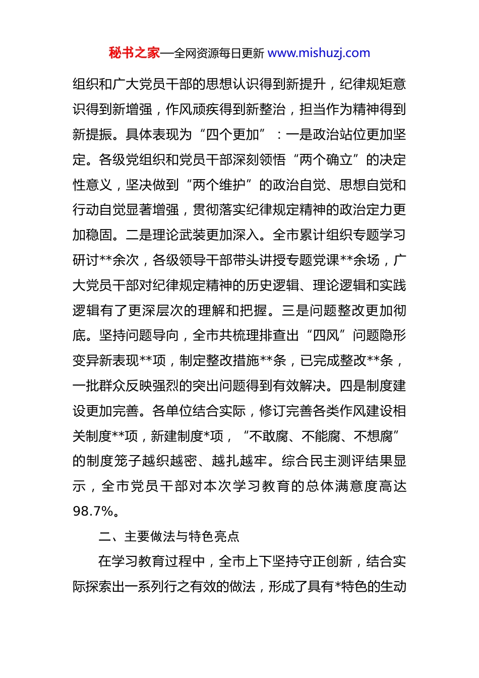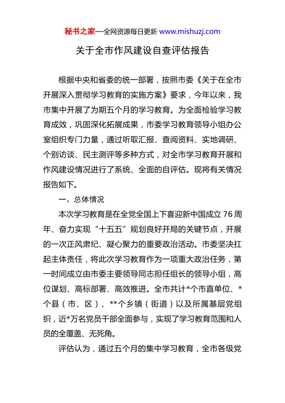 秘书之家—全网资源每日更新 www.mishuzj.com关于全市作风建设自查评估报告 根据中央和省委的统一部署,按照市委《关于在全市开展深入贯彻学习教育的实施方案》要求,今年以来,我市集中开展了为期五个月的学习教育。为全面检验学习教育成效,巩固深化拓展成果,市委学习教育领导小组办公室组织专门力量,通过听取汇报、查阅资料、实地调研、个别访谈、民主测评等多种方式,对全市学习教育开展和作风建设情况进行了系统、全面的自评估。现将有关情况报告如下。一、总体情况本次学习教育是在全党全国上下喜迎新中国成立 76 周年、奋力实现“十五五”规划良好开局的关键节点,开展的一次正风肃纪、凝心聚力的重要政治活动。市委坚决扛起主体责任,将此次学习教育作为一项重大政治任务,第一时间成立由市委主要领导同志担任组长的领导小组,高位谋划、高标部署、高效推进。全市共计*个市直单位、*个县(市、区)、**个乡镇(街道)以及所属基层党组织,近*万名党员干部全面参与,实现了学习教育范围和人员的全覆盖、无死角。评估认为,通过五个月的集中学习教育,全市各级党秘书之家—全网资源每日更新 www.mishuzj.com组织和广大党员干部的思想认识得到新提升,纪律规矩意识得到新增强,作风顽疾得到新整治,担当作为精神得到新提振。具体表现为“四个更加”:一是政治站位更加坚定。各级党组织和党员干部深刻领悟“两个确立”的决定性意义,坚决做到“两个维护”的政治自觉、思想自觉和行动自觉显著增强,贯彻落实纪律规定精神的政治定力更加稳固。二是理论武装更加深入。全市累计组织专题学习研讨**余次,各级领导干部带头讲授专题党课**余场,广大党员干部对纪律规定精神的历史逻辑、理论逻辑和实践逻辑有了更深层次的理解和把握。三是问题整改更加彻底。坚持问题导向,全市共梳理排查出“四风”问题隐形变异新表现**项,制定整改措施**条,已完成整改**条,一批群众反映强烈的突出问题得到有效解决。四是制度建设更加完善。各单位结合实际,修订完善各类作风建设相关制度**项,新建制度*项,“不敢腐、不能腐、不想腐”的制度笼子越织越密、越扎越牢。综合民主测评结果显示,全市党员干部对本次学习教育的 总体满意度高达98.7%。二、主要做法与特色亮点在学习教育过程中,全市上下坚持守正创新,结合实际探索出一系列行之有效的做法,形成了具有*特色的生动秘书之家—全网资源每日更新 www.mishuzj.com实践。(一)坚持“高位引领”,在组织领导上“扣紧责任链”。市委常委会先后*次专题研究学习教育工作,市委主要领导同志亲自审定方案、亲自部署动员、亲自督导检查,为全市作出了示范、树立了标杆。建立市级领导联系点制度,*位市级领导分别联系*个县(市、区)和*个重点单位,深入一线指导推动,解决实际问题*余个。市委学习教育领导小组办公室发挥牵头抓总作用,建立“一周一调度、半月一通报、一月一总结”工作机制,编发工作简报*期,确保了各项任务落地有声。(二)坚持“精准滴灌”,在学习研讨上“激活思想源”。一是原原本本“学”。组织全市党员干部重温纪律规定,深入学习《习近平关于加强党的作风建设论述摘编》等权威读本,确保学深悟透、入脑入心。二是专题研讨“思”。围绕“作风建设永远在路上”“新时代如何保持清正廉洁的政治本色”等主题,分层级、分领域开展专题研讨,引导党员干部在思想碰撞中深化认识。三是警示教育“醒”。组织观看警示教育片《作风之堤毁于蚁穴》,通报剖析我市近年来查处的*起违反纪律规定精神典型案例,用身边事教育身边人,让党员干部知敬畏、存戒惧、守底线。秘书之家—全网资源每日更新 www.mishuzj.com(三)坚持“靶向整治”,在查纠并举上“亮出组合拳”。一是全面自查自纠。各单位对照“四风”问题新动向新表现,深入开展“六查六看”,建立问题清单、责任清单、整改清单,实行销号管理。二是开展专项治理。针对违规吃喝、违规收送礼品礼金、违规配备使用公车等顽瘴痼疾,在全市范围内部署开展了为期三个月的专项整治行动,查处相关问题*起,处理*人,释放了越往后执纪越严的强烈信号。三是畅通监督渠道。在市纪委监...