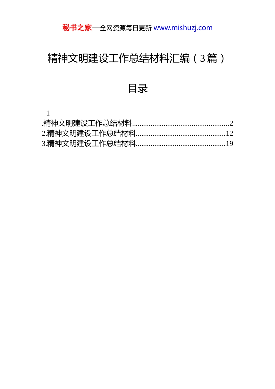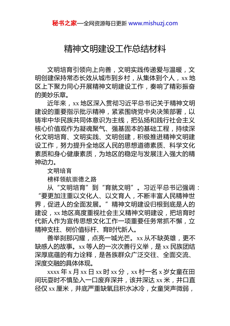 秘书之家—全网资源每日更新 www.mishuzj.com精神文明建设工作总结材料汇编(3 篇)目录1.精神文明建设工作总结材料....................................................22.精神文明建设工作总结材料................................................123.精神文明建设工作总结材料................................................19秘书之家—全网资源每日更新 www.mishuzj.com精神文明建设工作总结材料文明培育引领向上向善,文明实践传递爱与温暖,文明创建保持常态长效从城市到乡村,从集体到个人,xx 地区上下聚力同心开展精神文明建设工作,奏响了精彩振奋的美妙乐章。近年来,xx 地区深入贯彻习近平总书记关于精神文明建设的重要指示批示精神,紧紧围绕党中央决策部署,以铸牢中华民族共同体意识为主线,把弘扬和践行社会主义核心价值观作为凝魂聚气、强基固本的基础工程,持续深化文明培育、文明实践、文明创建,积极推进精神文明建设工作,努力提升全地区人民的思想道德素质、科学文化素质和身心健康素质,为地区的稳定与发展注入强大的精神动力。文明培育榜样领航崇德之路从“文明培育”到“育就文明”。习近平总书记强调:“要更加注重以文化人、以文育人,不断丰富人民精神世界,促进人的全面发展。”精神文明建设归根到底是人的建设,xx 地区高度重视社会主义精神文明建设,把培育时代新人作为宣传思想文化工作一项重要任务常抓不懈,立精神支柱、树价值标杆、育时代新人。善举刹那闪耀,点亮一城光芒。xx 从不缺英雄,更不缺感人的故事。xx 等人的一次次善行义举,是 xx 民族团结深厚底蕴的有力诠释,是各族群众广泛交往、全面交流、深度交融的具体体现。xxxx 年 x 月 xx 日 xx 时 xx 分,xx 村一名 x 岁女童在田间玩耍时不慎坠入一口废弃深井,该井深达 xx 米,井口直径仅 xx 厘米,井底严重缺氧且积水冰冷,女童哭声微弱,秘书之家—全网资源每日更新 www.mishuzj.com生命危在旦夕。女童母亲发现后立即报警,但因井口狭窄救援难度极大,现场一度陷入僵局。xx 不顾危险,主动请缨,在 xx 米深井救出 x 岁儿童,不仅展现了过硬的专业素养和临危不乱的心理素质,更诠释了“人民公安为人民”的初心使命。xx 以血肉之躯为生命托底,用实际行动践行了新时代辅警的责任担当,诠释了人间大爱,她的事迹被全国各族人民交口称赞。借楷模之力量,引众人共前行。xx 地区注重挖掘、培育身边先进典型、树立先锋导向,在全社会弘扬道德模范高尚品格,持续开展道德模范、“身边好人”“新时代好少年”等宣传推广活动。全地区 x 人荣获全国道德模范、xx人入选“中国好人榜”、x 人荣获全国“新时代好少年”,累计培育各级各类道德模范、“身边好人”“新时代好少年”等共 xxx 人次。xxx 等一大批立得住、传得开、学得来的“xx 榜样”,为城市文明注入了磅礴力量。xxxx 年 x 月,xx 县组织道德模范、文明家庭等 xx 名先进典型代表赴喀什开展“石榴花·共同成长行动”交流交融活动。自治区道德模范 xx 在参观铸牢中华民族共同体意识教育基地后深有感触地说:“走进这座展馆,仿佛穿越了时空长廊。一件件承载记忆的展品、一段段震撼人心的历史,让我深刻体会到,中华民族共同体意识是各民族在长期交往交流交融中凝聚而成的精神纽带。作为一名道德模范,我更要当好民族团结的践行者,用实际行动带动身边人,让中华民族共同体意识深深扎根每个人心中。”xx 县挖掘 xx 跨越 xx 年的守诺故事,并组织宣讲员以“国旗下宣讲+入户宣讲”形式,向各族干部群众讲述了“信守承诺、团结互助”精神品格的典型事迹,深化社会主义核心价值观与民族团结教育,用榜样力量感召群众、浸润人心。育人重在铸魂,培德先植根基。xx 地区注重加强未成年人思想道德建设,积极挖掘、培育“新时代好少年”,把培育和践行社会主义核心价值观贯穿文明校园创秘书之家—全网资源每日更新 www.mishuzj.com建全过程。以“我们的节日”“开学第一课”为载体,不断深化“扣好人生第一粒扣子”主题实践活动。全地区各中小学校常态化开展“童心向党”“向国旗...