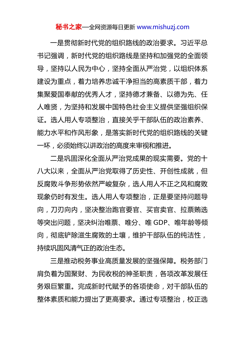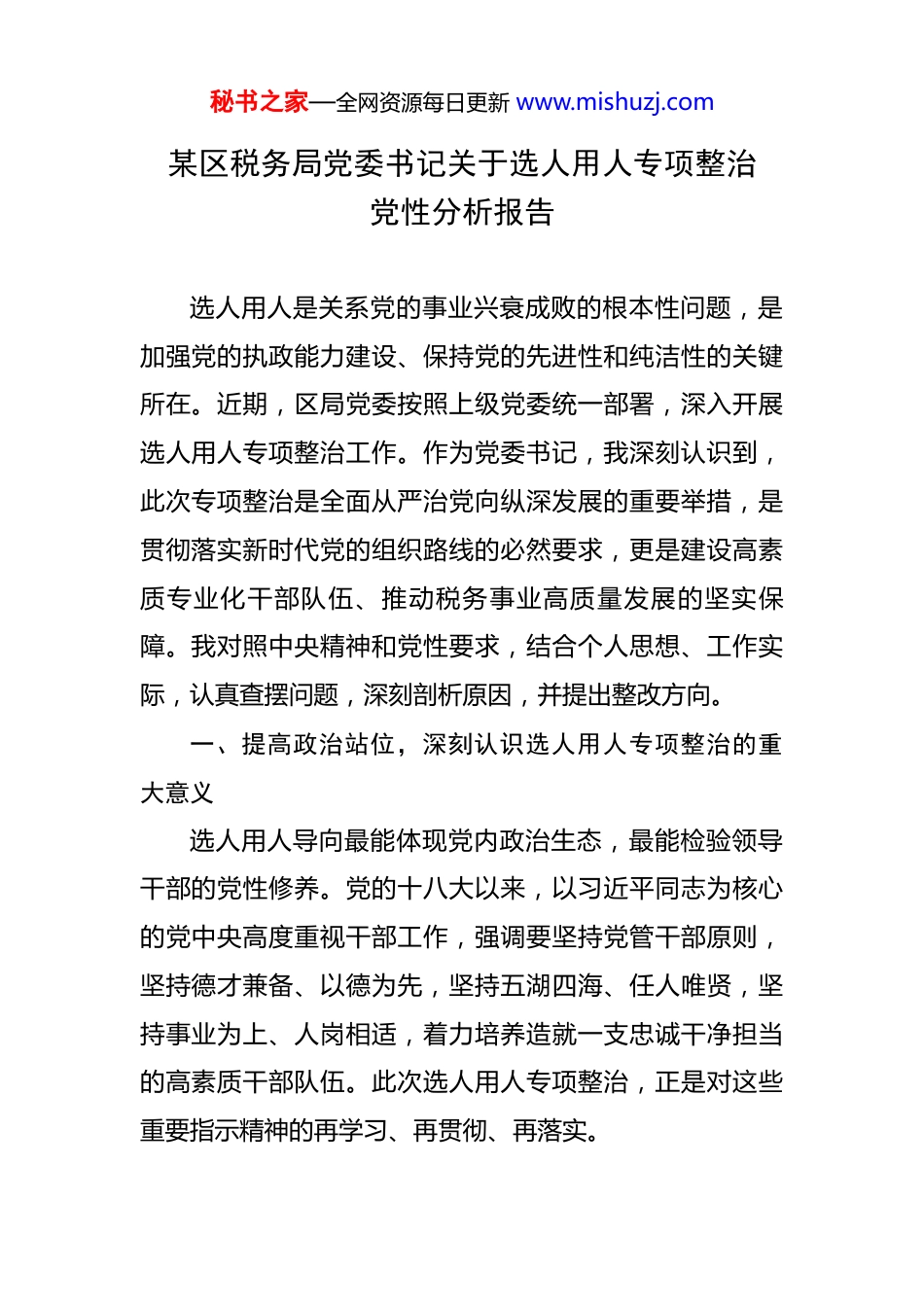 秘书之家—全网资源每日更新 www.mishuzj.com某区税务局党委书记关于选人用人专项整治党性分析报告 选人用人是关系党的事业兴衰成败的根本性问题,是加强党的执政能力建设、保持党的先进性和纯洁性的关键所在。近期,区局党委按照上级党委统一部署,深入开展选人用人专项整治工作。作为党委书记,我深刻认识到,此次专项整治是全面从严治党向纵深发展的重要举措,是贯彻落实新时代党的组织路线的必然要求,更是建设高素质专业化干部队伍、推动税务事业高质量发展的坚实保障。我对照中央精神和党性要求,结合个人思想、工作实际,认真查摆问题,深刻剖析原因,并提出整改方向。一、提高政治站位,深刻认识选人用人专项整治的重大意义选人用人导向最能体现党内政治生态,最能检验领导干部的党性修养。党的十八大以来,以习近平同志为核心的党中央高度重视干部工作,强调要坚持党管干部原则,坚持德才兼备、以德为先,坚持五湖四海、任人唯贤,坚持事业为上、人岗相适,着力培养造就一支忠诚干净担当的高素质干部队伍。此次选人用人专项整治,正是对这些重要指示精神的再学习、再贯彻、再落实。秘书之家—全网资源每日更新 www.mishuzj.com一是贯彻新时代党的组织路线的政治要求。习近平总书记强调,新时代党的组织路线是坚持和加强党的全面领导,坚持以人民为中心,坚持全面从严治党,以组织体系建设为重点,着力培养忠诚干净担当的高素质干部,着力集聚爱国奉献的优秀人才,坚持德才兼备、以德为先、任人唯贤,为坚持和发展中国特色社会主义提供坚强组织保证。选人用人专项整治,直接关乎干部队伍的政治素养、能力水平和作风形象,是落实新时代党的组织路线的关键一环,必须始终以讲政治的高度来审视和推进。二是巩固深化全面从严治党成果的现实需要。党的十八大以来,全面从严治党取得了历史性、开创性成就,但反腐败斗争形势依然严峻复杂,选人用人不正之风和腐败现象仍时有发生。选人用人专项整治,正是要坚持问题导向,刀刃向内,坚决整治跑官要官、买官卖官、拉票贿选等突出问题,坚决纠治唯票、唯分、唯 GDP、唯年龄等倾向,彻底铲除滋生腐败的土壤,维护干部队伍的纯洁性,持续巩固风清气正的政治生态。三是推动税务事业高质量发展的坚强保障。税务部门肩负着为国聚财、为民收税的神圣职责,各项改革发展任务艰巨繁重。完成新时代赋予的各项使命,对干部队伍的整体素质和能力提出了更高要求。通过专项整治,校正选秘书之家—全网资源每日更新 www.mishuzj.com人用人偏差,真正把想干事、能干事、干成事的优秀干部选出来、用起来,把政治强、业务精、作风硬的干部配起来,才能激发队伍活力,汇聚强大合力,为税务事业高质量发展提供坚实的组织和人才支撑。作为区局党委书记,我深感责任重大,必须以身作则、以上率下,带头进行党性分析,带头查摆整改问题,以实际行动带动选人用人工作步入规范化、科学化轨道。二、对照党性要求,认真查摆选人用人方面存在的突出问题在此次专项整治中,我对照党章党规,对照新时代党的组织路线,对照中央和上级党委关于选人用人的各项要求,深入开展批评与自我批评,认真反思在选人用人工作中可能存在的偏差和不足。我认识到,尽管区局党委在选人用人上总体是坚持原则、注重公道的,但仍存在一些值得警醒和改进的问题。一是政治把关的精细化程度有待提升。对干部的政治素质考察,虽然在程序上严格执行,但在实际操作中,有时过于依赖档案材料和组织推荐,对干部在重大政治考验、关键时刻的表现,以及日常思想言行、朋友圈等方面的考察还不够深入、不够全面。存在“重业务、轻政治”的潜在倾向,对少数干部政治敏锐性不强、政治鉴别力不秘书之家—全网资源每日更新 www.mishuzj.com高的问题未能及时发现和纠正,甚至可能对“两面人”现象缺乏足够警惕。作为党委书记,对此负有第一责任,未能完全做到政治上的“火眼金睛”。二是干部队伍结构优化调整的力度不足。在干部选拔任用中,有时过多考虑资历和现有岗位匹配度,对干部的专业结构、年龄梯队、学历层次等整体性、系统性规划有所欠缺。在激发年轻干部活力、促进多岗位锻炼、培养复合...