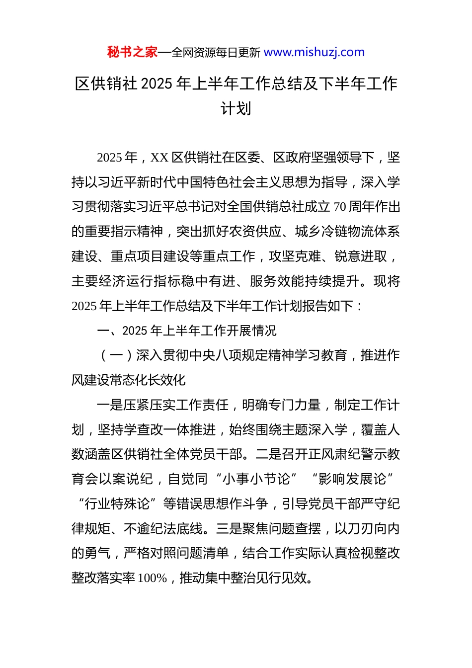 秘书之家—全网资源每日更新 www.mishuzj.com区供销社 2025 年上半年工作总结及下半年工作计划 2025 年,XX 区供销社在区委、区政府坚强领导下,坚持以习近平新时代中国特色社会主义思想为指导,深入学习贯彻落实习近平总书记对全国供销总社成立 70 周年作出的重要指示精神,突出抓好农资供应、城乡冷链物流体系建设、重点项目建设等重点工作,攻坚克难、锐意进取,主要经济运行指标稳中有进、服务效能持续提升。现将2025 年上半年工作总结及下半年工作计划报告如下:一、2025 年上半年工作开展情况(一)深入贯彻中央八项规定精神学习教育,推进作风建设常态化长效化 一是压紧压实工作责任,明确专门力量,制定工作计划,坚持学查改一体推进,始终围绕主题深入学,覆盖人数涵盖区供销社全体党员干部。二是召开正风肃纪警示教育会以案说纪,自觉同“小事小节论”“影响发展论”“行业特殊论”等错误思想作斗争,引导党员干部严守纪律规矩、不逾纪法底线。三是聚焦问题查摆,以刀刃向内的勇气,严格对照问题清单,结合工作实际认真检视整改整改落实率 100%,推动集中整治见行见效。秘书之家—全网资源每日更新 www.mishuzj.com(二)落实全面从严治党,强化廉洁高效的组织保障坚持把全面从严治党贯穿于我社发展的全过程,落实党风廉政建设责任制,严格执行“三会一课”和民主生活会制度。通过定期开展廉政教育,进一步增强本社党员干部的政治意识和纪律观念。完善内部监督与考核体系,推动党建与业务工作深度融合,确保我社发展沿着健康、廉洁的轨道运行。党员干部在重大项目推进和农业服务工作中充分发挥先锋模范作用,为 XX 供销社的高效发展提供了坚强组织保障。 (三)创新集采直供模式,推进农资“直达终端”一是依托供销合作社系统组织体系和经营网络,加强与乡(镇)政府及村集体对接,通过召开农资集采直供交流会、组织供需对接活动,推动农资经营企业与种植大户、家庭农场、小农户建立“点对点”直供关系,实现农资从仓库直接配送至村级网点或农户田间地头,2025 年上半年,XX农资公司通过集采直供模式销售化肥 2200 吨,同比增长10%。二是制定农资企业集采准入标准,对企业经营合法性、物流能力、服务水平、履约诚信开展多维度评价并动态考核。目前已与江西丰安农业发展有限公司、抚州卓越农业发展有限公司、抚州友农农业发展有限责任公司等 3 家骨干企业签订授权书,建立长期合作机制,并通过统一标准、秘书之家—全网资源每日更新 www.mishuzj.com联合议价,实现农资采购价格较市场平均水平降低 8.3%。同时注重引入新企业参与竞争,充分激发市场活力。(四)扎实推进城乡冷链物流体系建设,助力农产品流通提速 一是 XX 冷链物流园项目于 2025 年 1 月正式迈入运营阶段,园区招商工作稳步推进,各功能区块出租率持续攀升。其中,冷库可出租面积 8890.77㎡,具备两万吨货物存储能力,其中低温库已实现 100%满库状态。圣农集团、陆恒集团等头部企业及本土冻品商户共 13 家已扎根于此,累计到货量达 12097 吨,累计出库 7697 吨;交易市场可租面积 10201.22㎡,现已签约商户 11 户(涵盖 70 间商铺),签约面积 6127.19㎡,招商率达 60.06%;分拣中心成功引入中通、圆通、申通三家快递龙头企业,物流集聚效应得到显著增强;中央厨房共三层,可出租面积 7996.38㎡,已签约源利宏豆制品加工企业、临强食品加工企业,出租率达到100%;办公公寓与沿街商业的招商工作也在逐步推进中。二是深入推进“县域产地中心冷库+田间地头移动冷藏设施”试点建设,积极引导农民专业合作社、家庭农场、村集体经济组织等参与建设村级预冷库、低温库。通过采取“供销社+物流园+企业”的模式,近日,在唱凯镇江西三秘书之家—全网资源每日更新 www.mishuzj.com菜智慧农业有限公司落户 2 套移动冷库。目前,全区共建成各类冷链设施 156 个,其中农民专业合作社预冷库 48 个,配备冷链运输车辆 60 余辆,预计实现年冷链物流仓储周转能力 24 万吨,为高品质农产品“出村进城”提供了有力保障。(五)专项债申报提质提速,项目争资实现突破我...
