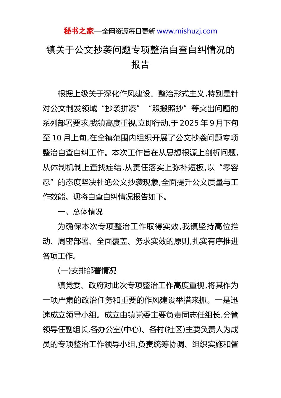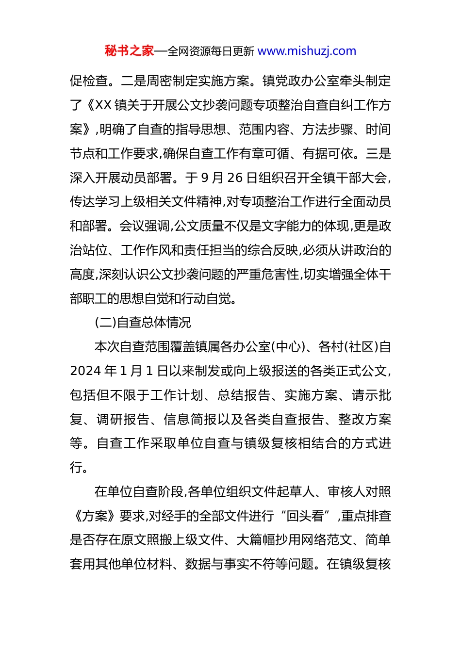 秘书之家—全网资源每日更新 www.mishuzj.com镇关于公文抄袭问题专项整治自查自纠情况的报告 根据上级关于深化作风建设、整治形式主义,特别是针对公文制发领域“抄袭拼凑”“照搬照抄”等突出问题的系列部署要求,我镇高度重视,立即行动,于 2025 年 9 月下旬至 10 月上旬,在全镇范围内组织开展了公文抄袭问题专项整治自查自纠工作。本次工作旨在从思想根源上剖析问题,从体制机制上查找症结,从责任落实上弥补短板,以“零容忍”的态度坚决杜绝公文抄袭现象,全面提升公文质量与工作效能。现将自查自纠情况报告如下。一、总体情况为确保本次专项整治工作取得实效,我镇坚持高位推动、周密部署、全面覆盖、务求实效的原则,扎实有序推进各项工作。(一)安排部署情况镇党委、政府对此次专项整治工作高度重视,将其作为一项严肃的政治任务和重要的作风建设举措来抓。一是迅速成立领导小组。成立由镇党委主要负责同志任组长,分管领导任副组长,各办公室(中心)、各村(社区)主要负责人为成员的专项整治工作领导小组,负责统筹协调、组织实施和督秘书之家—全网资源每日更新 www.mishuzj.com促检查。二是周密制定实施方案。镇党政办公室牵头制定了《XX 镇关于开展公文抄袭问题专项整治自查自纠工作方案》,明确了自查的指导思想、范围内容、方法步骤、时间节点和工作要求,确保自查工作有章可循、有据可依。三是深入开展动员部署。于 9 月 26 日组织召开全镇干部大会,传达学习上级相关文件精神,对专项整治工作进行全面动员和部署。会议强调,公文质量不仅是文字能力的体现,更是政治站位、工作作风和责任担当的综合反映,必须从讲政治的高度,深刻认识公文抄袭问题的严重危害性,切实增强全体干部职工的思想自觉和行动自觉。(二)自查总体情况本次自查范围覆盖镇属各办公室(中心)、各村(社区)自2024 年 1 月 1 日以来制发或向上级报送的各类正式公文,包括但不限于工作计划、总结报告、实施方案、请示批复、调研报告、信息简报以及各类自查报告、整改方案等。自查工作采取单位自查与镇级复核相结合的方式进行。在单位自查阶段,各单位组织文件起草人、审核人对照《方案》要求,对经手的全部文件进行“回头看”,重点排查是否存在原文照搬上级文件、大篇幅抄用网络范文、简单套用其他单位材料、数据与事实不符等问题。在镇级复核秘书之家—全网资源每日更新 www.mishuzj.com阶段,专项整治工作领导小组办公室组织专门力量,随机抽查了各单位上报的重点文件共计 320 余份,并利用技术手段,将其与网络公开信息、过往文件库中的内容进行比对分析力求排查无死角、全覆盖。(三)主要结论经过为期半个月的全面自查与重点复核,我镇未发现主观恶意、情节严重的公文抄袭或剽窃问题。全镇公文制发工作总体上能够做到符合规范、内容真实、切合实际。这表明,近年来我镇持续加强作风建设、狠抓公文管理取得了一定成效。然而,在本次深入排查过程中,也暴露出一些深层次、倾向性的问题,尤其是在体制机制和责任落实层面,仍存在薄弱环节和改进空间。这些问题虽未构成明显的“抄袭”,但却为“抄袭拼凑”现象的滋生提供了土壤,是需要我们高度警惕并着力解决的“亚健康”状态。二、存在问题自查发现,我镇公文质量管理虽然守住了“不抄袭”的底线,但距离“高质量”的目标尚有差距。问题表象的背后,是体制机制和责任落实方面存在的深层症结。这些问题若不加以解决,形式主义顽疾极易反弹,公文抄袭的风险依然存在。(一)责任传导机制存在“压力递减”现象,末端落实尚秘书之家—全网资源每日更新 www.mishuzj.com有温差上级单位对公文质量的要求越来越高,镇党委、政府层面也反复强调、常抓不懈,但在责任传导的链条上,存在着“上游热、中游温、下游冷”的“压力递减”现象。具体表现为:一是责任意识层层衰减。镇主要领导和分管领导对重要文稿亲自把关,要求严格。但这种压力传导至各办公室(中心)负责人和具体承办人时,强度有所减弱。部分中层干部满足于“传达了、布置了”,对文稿质量的把关有时仅停留在宏观层面,未能真正履行好“第一把关人”的职责。而个别年轻干部或业务骨干,由于日常事务性工作繁重,或认为公文写作是“软...
