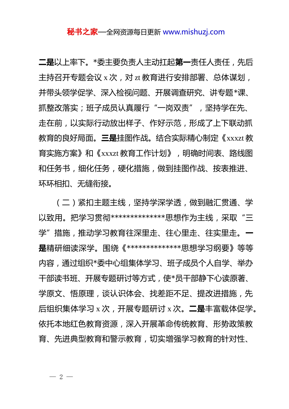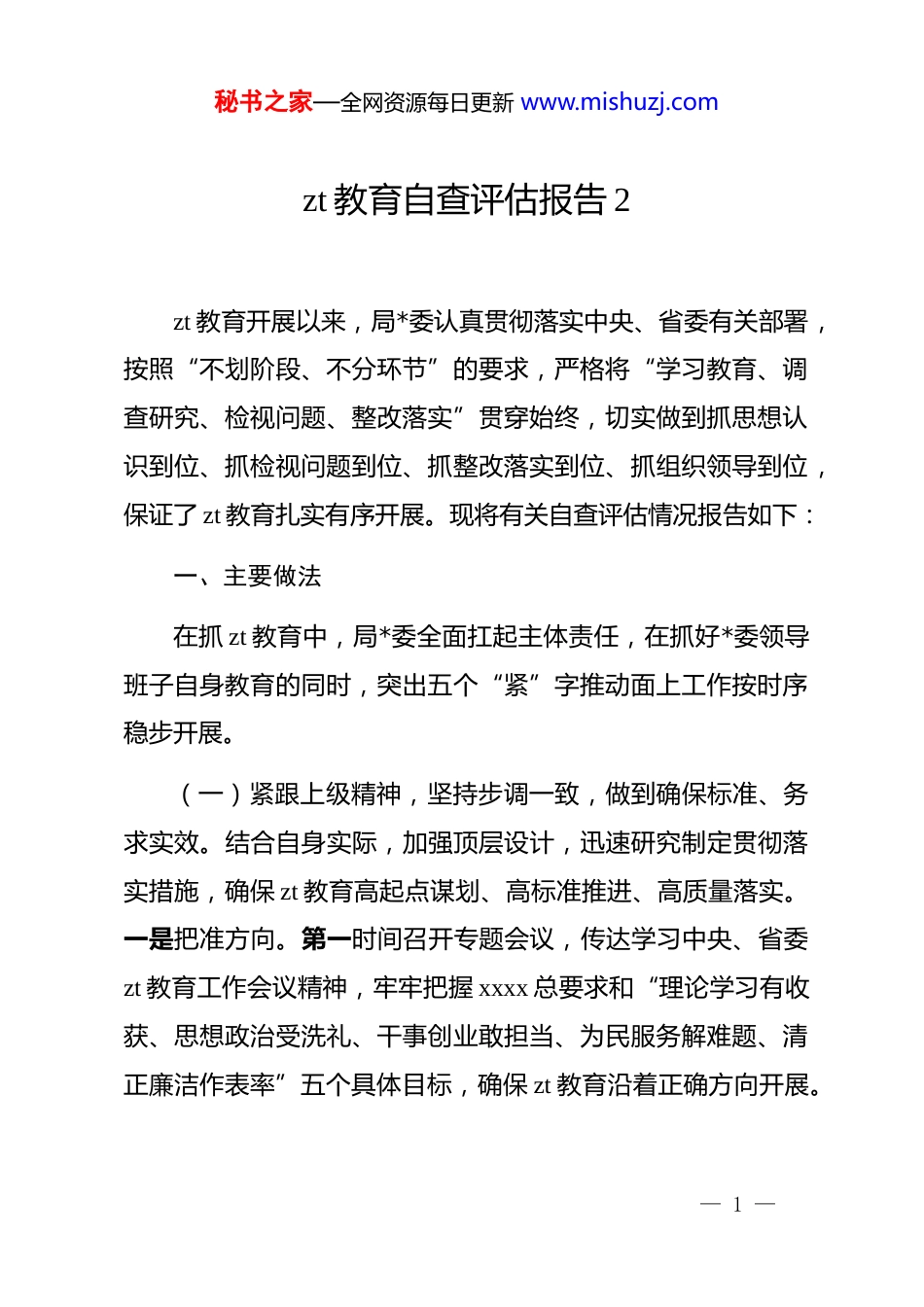 秘书之家—全网资源每日更新 www.mishuzj.comzt 教育自查评估报告 2zt 教育开展以来,局*委认真贯彻落实中央、省委有关部署,按照“不划阶段、不分环节”的要求,严格将“学习教育、调查研究、检视问题、整改落实”贯穿始终,切实做到抓思想认识到位、抓检视问题到位、抓整改落实到位、抓组织领导到位,保证了 zt 教育扎实有序开展。现将有关自查评估情况报告如下:一、主要做法在抓 zt 教育中,局*委全面扛起主体责任,在抓好*委领导班子自身教育的同时,突出五个“紧”字推动面上工作按时序稳步开展。(一)紧跟上级精神,坚持步调一致,做到确保标准、务求实效。结合自身实际,加强顶层设计,迅速研究制定贯彻落实措施,确保 zt 教育高起点谋划、高标准推进、高质量落实。一是把准方向。第一时间召开专题会议,传达学习中央、省委zt 教育工作会议精神,牢牢把握 xxxx 总要求和“理论学习有收获、思想政治受洗礼、干事创业敢担当、为民服务解难题、清正廉洁作表率”五个具体目标,确保 zt 教育沿着正确方向开展。— 1 —秘书之家—全网资源每日更新 www.mishuzj.com二是以上率下。*委主要负责人主动扛起第一责任人责任,先后主持召开专题会议 x 次,对 zt 教育进行安排部署、总体谋划,并带头领学促学、深入检视问题、开展调查研究、讲专题*课、抓整改落实;班子成员认真履行“一岗双责”,坚持学在先、走在前,以实际行动放出样子、作好示范,形成了上下联动抓教育的良好局面。三是挂图作战。结合实际精心制定《xxxzt 教育实施方案》和《xxxzt 教育工作计划》,明确时间表、路线图和任务书,细化任务,硬化措施,做到挂图作战、按表推进、环环相扣、无缝衔接。(二)紧扣主题主线,坚持学深学透,做到融汇贯通、学以致用。把学习贯彻**************思想作为主线,采取“三学”措施,推动学习教育往深里走、往心里走、往实里走。一是精研细读深学。围绕《**************思想学习纲要》等等内容,通过组织*委中心组集体学习、班子成员个人自学、举办干部读书班、开展专题研讨等方式,使*员干部静下心读原著、学原文、悟原理,谈认识体会、找差距不足、提改进措施,先后组织集体学习 x 次,开展专题研讨 x 次。二是丰富载体促学。依托本地红色教育资源,深入开展革命传统教育、形势政策教育、先进典型教育和警示教育,切实增强学习教育的针对性、— 2 —秘书之家—全网资源每日更新 www.mishuzj.com实效性和感染力。zt 教育期间,共有 xx 人(次)接受了革命传统教育、形势政策教育、先进典型教育和警示教育。三是强化指导督学。*委主要负责人和班子成员严格督学,采取个别访谈、座谈交流、现场提问、随机抽查等方式,“一对一”“面对面”谈话了解学习情况,及时发现问题,防止跑偏走向。依托“xxapp”,组织*员干部 xxx 人(次)进行网上答题测试,有力推动了学习走深走实。(三)紧贴工作实际,坚持深入调研,做到求真务实、更接地气。把解决问题、推动工作作为调查研究的出发点和落脚点,通过深入调研摸清情况、厘清问题,提出对策措施。一是精选课题。以推动工作为要务、以群众利益为导向、以*的建设为根本,聚焦突出问题,确定强化*员干部理论武装、防范化解重大风险等 x 个针对性强的调研专题,由班子成员带队,组成 x个调研组深入基层一线找问题、查原因、定措施。二是摸清实情。严格落实“每周下基层不少于 1 天”的要求,先后 xx 次到一些工作难度大、群众反映强烈、带有普遍性问题的地方听民意、查实情、定措施,形成调研报告 xx 篇。三是转化成果。召开调研成果交流会,针对调研中发现的普遍性问题,拿出有效对策措施,推动调研成果转化。截至目前,调研发现的 xx 类 xx— 3 —秘书之家—全网资源每日更新 www.mishuzj.com个问题中已有 xx 个解决到位,调研成果转化率达 xx%。在调研的基础上,*委主要负责人以“xxx”为题,带头为全体*员干部讲专题*课,其他班子成员到分管部门和联系单位讲专题*课 xx场。(四)紧抓检视问题,坚持深挖细查,做到刀刃向内、自我革命。以正视问题的自觉和刀刃向内的勇气,找准...