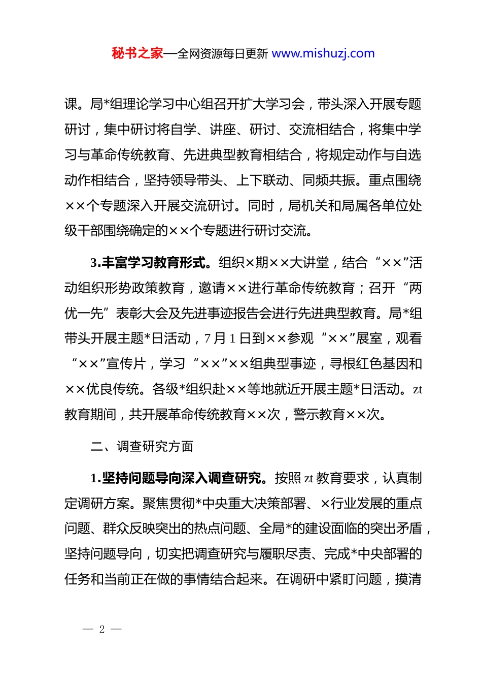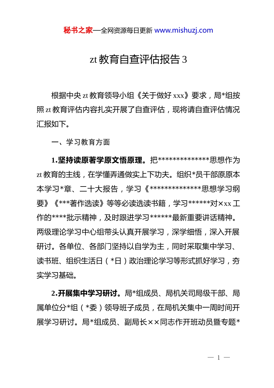秘书之家—全网资源每日更新 www.mishuzj.comzt 教育自查评估报告 3根据中央 zt 教育领导小组《关于做好 xxx》要求,局*组按照 zt 教育评估内容扎实开展了自查评估,现将请自查评估情况汇报如下。一、学习教育方面1.坚持读原著学原文悟原理。把**************思想作为zt 教育的主线,在学懂弄通做实上下功夫。组织*员干部原原本本学习*章、二十大报告,学习《**************思想学习纲要》《***著作选读》等等必读选读书籍,学习******对×xx 工作的****批示精神,及时跟进学习******最新重要讲话精神。两级理论学习中心组带头认真开展学习,深学细悟,深入开展研讨。各单位、各部门坚持以自学为主,同时采取集中学习、读书班、组织生活日(*日)政治理论学习等形式抓好学习,夯实学习基础。2.开展集中学习研讨。局*组成员、局机关司局级干部、局属单位分*组(*委)领导班子成员,在局机关集中一周时间开展学习研讨。局*组成员、副局长××同志作开班动员暨专题*— 1 —秘书之家—全网资源每日更新 www.mishuzj.com课。局*组理论学习中心组召开扩大学习会,带头深入开展专题研讨,集中研讨将自学、讲座、研讨、交流相结合,将集中学习与革命传统教育、先进典型教育相结合,将规定动作与自选动作相结合,坚持领导带头、上下联动、同频共振。重点围绕××个专题深入开展交流研讨。同时,局机关和局属各单位处级干部围绕确定的××个专题进行研讨交流。3.丰富学习教育形式。组织×期××大讲堂,结合“××”活动组织形势政策教育,邀请××进行革命传统教育;召开“两优一先”表彰大会及先进事迹报告会进行先进典型教育。局*组带头开展主题*日活动,7 月 1 日到××参观“××”展室,观看“××”宣传片,学习“××”××组典型事迹,寻根红色基因和××优良传统。各级*组织赴××等地就近开展主题*日活动。zt教育期间,共开展革命传统教育××次,警示教育××次。二、调查研究方面1.坚持问题导向深入调查研究。按照 zt 教育要求,认真制定调研方案。聚焦贯彻*中央重大决策部署、×行业发展的重点问题、群众反映突出的热点问题、全局*的建设面临的突出矛盾,坚持问题导向,切实把调查研究与履职尽责、完成*中央部署的任务和当前正在做的事情结合起来。在调研中紧盯问题,摸清— 2 —秘书之家—全网资源每日更新 www.mishuzj.com实情,分析症结,提出了解决问题、改进工作的思路和办法措施。2.注重从实际出发调查研究。紧密结合履职实际,局*组成员带头分别围绕××个课题进行调研。亲自带队赴××进行现场调研,采取“点”“线”“面”结合,赴××等地,针对×××干部职工思想动态和意识形态领域建设到基层调研,及时了解掌握干部职工思想动态。针对×××干部队伍建设情况进行调研,对基层反映的问题进行了全面梳理,就如何解决分别召开了×次座谈会,听取了相关意见建议。局属各单位结合各自实际,分别制定了调研方案,领导班子成员带头赴×企业和有关单位开展调研。zt 教育期间,局*组成员围绕××个课题,深入××单位部门开展调研,局属各单位结合自身实际,开展调研课题××个。3.讲好专题*课。在学习调研的基础上,各级领导班子成员认真撰写*课提纲,为*员干部讲授*课。局*组成员围绕×个专题讲授*课×次,局属各单位和机关各部门讲授*课××次。三、检视问题方面1.广泛听取意见建议。zt 教育一开始,局*组就研究确定了— 3 —秘书之家—全网资源每日更新 www.mishuzj.com××条存量问题;利用第一轮巡回指导,通过谈话、问卷、座谈收集梳理了各地区×监管局、各事业单位对局*组和 zt 教育开展的××条意见建议;通过集中学习研讨,征集了机关司局级干部、地区×监管局和事业单位领导班子成员对局*组的××条意见建议;在局机关设置意见箱,公布意见征集电子邮箱、电话、传真,广泛征集广大*员群众意见;突出为民服务解难题的zt 教育目标,专门向××服务对象单位发函征求征求对局*组及*组成员的意见建议。zt 教育期间共收集局*组意见建议××条,*组成员意见建议××条。2.自觉对标对表查摆问题。在学习调研和征求意见的基础上,局*组带...