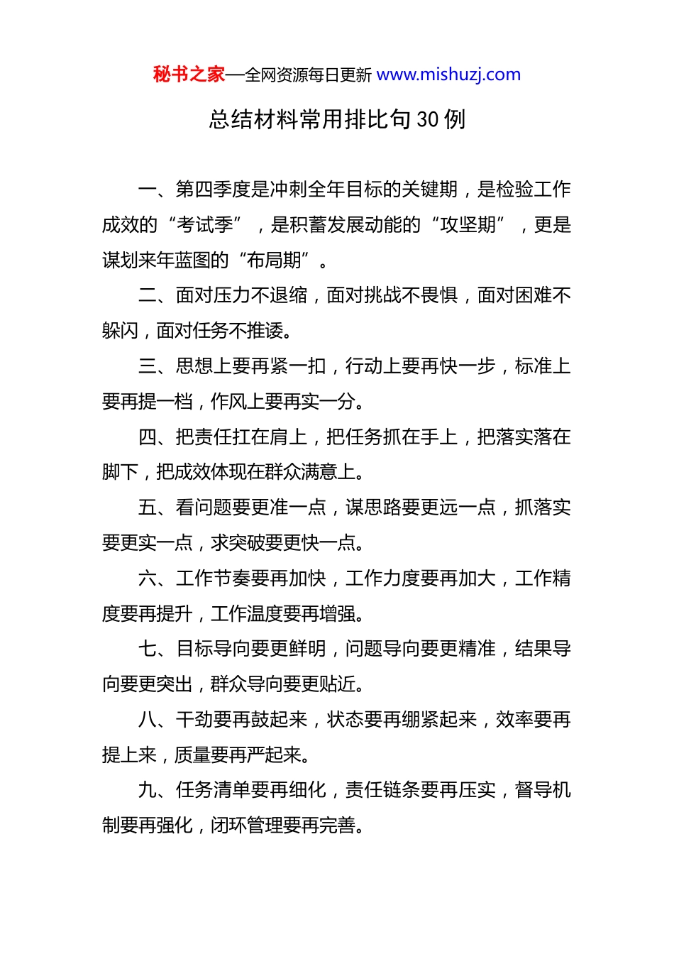 秘书之家—全网资源每日更新 www.mishuzj.com总结材料常用排比句 30 例 一、第四季度是冲刺全年目标的关键期,是检验工作成效的“考试季”,是积蓄发展动能的“攻坚期”,更是谋划来年蓝图的“布局期”。二、面对压力不退缩,面对挑战不畏惧,面对困难不躲闪,面对任务不推诿。三、思想上要再紧一扣,行动上要再快一步,标准上要再提一档,作风上要再实一分。四、把责任扛在肩上,把任务抓在手上,把落实落在脚下,把成效体现在群众满意上。五、看问题要更准一点,谋思路要更远一点,抓落实要更实一点,求突破要更快一点。六、工作节奏要再加快,工作力度要再加大,工作精度要再提升,工作温度要再增强。七、目标导向要更鲜明,问题导向要更精准,结果导向要更突出,群众导向要更贴近。八、干劲要再鼓起来,状态要再绷紧起来,效率要再提上来,质量要再严起来。九、任务清单要再细化,责任链条要再压实,督导机制要再强化,闭环管理要再完善。秘书之家—全网资源每日更新 www.mishuzj.com十、想得更深一点,看得更远一点,谋得更全一点,做得更细一点。十一、迎难而上要有锐气,攻坚克难要有胆气,破题突围要有底气,善作善成要有志气。十二、争分夺秒抓进度,全力以赴保节点,集中精力攻难点,统筹协调破堵点。十三、在一线发现问题,在一线研究问题,在一线推动问题,在一线解决问题。十四、部署要更周密一点,推进要更有力一点,督查要更严格一点,整改要更彻底一点。十五、比作风、比干劲、比成效、比贡献,赛项目、赛进度、赛质量、赛口碑。十六、思想上同心同向,目标上同频共振,行动上同力同行,成果上同创共享。十七、起步就要提速,开局就要争先,过程就要高效,结果就要出彩。十八、事不过夜抓落实,案无积压抓办理,件件有回音,事事有着落。十九、以钉钉子精神抓落实,以绣花功夫促提升,以实干担当树形象,以群众满意论成败。二十、方向不偏、节奏不乱、力度不减、标准不降。秘书之家—全网资源每日更新 www.mishuzj.com二十一、脚步不停歇,劲头不松懈,标准不降低,目标不偏离。二十二、思想认识再深化,责任担当再强化,工作举措再细化,执行效能再提升。二十三、早谋划、快启动、抢进度、保质量,确保各项工作跑出“加速度”。二十四、任务分解到岗,责任明确到人,时限细化到天,督查跟进到事。二十五、一级带着一级干,一级做给一级看,一级对一级负责,一级让一级放心。二十六、看差距找不足,看先进找方向,看短板补弱项,看潜力挖潜能。二十七、在压力中砥砺前行,在挑战中锤炼本领,在奋斗中实现价值,在实干中赢得未来。二十八、用脚步丈量民情,用汗水诠释担当,用实干回应期盼,用业绩检验初心。二十九、既当指挥员,又当战斗员;既挂帅出征,又冲锋在前;既谋全局,又抓细节。三十、以时不我待的紧迫感抓落实,以责无旁贷的使命感担重任,以功成不必在我的境界谋长远,以功成必定有我的担当创实绩。