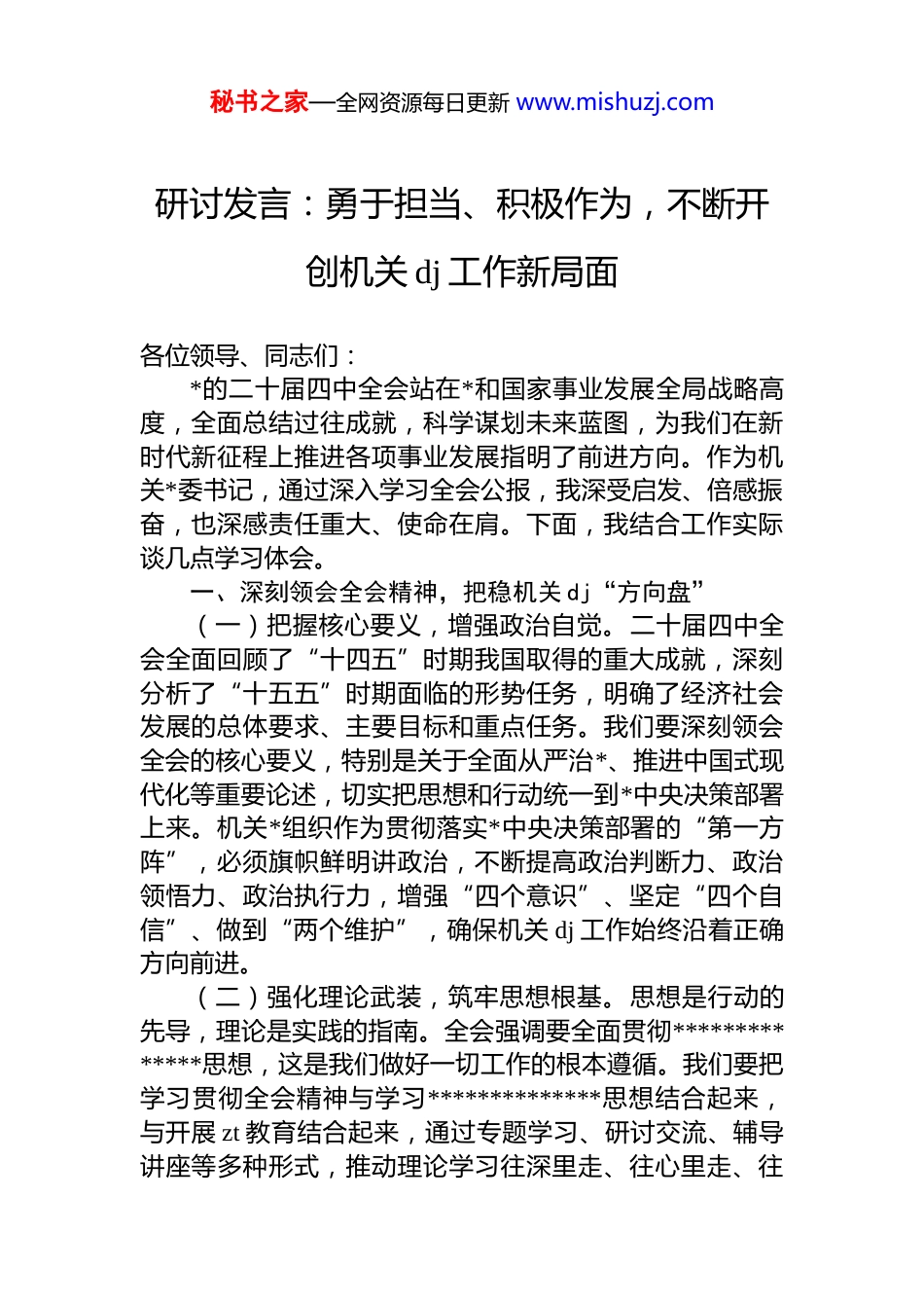 秘书之家—全网资源每日更新 www.mishuzj.com研讨发言:勇于担当、积极作为,不断开创机关 dj 工作新局面各位领导、同志们:*的二十届四中全会站在*和国家事业发展全局战略高度,全面总结过往成就,科学谋划未来蓝图,为我们在新时代新征程上推进各项事业发展指明了前进方向。作为机关*委书记,通过深入学习全会公报,我深受启发、倍感振奋,也深感责任重大、使命在肩。下面,我结合工作实际谈几点学习体会。一、深刻领会全会精神,把稳机关 dj“方向盘”(一)把握核心要义,增强政治自觉。二十届四中全会全面回顾了“十四五”时期我国取得的重大成就,深刻分析了“十五五”时期面临的形势任务,明确了经济社会发展的总体要求、主要目标和重点任务。我们要深刻领会全会的核心要义,特别是关于全面从严治*、推进中国式现代化等重要论述,切实把思想和行动统一到*中央决策部署上来。机关*组织作为贯彻落实*中央决策部署的“第一方阵”,必须旗帜鲜明讲政治,不断提高政治判断力、政治领悟力、政治执行力,增强“四个意识”、坚定“四个自信”、做到“两个维护”,确保机关 dj 工作始终沿着正确方向前进。(二)强化理论武装,筑牢思想根基。思想是行动的先导,理论是实践的指南。全会强调要全面贯彻**************思想,这是我们做好一切工作的根本遵循。我们要把学习贯彻全会精神与学习**************思想结合起来,与开展 zt 教育结合起来,通过专题学习、研讨交流、辅导讲座等多种形式,推动理论学习往深里走、往心里走、往秘书之家—全网资源每日更新 www.mishuzj.com实里走。要充分发挥机关*组织的教育引导作用,引导广大*员干部深刻领悟“两个确立”的决定性意义,自觉用*的创新理论武装头脑、指导实践、推动工作,不断筑牢信仰之基、补足精神之钙、把稳思想之舵。(三)明确目标任务,找准工作定位。全会对“十五五”时期经济社会发展作出了全面部署,为机关 dj 工作提供了广阔的舞台和难得的机遇。我们要围绕全会确定的目标任务,找准机关 dj 工作的切入点和着力点,做到 dj 工作与业务工作深度融合、相互促进。要以高质量 dj 引领高质量发展,引导广大*员干部立足本职岗位,积极担当作为,为实现“十五五”规划目标贡献智慧和力量。同时,要加强对机关 dj 工作的研究和谋划,不断创新工作方式方法,提高机关 dj 工作的针对性和实效性。二、聚焦主责主业,锻造机关 dj“新引擎”(一)加强组织建设,提升基层*组织战斗力。基层*组织是*的全部工作和战斗力的基础。我们要以提升组织力为重点,突出政治功能,加强机关基层*组织建设。要严格落实“三会一课”、主题*日、组织生活会等制度,严肃*内政治生活,增强*内政治生活的政治性、时代性、原则性、战斗性。要加强*员教育管理监督,提高*员素质,发挥*员先锋模范作用。要加强*支部标准化规范化建设,选优配强*支部书记,打造坚强有力的战斗堡垒。同时,要加强对群团组织的领导,支持群团组织依法依章程开展工作,充分发挥群团组织的桥梁和纽带作用。(二)推进作风建设,营造风清气正政治生态。作风建设关系*的形象,关系人心向背,关系*和国家事业兴衰成败。全会强调要持之以恒推进全面从严治*,深入推进新时代*的建设新的伟大工程。我们要以全会精神为指引,持续加强机关作风建设,坚决反对形式主义、官僚主义,树立正确的政绩观和价值观。要加强廉政教育,强化纪律意识和规矩意识,引导广大*员干部自觉遵守 d 的纪律和廉洁秘书之家—全网资源每日更新 www.mishuzj.com自律各项规定。要加强对权力运行的制约和监督,建立健全廉政风险防控机制,确保权力在阳光下运行。要加大对违纪违法行为的查处力度,保持惩治腐败的高压态势,营造风清气正的政治生态。(三)激发创新活力,推动机关 dj 工作高质量发展。创新是引领发展的第一动力。我们要适应新时代新要求,不断创新机关 dj 工作理念、方式方法和载体平台,激发机关 dj 工作的生机与活力。要积极探索“互联网+dj”模式,利用现代信息技术手段,打造智慧 dj 平台,提高机关 dj 工作的信息化、智能化水平。要加强 dj 品牌建设,培育...