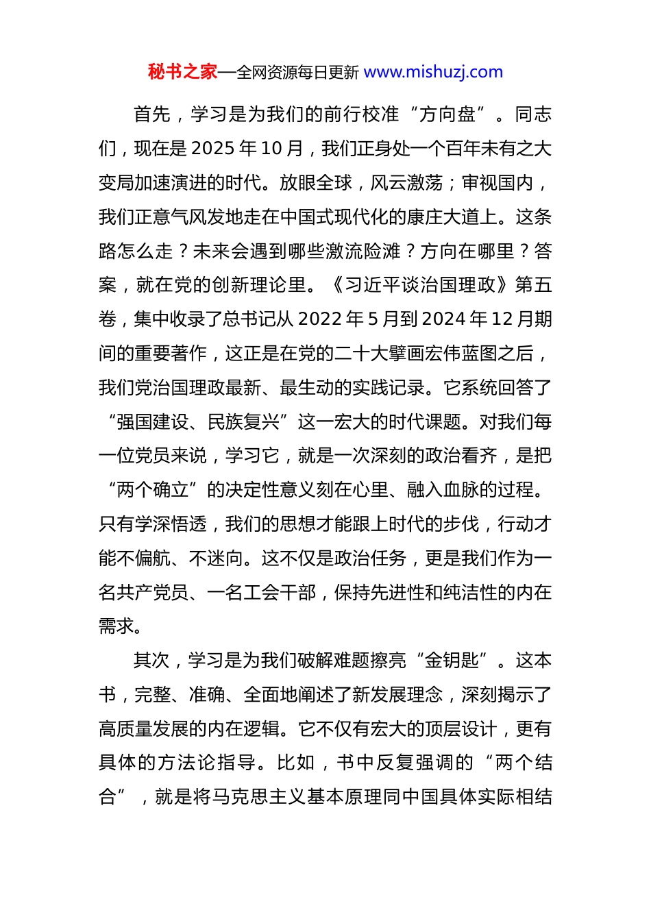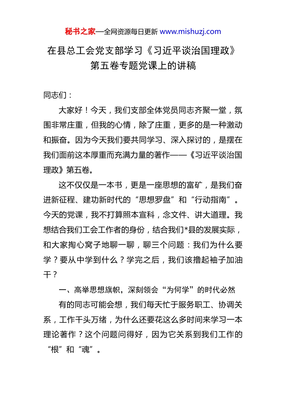 秘书之家—全网资源每日更新 www.mishuzj.com在县总工会党支部学习《习近平谈治国理政》第五卷专题党课上的讲稿 同志们:大家好!今天,我们支部全体党员同志齐聚一堂,氛围非常庄重,但我的心情,除了庄重,更多的是一种激动和振奋。因为今天我们要共同学习、深入探讨的,是摆在我们面前这本厚重而充满力量的著作——《习近平谈治国理政》第五卷。这不仅仅是一本书,更是一座思想的富矿,是我们奋进新征程、建功新时代的“思想罗盘”和“行动指南”。今天的党课,我不打算照本宣科,念文件、讲大道理。我想结合我们工会工作者的身份,结合我们*县的发展实际,和大家掏心窝子地聊一聊,聊三个问题:我们为什么要学?要从中学到什么?学完之后,我们该撸起袖子加油干?一、高举思想旗帜,深刻领会“为何学”的时代必然有的同志可能会想,我们每天忙于服务职工、协调关系,工作千头万绪,为什么还要花这么多时间来学习一本理论著作?这个问题问得好,因为它关系到我们工作的“根”和“魂”。秘书之家—全网资源每日更新 www.mishuzj.com首先,学习是为我们的前行校准“方向盘”。同志们,现在是 2025 年 10 月,我们正身处一个百年未有之大变局加速演进的时代。放眼全球,风云激荡;审视国内,我们正意气风发地走在中国式现代化的康庄大道上。这条路怎么走?未来会遇到哪些激流险滩?方向在哪里?答案,就在党的创新理论里。《习近平谈治国理政》第五卷,集中收录了总书记从 2022 年 5 月到 2024 年 12 月期间的重要著作,这正是在党的二十大擘画宏伟蓝图之后,我们党治国理政最新、最生动的实践记录。它系统回答了“强国建设、民族复兴”这一宏大的时代课题。对我们每一位党员来说,学习它,就是一次深刻的政治看齐,是把“两个确立”的决定性意义刻在心里、融入血脉的过程。只有学深悟透,我们的思想才能跟上时代的步伐,行动才能不偏航、不迷向。这不仅是政治任务,更是我们作为一名共产党员、一名工会干部,保持先进性和纯洁性的内在需求。其次,学习是为我们破解难题擦亮“金钥匙”。这本书,完整、准确、全面地阐述了新发展理念,深刻揭示了高质量发展的内在逻辑。它不仅有宏大的顶层设计,更有具体的方法论指导。比如,书中反复强调的“两个结合”,就是将马克思主义基本原理同中国具体实际相结秘书之家—全网资源每日更新 www.mishuzj.com合、同中华优秀传统文化相结合,这是我们取得一切胜利的最大法宝。想想我们工会的工作,是不是也面临很多新情况、新问题?新就业形态劳动者的权益如何保障?产业工人队伍的技能如何提升以适应“新质生产力”的发展要求?如何构建更加和谐的劳动关系?这些都不是拍拍脑袋就能解决的。我们必须从总书记的思想宝库中去寻找世界观和方法论,用科学的立场观点方法来分析问题、解决问题。这本书,就是我们破解工作难题、提升履职能力的“金钥匙”。最后,学习是为我们砥砺初心注入“强心剂”。总书记在书中反复强调“江山就是人民,人民就是江山”。我们工会是党联系职工群众的桥梁和纽带,我们的初心和使命,就是全心全意为职工群众服务。有时候工作累了、倦了,甚至受了委屈,不妨静下心来读一读。字里行间那种深厚的人民情怀,那种“我将无我,不负人民”的责任担当,会像一股暖流,重新点燃我们心中的火焰,让我们时刻牢记,我们是谁、为了谁、依靠谁。所以说,学习《习近平谈治国理政》第五卷,不是一个可有可无的选项,而是一门必须学好、学透的必修课。它关乎方向,关乎能力,更关乎我们共产党人的初心使命。二、把握精髓要义,精准弄懂“学什么”的核心内涵秘书之家—全网资源每日更新 www.mishuzj.com这本书内容博大精深,分为 18 个专题,共 91 篇文章。我们不可能一口吃成个胖子。但有几个核心要义,我认为是必须牢牢把握的。第一,要学懂“中国式现代化”这个最大的政治。“中国式现代化”是贯穿第五卷的一条鲜明主线。总书记深刻指出,中国式现代化是我们党领导人民长期探索和实践的重大成果。它不是西方现代化的翻版,而是人口规模巨大的现代化,是全体人民共同富裕的现代化,是物质文明和精神文明相协调的...