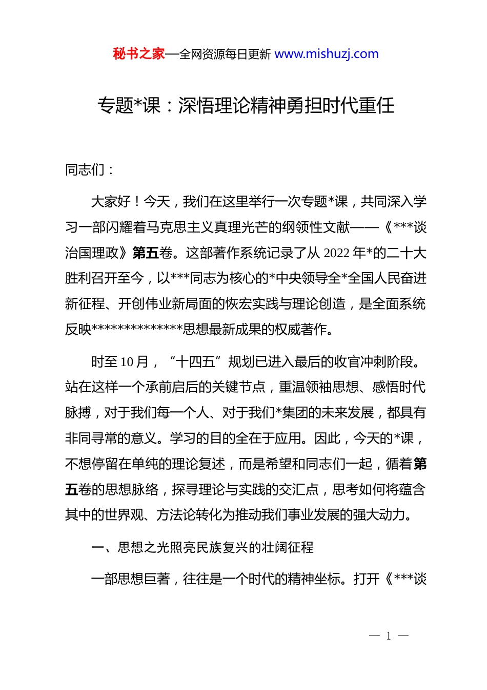 秘书之家—全网资源每日更新 www.mishuzj.com专题*课:深悟理论精神勇担时代重任同志们:大家好!今天,我们在这里举行一次专题*课,共同深入学习一部闪耀着马克思主义真理光芒的纲领性文献——《***谈治国理政》第五卷。这部著作系统记录了从 2022 年*的二十大胜利召开至今,以***同志为核心的*中央领导全*全国人民奋进新征程、开创伟业新局面的恢宏实践与理论创造,是全面系统反映**************思想最新成果的权威著作。时至 10 月,“十四五”规划已进入最后的收官冲刺阶段。站在这样一个承前启后的关键节点,重温领袖思想、感悟时代脉搏,对于我们每一个人、对于我们*集团的未来发展,都具有非同寻常的意义。学习的目的全在于应用。因此,今天的*课,不想停留在单纯的理论复述,而是希望和同志们一起,循着第五卷的思想脉络,探寻理论与实践的交汇点,思考如何将蕴含其中的世界观、方法论转化为推动我们事业发展的强大动力。一、思想之光照亮民族复兴的壮阔征程一部思想巨著,往往是一个时代的精神坐标。打开《***谈— 1 —秘书之家—全网资源每日更新 www.mishuzj.com治国理政》第五卷,字里行间激荡着一个百年大*矢志不渝的初心使命,擘画着一个东方大国走向复兴的宏伟蓝图。其思想体系博大精深,但有几个核心关键词,如同璀璨的星辰,构成了这部著作的理论星空,值得我们深刻领悟。第一个关键词是“中国式现代化”。这不是对西方现代化模式的简单复制,而是在中国这片广袤土地上生长出来的、具有中国特色、符合中国实际的现代化新路。第五卷深刻阐明,中国式现代化是人口规模巨大的现代化,是全体人民共同富裕的现代化,是物质文明和精神文明相协调的现代化,是人与自然和谐共生的现代化,是走和平发展道路的现代化。这“五个是”,彻底打破了“现代化=西方化”的迷思,为人类实现现代化提供了全新的选择。它强调的以人民为中心的发展思想,决定了我们的发展逻辑不是资本的逻辑,而是人民的逻辑;我们的发展目标不是少数人的富裕,而是全体人民的幸福生活。这为我们企业的发展指明了根本方向:一切经营活动,最终都要回到“为谁发展、靠谁发展”这个根本问题上,要将创造经济价值与履行社会责任、增进人民福祉统一起来。第二个关键词是“高质量发展”。如果说中国式现代化是目标,那么高质量发展就是通往这个目标的必由之路。第五卷— 2 —秘书之家—全网资源每日更新 www.mishuzj.com中,“高质量发展”是一个高频词,与之紧密相连的,是一个极具前瞻性和战略性的概念——“新质生产力”。什么是新质生产力?它是由技术革命性突破、生产要素创新性配置、产业深度转型升级而催生的当代先进生产力。其核心在于“新”,在于“质”,标志着我们正从依赖传统要素投入的增长模式,转向依靠科技创新、数据驱动的内涵式增长。这意味着,过去那种拼资源、拼成本的老路已经走不通了。未来发展的关键,在于谁能掌握核心技术,谁能培育出颠覆性的产业,谁能率先在绿色化、数字化、智能化的赛道上抢占先机。这一论述,对于身处市场竞争浪潮中的我们*集团而言,无异于一声发令枪,催促我们必须加快转型升级的步伐。第三个关键词是“全过程人民民主与基层治理”。治国理政,基础在基层。第五卷用大量篇幅论述了如何发展全过程人民民主,如何加强和创新基层社会治理。这其中,传承和发展“枫桥经验”是浓墨重彩的一笔。新时代“枫桥经验”,核心要义在于坚持 dj 引领,发动和依靠群众,实现“小事不出村、大事不出镇、矛盾不上交”。这不仅是一种社会治理模式,更体现了*的群众路线在治国理政中的生动运用。从社区议事厅里的“圆桌会”,到线上“随手拍”的民意直通车,再到“民呼— 3 —秘书之家—全网资源每日更新 www.mishuzj.com我为”的快速响应机制,基层治理的触角不断延伸,治理的颗粒度越来越精细。这启示我们,无论是企业管理还是社区服务,都要学会倾听,善于发动,将管理的过程变为凝聚共识、汇聚力量的过程,让每一位员工、每一位居民都成为参与者、建设者和受益者。二、实践伟力擘画可感可及的幸福图景理论的价值在于指导实践,思想的魅力在于改变世界。学...