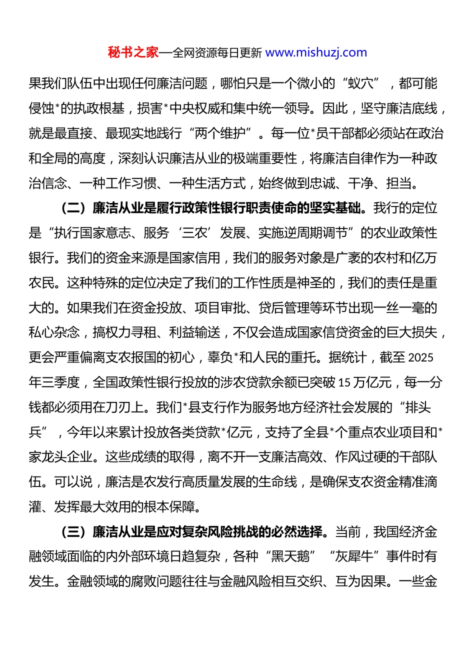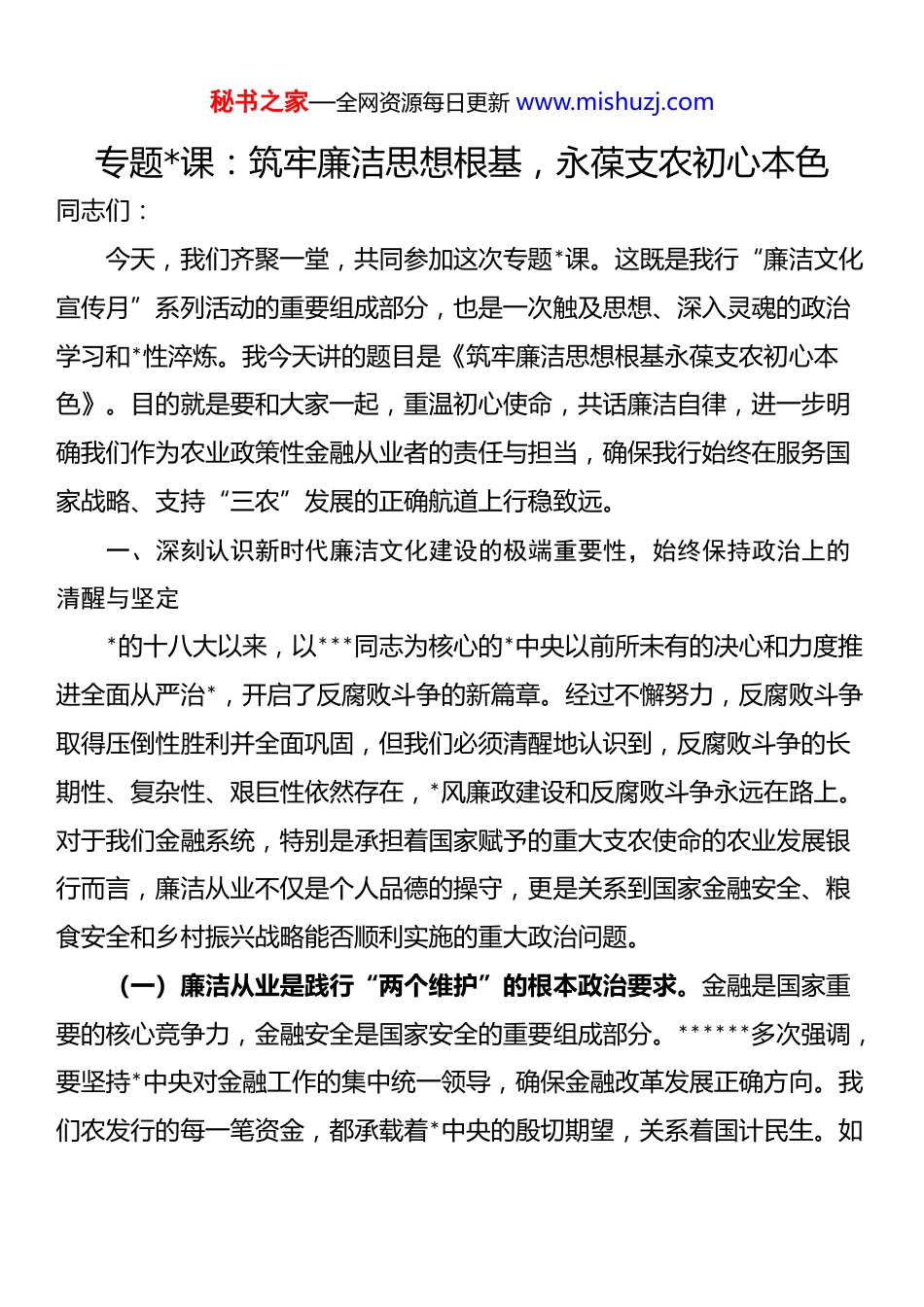 秘书之家—全网资源每日更新 www.mishuzj.com专题*课:筑牢廉洁思想根基,永葆支农初心本色同志们:今天,我们齐聚一堂,共同参加这次专题*课。这既是我行“廉洁文化宣传月”系列活动的重要组成部分,也是一次触及思想、深入灵魂的政治学习和*性淬炼。我今天讲的题目是《筑牢廉洁思想根基永葆支农初心本色》。目的就是要和大家一起,重温初心使命,共话廉洁自律,进一步明确我们作为农业政策性金融从业者的责任与担当,确保我行始终在服务国家战略、支持“三农”发展的正确航道上行稳致远。一、深刻认识新时代廉洁文化建设的极端重要性,始终保持政治上的清醒与坚定*的十八大以来,以***同志为核心的*中央以前所未有的决心和力度推进全面从严治*,开启了反腐败斗争的新篇章。经过不懈努力,反腐败斗争取得压倒性胜利并全面巩固,但我们必须清醒地认识到,反腐败斗争的长期性、复杂性、艰巨性依然存在,*风廉政建设和反腐败斗争永远在路上。对于我们金融系统,特别是承担着国家赋予的重大支农使命的农业发展银行而言,廉洁从业不仅是个人品德的操守,更是关系到国家金融安全、粮食安全和乡村振兴战略能否顺利实施的重大政治问题。(一)廉洁从业是践行“两个维护”的根本政治要求。金融是国家重要的核心竞争力,金融安全是国家安全的重要组成部分。******多次强调,要坚持*中央对金融工作的集中统一领导,确保金融改革发展正确方向。我们农发行的每一笔资金,都承载着*中央的殷切期望,关系着国计民生。如秘书之家—全网资源每日更新 www.mishuzj.com果我们队伍中出现任何廉洁问题,哪怕只是一个微小的“蚁穴”,都可能侵蚀*的执政根基,损害*中央权威和集中统一领导。因此,坚守廉洁底线,就是最直接、最现实地践行“两个维护”。每一位*员干部都必须站在政治和全局的高度,深刻认识廉洁从业的极端重要性,将廉洁自律作为一种政治信念、一种工作习惯、一种生活方式,始终做到忠诚、干净、担当。(二)廉洁从业是履行政策性银行职责使命的坚实基础。我行的定位是“执行国家意志、服务‘三农’发展、实施逆周期调节”的农业政策性银行。我们的资金来源是国家信用,我们的服务对象是广袤的农村和亿万农民。这种特殊的定位决定了我们的工作性质是神圣的,我们的责任是重大的。如果我们在资金投放、项目审批、贷后管理等环节出现一丝一毫的私心杂念,搞权力寻租、利益输送,不仅会造成国家信贷资金的巨大损失,更会严重偏离支农报国的初心,辜负*和人民的重托。据统计,截至 2025年三季度,全国政策性银行投放的涉农贷款余额已突破 15 万亿元,每一分钱都必须用在刀刃上。我们*县支行作为服务地方经济社会发展的“排头兵”,今年以来累计投放各类贷款*亿元,支持了全县*个重点农业项目和*家龙头企业。这些成绩的取得,离不开一支廉洁高效、作风过硬的干部队伍。可以说,廉洁是农发行高质量发展的生命线,是确保支农资金精准滴灌、发挥最大效用的根本保障。(三)廉洁从业是应对复杂风险挑战的必然选择。当前,我国经济金融领域面临的内外部环境日趋复杂,各种“黑天鹅”“灰犀牛”事件时有发生。金融领域的腐败问题往往与金融风险相互交织、互为因果。一些金秘书之家—全网资源每日更新 www.mishuzj.com融领域的腐败案件,往往是从一顿饭、一份礼品开始,逐步演变为内外勾结、非法牟利的重大经济犯罪,最终引发区域性、系统性金融风险。近年来,金融反腐持续保持高压态势,一批金融“内鬼”和“大鳄”被严肃查处,教训极其深刻。中共中央办公厅、国务院办公厅先后印发了《关于加强新时代廉洁文化建设的意见》和《国有企业领导人员廉洁从业若干规定》等一系列法规文件,为我们划定了红线、明确了底线。我们必须深刻认识到,金融领域的廉洁风险具有极强的隐蔽性、传染性和危害性。一个环节的失守,就可能导致“全盘皆输”。因此,我们必须时刻保持高度警惕,把廉洁风险防控摆在与信用风险、市场风险、操作风险同等重要的位置,做到警钟长鸣、防微杜渐。二、全面审视当前金融领域的风险挑战,时刻绷紧廉洁自律这根弦在肯定成绩的同时,我们更要正视问题、直面挑战。当前,金融领域的...