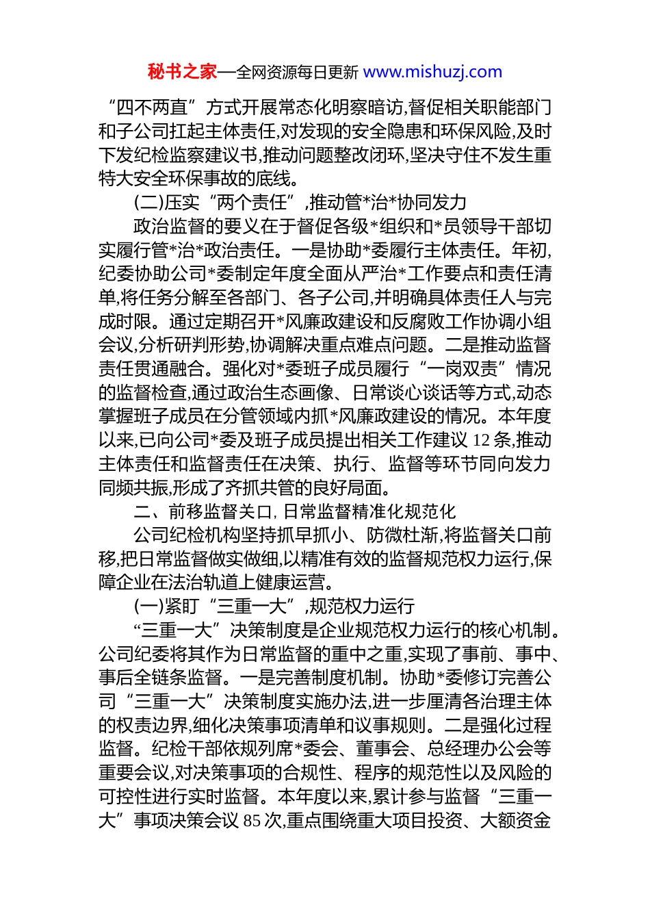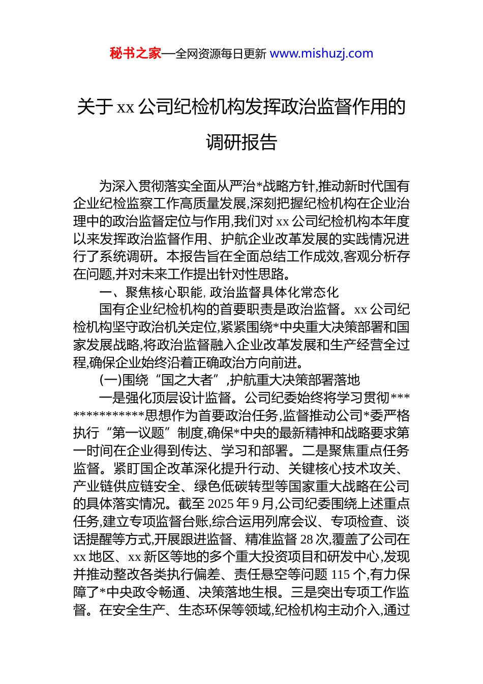 秘书之家—全网资源每日更新 www.mishuzj.com关于 xx 公司纪检机构发挥政治监督作用的调研报告为深入贯彻落实全面从严治*战略方针,推动新时代国有企业纪检监察工作高质量发展,深刻把握纪检机构在企业治理中的政治监督定位与作用,我们对 xx 公司纪检机构本年度以来发挥政治监督作用、护航企业改革发展的实践情况进行了系统调研。本报告旨在全面总结工作成效,客观分析存在问题,并对未来工作提出针对性思路。一、聚焦核心职能,政治监督具体化常态化国有企业纪检机构的首要职责是政治监督。xx 公司纪检机构坚守政治机关定位,紧紧围绕*中央重大决策部署和国家发展战略,将政治监督融入企业改革发展和生产经营全过程,确保企业始终沿着正确政治方向前进。(一)围绕“国之大者”,护航重大决策部署落地一是强化顶层设计监督。公司纪委始终将学习贯彻**************思想作为首要政治任务,监督推动公司*委严格执行“第一议题”制度,确保*中央的最新精神和战略要求第一时间在企业得到传达、学习和部署。二是聚焦重点任务监督。紧盯国企改革深化提升行动、关键核心技术攻关、产业链供应链安全、绿色低碳转型等国家重大战略在公司的具体落实情况。截至 2025 年 9 月,公司纪委围绕上述重点任务,建立专项监督台账,综合运用列席会议、专项检查、谈话提醒等方式,开展跟进监督、精准监督 28 次,覆盖了公司在xx 地区、xx 新区等地的多个重大投资项目和研发中心,发现并推动整改各类执行偏差、责任悬空等问题 115 个,有力保障了*中央政令畅通、决策落地生根。三是突出专项工作监督。在安全生产、生态环保等领域,纪检机构主动介入,通过秘书之家—全网资源每日更新 www.mishuzj.com“四不两直”方式开展常态化明察暗访,督促相关职能部门和子公司扛起主体责任,对发现的安全隐患和环保风险,及时下发纪检监察建议书,推动问题整改闭环,坚决守住不发生重特大安全环保事故的底线。(二)压实“两个责任”,推动管*治*协同发力政治监督的要义在于督促各级*组织和*员领导干部切实履行管*治*政治责任。一是协助*委履行主体责任。年初,纪委协助公司*委制定年度全面从严治*工作要点和责任清单,将任务分解至各部门、各子公司,并明确具体责任人与完成时限。通过定期召开*风廉政建设和反腐败工作协调小组会议,分析研判形势,协调解决重点难点问题。二是推动监督责任贯通融合。强化对*委班子成员履行“一岗双责”情况的监督检查,通过政治生态画像、日常谈心谈话等方式,动态掌握班子成员在分管领域内抓*风廉政建设的情况。本年度以来,已向公司*委及班子成员提出相关工作建议 12 条,推动主体责任和监督责任在决策、执行、监督等环节同向发力同频共振,形成了齐抓共管的良好局面。二、前移监督关口,日常监督精准化规范化公司纪检机构坚持抓早抓小、防微杜渐,将监督关口前移,把日常监督做实做细,以精准有效的监督规范权力运行,保障企业在法治轨道上健康运营。(一)紧盯“三重一大”,规范权力运行“三重一大”决策制度是企业规范权力运行的核心机制。公司纪委将其作为日常监督的重中之重,实现了事前、事中、事后全链条监督。一是完善制度机制。协助*委修订完善公司“三重一大”决策制度实施办法,进一步厘清各治理主体的权责边界,细化决策事项清单和议事规则。二是强化过程监督。纪检干部依规列席*委会、董事会、总经理办公会等重要会议,对决策事项的合规性、程序的规范性以及风险的可控性进行实时监督。本年度以来,累计参与监督“三重一大”事项决策会议 85 次,重点围绕重大项目投资、大额资金秘书之家—全网资源每日更新 www.mishuzj.com使用、重要人事任免等议题,提出监督意见和建议 45 条。对于其中 3 项经研判存在较大廉洁风险或决策依据不充分的议题,及时提出暂缓或重新论证的建议,均被采纳,有效防范了决策风险,确保了“三重一大”决策的合规率达到 100%。三是开展专项检查。定期对“三重一大”决策执行情况开展“回头看”,重点检查是否存在规避集体决策、搞“一言堂”或决策后不执行、乱执行等问题,确保决策事项得到不折不扣的落实。(二)聚焦“关键少数”,强化重点领域监管针对国有企业腐败问题易发多...
