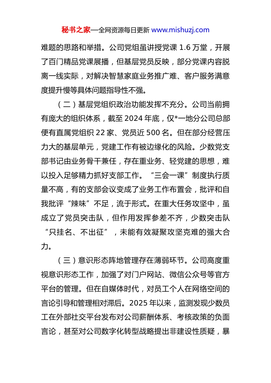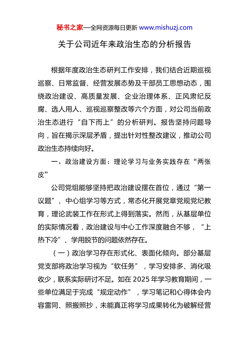 秘书之家—全网资源每日更新 www.mishuzj.com关于公司近年来政治生态的分析报告 根据年度政治生态研判工作安排,我们结合近期巡视巡察、日常监督、经营发展态势及干部员工思想动态,围绕政治建设、高质量发展、企业治理体系、正风肃纪反腐、选人用人、巡视巡察整改等六个方面,对公司当前政治生态进行“自下而上”的分析研判。报告坚持问题导向,旨在揭示深层矛盾,提出针对性整改建议,推动公司政治生态持续向好。一、政治建设方面:理论学习与业务实践存在“两张皮”公司党组能够坚持把政治建设摆在首位,通过“第一议题”、中心组学习等方式,常态化开展党章党规党纪教育,理论武装工作在形式上得到落实。然而,从基层单位的实际情况看,政治建设与中心工作深度融合不够,“上热下冷”、学用脱节的问题依然存在。(一)政治学习存在形式化、表面化倾向。部分基层党支部将政治学习视为“软任务”,学习安排多、消化吸收少,联系实际研讨不足。如在 2025 年学习教育期间,一些单位满足于完成“规定动作”,学习笔记和心得体会内容雷同、照搬照抄,未能真正将学习成果转化为破解经营秘书之家—全网资源每日更新 www.mishuzj.com难题的思路和举措。公司党组虽讲授党课 1.6 万堂,开展了百门精品党课展播,但基层党员反映,部分党课内容脱离一线实际,对解决智慧家庭业务推广难、客户服务满意度提升慢等具体问题指导性不强。(二)基层党组织政治功能发挥不充分。公司当前拥有庞大的组织体系,截至 2024 年底,仅*一地分公司总部便有直属党组织 22 家、党员近 500 名。但在部分经营压力大的基层单元,党建工作有被边缘化的风险。少数党支部书记由业务骨干兼任,存在重业务、轻党建的思想,难以投入足够精力抓好支部工作。“三会一课”制度执行质量不高,有的支部会议变成了业务工作布置会,批评和自我批评“辣味”不足,流于形式。在重大任务攻坚中,虽成立了党员突击队,但作用发挥参差不齐,少数突击队“只挂名、不出征”,未能有效凝聚攻坚克难的强大合力。(三)意识形态阵地管理存在薄弱环节。公司高度重视意识形态工作,加强了对门户网站、微信公众号等官方平台的管理。但在自媒体时代,对员工个人在网络空间的言论引导和管理相对滞后。2025 年以来,监测发现少数员工在外部社交平台发布对公司薪酬体系、考核政策的负面言论,甚至对公司数字化转型战略提出非建设性质疑,暴秘书之家—全网资源每日更新 www.mishuzj.com露出思想政治工作未能深入覆盖到每一位员工,价值引领未能完全跟上企业改革发展的步伐。二、高质量发展方面:“增收不增利”隐忧显现,转型压力巨大近年来,公司牢牢把握“云改数转”战略,经营业绩持续向好。2024 年,公司实现营业收入 5078.43 亿元,同 比 增 长 6.9% ; 净 利 润 达 304.46 亿 元 , 同 比 增 长10.3%。然而,靓丽的数据背后,高质量发展的根基尚不稳固,结构性矛盾和潜在风险不容忽视。(一)新兴业务对盈利的贡献与高投入不匹配。以天翼 云 为 代 表 的 产 业 数 字 化 业 务 是 公 司 增 长 的 核 心 引擎,2024 年收入达到 972 亿元,同比激增 67.9%。但此类业务前期投入巨大、市场竞争“白热化”,导致营业成本同步高速增长。2024 年公司营业成本增速达 11.9%,高于营收增速。在新兴业务领域,公司一定程度上陷入了为抢占市场份额而牺牲短期利润的窘境,部分政企项目存在“赔本赚吆喝”的情况,可持续性存疑。若不能尽快提升核心技术竞争力和项目交付效率,新兴业务“增收不增利”的风险将进一步放大。(二)传统业务下滑趋势难以遏制,网络资源效能有待提升。2024 年,公司固定电话用户数净减 393 万户,秘书之家—全网资源每日更新 www.mishuzj.com传统通信业务的萎缩态势明显。同时,公司在网络建设上投入巨大,2024 年资本开支达 988 亿元,在用 5G 基站超过 121 万站。但部分区域的 5G 网络利用率偏低,尤其是在*等偏远农村地区,网络覆盖与用户体验提升后,未能有效转化为匹配的业务收入增长,资产回报率承压。如何盘活庞大的存量网络资产,通过创...