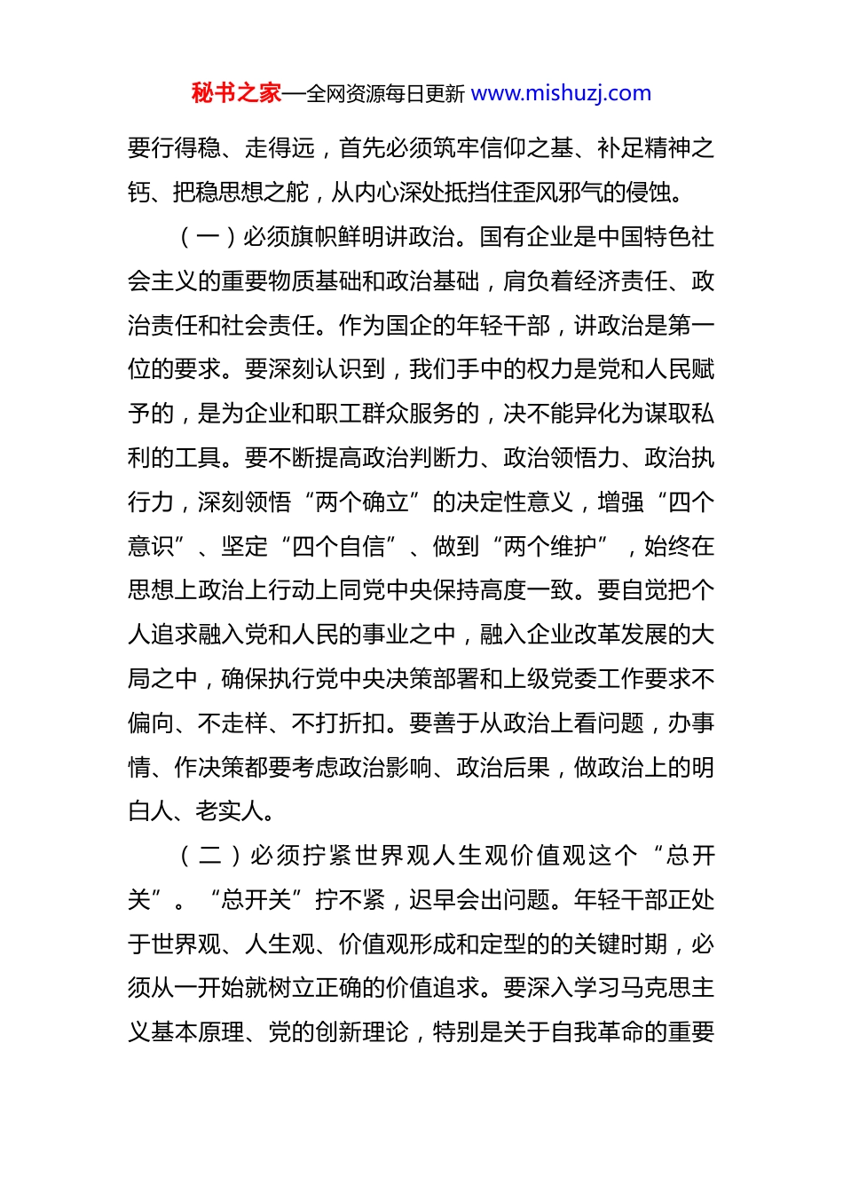 秘书之家—全网资源每日更新 www.mishuzj.com国企纪检组长在年轻干部廉洁座谈会上的集体谈话 同志们:今天,我们专门组织召开这次年轻干部廉洁座谈会,主要目的是与大家进行一次深入的集体谈心谈话,这既是落实全面从严治党要求、加强干部教育管理监督的具体举措,也是组织上对年轻干部健康成长的高度重视和关心爱护。在座的各位都是我们企业各条战线上的骨干力量,是企业的未来和希望。大家正值干事创业的黄金时期,充满活力,思维活跃,接受新事物快,工作热情高,这是你们的优势。但同时,也要清醒地认识到,年轻干部相对而言,经历风雨考验较少,党性锻炼、社会阅历、实践考验相对不足,在面对复杂形势、各种诱惑时,抗腐蚀、抗“围猎”的能力还需要不断加强。因此,在大家职业生涯的关键时期,及早地敲响警钟,打好“预防针”,引导大家扣好廉洁从业的“第一粒扣子”,显得尤为重要和紧迫。下面,我围绕年轻干部如何做到忠诚干净担当、走好职业生涯的每一步,讲几点意见。一、筑牢思想根基,永葆清正廉洁的政治本色理想信念是立身之本,是精神上的“钙”。年轻干部秘书之家—全网资源每日更新 www.mishuzj.com要行得稳、走得远,首先必须筑牢信仰之基、补足精神之钙、把稳思想之舵,从内心深处抵挡住歪风邪气的侵蚀。(一)必须旗帜鲜明讲政治。国有企业是中国特色社会主义的重要物质基础和政治基础,肩负着经济责任、政治责任和社会责任。作为国企的年轻干部,讲政治是第一位的要求。要深刻认识到,我们手中的权力是党和人民赋予的,是为企业和职工群众服务的,决不能异化为谋取私利的工具。要不断提高政治判断力、政治领悟力、政治执行力,深刻领悟“两个确立”的决定性意义,增强“四个意识”、坚定“四个自信”、做到“两个维护”,始终在思想上政治上行动上同党中央保持高度一致。要自觉把个人追求融入党和人民的事业之中,融入企业改革发展的大局之中,确保执行党中央决策部署和上级党委工作要求不偏向、不走样、不打折扣。要善于从政治上看问题,办事情、作决策都要考虑政治影响、政治后果,做政治上的明白人、老实人。(二)必须拧紧世界观人生观价值观这个“总开关”。“总开关”拧不紧,迟早会出问题。年轻干部正处于世界观、人生观、价值观形成和定型的的关键时期,必须从一开始就树立正确的价值追求。要深入学习马克思主义基本原理、党的创新理论,特别是关于自我革命的重要秘书之家—全网资源每日更新 www.mishuzj.com思想,深刻理解共产党执政规律、社会主义建设规律、人类社会发展规律,从根本上解决好“我是谁、为了谁、依靠谁”的问题。要自觉践行社会主义核心价值观,弘扬忠诚老实、公道正派、实事求是、清正廉洁等价值观,追求积极健康的生活情趣,远离低级趣味,抵制歪风邪气。要深刻认识到,人生的价值在于奉献,而不是索取;在于为人民服务,而不是贪图享乐。要时刻反躬自省,看看自己的言行是否符合党员干部的要求,是否背离了初心使命,不断净化思想、校正行为。(三)必须持续加强党纪国法和廉洁从业知识学习。无知者无畏,法纪意识的淡薄往往是走向违纪违法的第一步。年轻干部要把学习党章党规党纪和国家法律法规、企业规章制度作为必修课,常学常新、入脑入心。要重点学习《中国共产党纪律处分条例》、《中华人民共和国监察法》、《中华人民共和国公职人员政务处分法》等,搞清楚哪些事能做、哪些事不能做,哪些话能说、哪些话不能说,明确行为的底线、红线和高压线。要熟悉掌握企业内部的廉洁从业规定、财务管理、招标采购、工程建设等重点领域的制度要求,知道权限在哪里、程序是什么、风险点有哪些。学习不能停留在纸上、挂在嘴上,要真正内化为行为准则,做到知敬畏、存戒惧、守底线,习惯在受监秘书之家—全网资源每日更新 www.mishuzj.com督和约束的环境中工作生活。二、严守纪律规矩,习惯在受监督和约束下工作生活没有规矩,不成方圆。党的纪律和规矩是党员干部约束自身行为的基本标准。年轻干部要想健康成长,必须把纪律规矩挺在前面,让严守纪律、自觉接受监督成为一种习惯、一种自觉。(一)必须把党的纪律规矩刻印在心。党的纪律...
