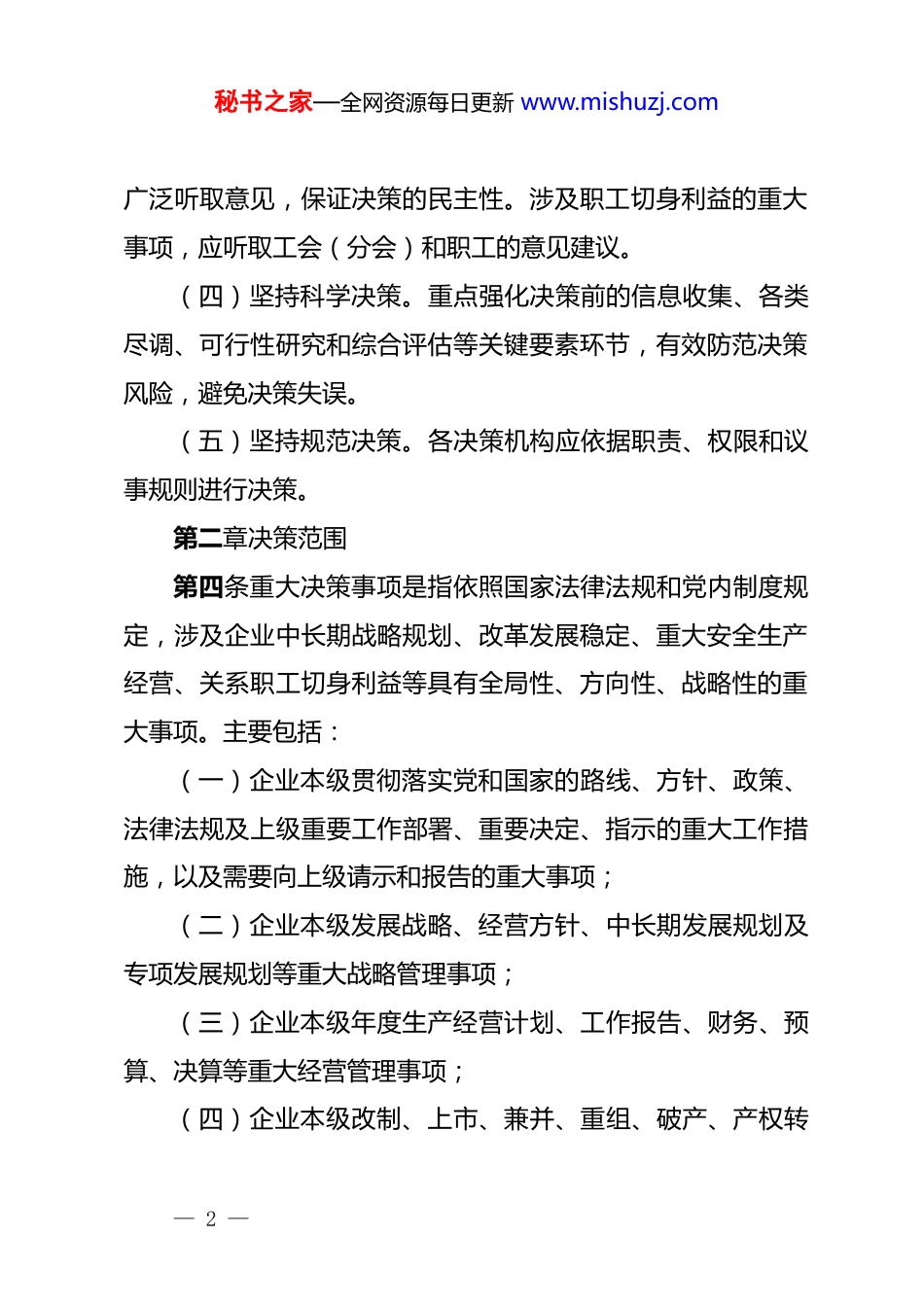 秘书之家—全网资源每日更新 www.mishuzj.com某集团“三重一大”决策制度实施办法第一章总则第一条为认真贯彻落实中共中央、国务院《关于进一步推进国有企业贯彻落实“三重一大”决策制度的意见》、全国国有企业党建工作会议精神和新一轮国企改革深化提升行动部署安排、省国资委的监管要求的文件内容,全面发挥党组织对国有企业的领导核心和政治核心作用,持续完善中国特色国有企业现代集团治理,进一步促进领导人员廉洁从业,规范 XX 集团(以下简称“集团”)重大决策行为,提高决策水平和效力,防范决策风险,保障企业科学发展,依据国家相关法律法规,等企业规章制度和工作实际,制定本实施办法。第二条“三重一大”是指集团重大事项决策、重要人事任免、重大项目安排和大额资金运作等事项。第三条“三重一大”事项决策必须遵循以下原则:(一)坚持集体决策。凡涉及“三重一大”的事项决策,必须由领导班子集体研究作出决定。(二)坚持依法决策。遵循国家法律法规、党内规章制度以及集团制度等相关规定,保证决策合法合规。(三)坚持民主决策。坚持民主集中制,充分发扬民主,— 1 —秘书之家—全网资源每日更新 www.mishuzj.com广泛听取意见,保证决策的民主性。涉及职工切身利益的重大事项,应听取工会(分会)和职工的意见建议。(四)坚持科学决策。重点强化决策前的信息收集、各类尽调、可行性研究和综合评估等关键要素环节,有效防范决策风险,避免决策失误。(五)坚持规范决策。各决策机构应依据职责、权限和议事规则进行决策。第二章决策范围第四条重大决策事项是指依照国家法律法规和党内制度规定,涉及企业中长期战略规划、改革发展稳定、重大安全生产经营、关系职工切身利益等具有全局性、方向性、战略性的重大事项。主要包括:(一)企业本级贯彻落实党和国家的路线、方针、政策、法律法规及上级重要工作部署、重要决定、指示的重大工作措施,以及需要向上级请示和报告的重大事项;(二)企业本级发展战略、经营方针、中长期发展规划及专项发展规划等重大战略管理事项;(三)企业本级年度生产经营计划、工作报告、财务、预算、决算等重大经营管理事项;(四)企业本级改制、上市、兼并、重组、破产、产权转— 2 —秘书之家—全网资源每日更新 www.mishuzj.com让或者变更等重大资本运作事项;(五)企业本级年度投资、融资、担保计划的制定、调整等;(六)企业本级及权属企业单笔 XX 万元以上资产损失核销、原值 XX 万元以上资产处置(资产转让、报废、置换等)、国有产权、股权变动、利润分配和弥补亏损等重大资产(产权)管理事项;(七)企业本级薪酬管理、中长期激励、工资总额管理的制度与改革方案以及其它涉及职工切身利益的重大事项;(八)企业本级分支机构的设立或者撤销,内部管理机构的设置、职能调整,重要规章制度的制定、修订及废除;(九)涉及安全环保、维护稳定、社会责任等方面的重大事项和突发事件的处置应对;(十)党的建设、意识形态、精神文明建设、国家安全人民防线建设、思想政治工作以及群团工作等方面的重大事项;(十一)党风廉政建设和反腐败工作中的重大问题,对违纪违规人员的处理决定;(十二)领导班子认为应该集体决策的其他重要事项。第五条重要人事任免是指企业直接管理的领导人员以及其他经营管理人员的聘任(免)、调整、委派人员的推荐与免职— 3 —秘书之家—全网资源每日更新 www.mishuzj.com等。主要包括:(一)按照集团干部管理权限对干部的任免、聘用和解聘等;(二)其它应由企业究决定的重要人事任免事项。第六条重大项目安排是指对企业资产规模、资本结构、盈利能力以及生产装备、技术状况等产生重要影响的项目安排。主要包括:(一)经营性投资项目:包括带动主业发展的投资(包括但不限于采用股权+、基金+、信托+、债券+等方式)等。(二)股权投资项目:包括追加投资、收购兼并、注资参股、股权转换、企业重组等(因经营性投资、融资、降负债、项目运营等专业业务发展和特殊需求而进行的股权投资除外)。(三)固定资产投资项目:包括基本建设和更新改造等。(不含为获取经营性投资...
