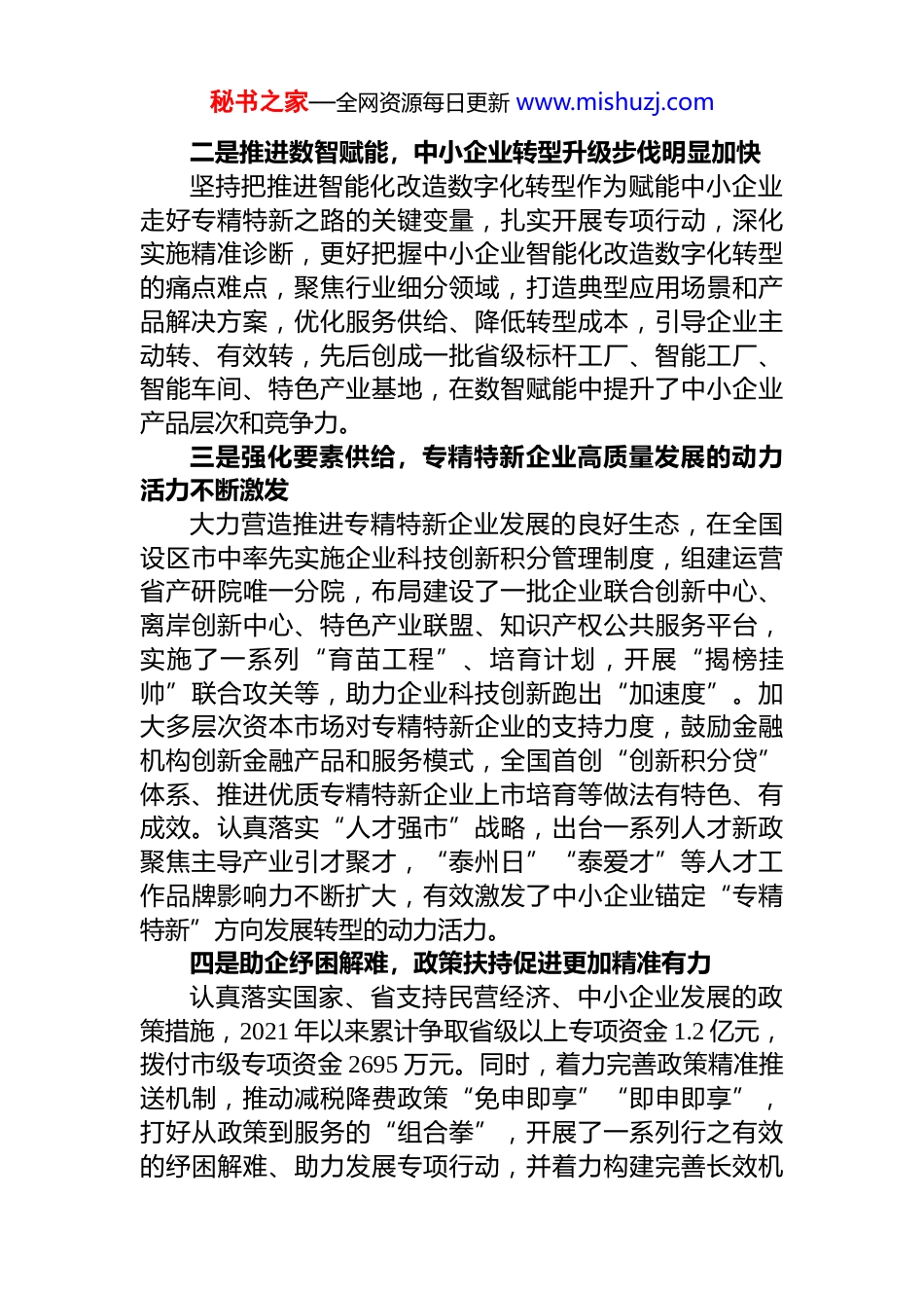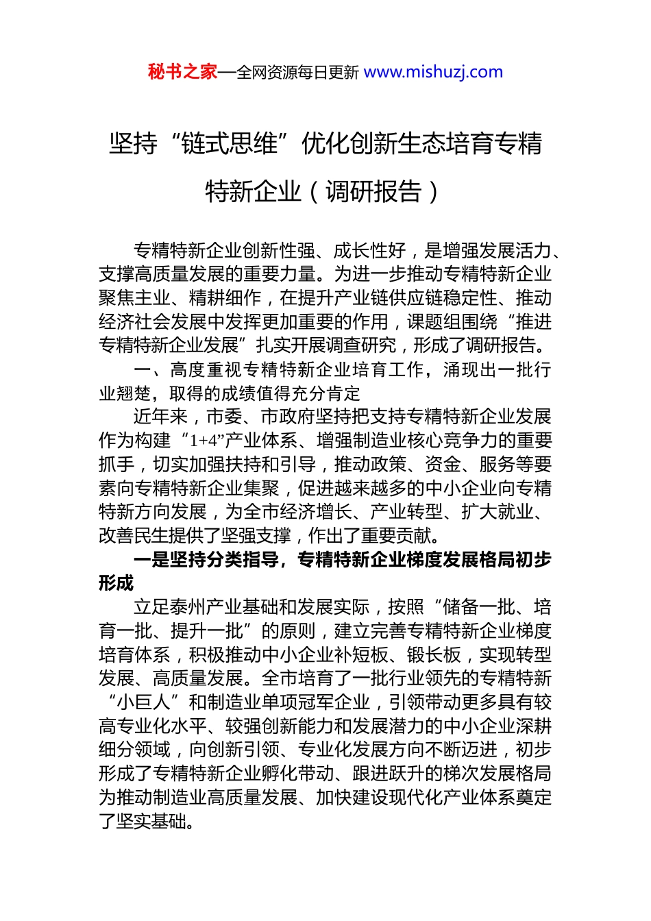 秘书之家—全网资源每日更新 www.mishuzj.com坚持“链式思维”优化创新生态培育专精特新企业(调研报告)专精特新企业创新性强、成长性好,是增强发展活力、支撑高质量发展的重要力量。为进一步推动专精特新企业聚焦主业、精耕细作,在提升产业链供应链稳定性、推动经济社会发展中发挥更加重要的作用,课题组围绕“推进专精特新企业发展”扎实开展调查研究,形成了调研报告。一、高度重视专精特新企业培育工作,涌现出一批行业翘楚,取得的成绩值得充分肯定近年来,市委、市政府坚持把支持专精特新企业发展作为构建“1+4”产业体系、增强制造业核心竞争力的重要抓手,切实加强扶持和引导,推动政策、资金、服务等要素向专精特新企业集聚,促进越来越多的中小企业向专精特新方向发展,为全市经济增长、产业转型、扩大就业、改善民生提供了坚强支撑,作出了重要贡献。一是坚持分类指导,专精特新企业梯度发展格局初步形成立足泰州产业基础和发展实际,按照“储备一批、培育一批、提升一批”的原则,建立完善专精特新企业梯度培育体系,积极推动中小企业补短板、锻长板,实现转型发展、高质量发展。全市培育了一批行业领先的专精特新“小巨人”和制造业单项冠军企业,引领带动更多具有较高专业化水平、较强创新能力和发展潜力的中小企业深耕细分领域,向创新引领、专业化发展方向不断迈进,初步形成了专精特新企业孵化带动、跟进跃升的梯次发展格局为推动制造业高质量发展、加快建设现代化产业体系奠定了坚实基础。秘书之家—全网资源每日更新 www.mishuzj.com二是推进数智赋能,中小企业转型升级步伐明显加快坚持把推进智能化改造数字化转型作为赋能中小企业走好专精特新之路的关键变量,扎实开展专项行动,深化实施精准诊断,更好把握中小企业智能化改造数字化转型的痛点难点,聚焦行业细分领域,打造典型应用场景和产品解决方案,优化服务供给、降低转型成本,引导企业主动转、有效转,先后创成一批省级标杆工厂、智能工厂、智能车间、特色产业基地,在数智赋能中提升了中小企业产品层次和竞争力。三是强化要素供给,专精特新企业高质量发展的动力活力不断激发大力营造推进专精特新企业发展的良好生态,在全国设区市中率先实施企业科技创新积分管理制度,组建运营省产研院唯一分院,布局建设了一批企业联合创新中心、离岸创新中心、特色产业联盟、知识产权公共服务平台,实施了一系列“育苗工程”、培育计划,开展“揭榜挂帅”联合攻关等,助力企业科技创新跑出“加速度”。加大多层次资本市场对专精特新企业的支持力度,鼓励金融机构创新金融产品和服务模式,全国首创“创新积分贷”体系、推进优质专精特新企业上市培育等做法有特色、有成效。认真落实“人才强市”战略,出台一系列人才新政聚焦主导产业引才聚才,“泰州日”“泰爱才”等人才工作品牌影响力不断扩大,有效激发了中小企业锚定“专精特新”方向发展转型的动力活力。四是助企纾困解难,政策扶持促进更加精准有力认真落实国家、省支持民营经济、中小企业发展的政策措施,2021 年以来累计争取省级以上专项资金 1.2 亿元,拨付市级专项资金 2695 万元。同时,着力完善政策精准推送机制,推动减税降费政策“免申即享”“即申即享”,打好从政策到服务的“组合拳”,开展了一系列行之有效的纾困解难、助力发展专项行动,并着力构建完善长效机秘书之家—全网资源每日更新 www.mishuzj.com制,尽可能减轻企业负担,提振发展信心,让企业有更多获得感、安全感。二、着眼增强制造业集群竞争力,以产业链思维推进专精特新企业高质量发展专精特新企业专业化程度高、配套能力强、发展潜力大,是产业链“补短板、锻长板、强基础”的有力保障。建议进一步坚持链式思维,从强链补链固链、提升先进制造业集群竞争力、夯实现代化产业体系微观基础的维度,扎实推进专精特新企业高质量发展。一是坚持链式思维,加大梯度培育力度根据工信部《优质中小企业梯度培育管理暂行办法》和《江苏省专精特新企业培育三年行动计划(2023-2025年)》的部署要求,出台我市中小企业专精特新发展规划和培育方案,加快优质中小企业培育进程。全面...