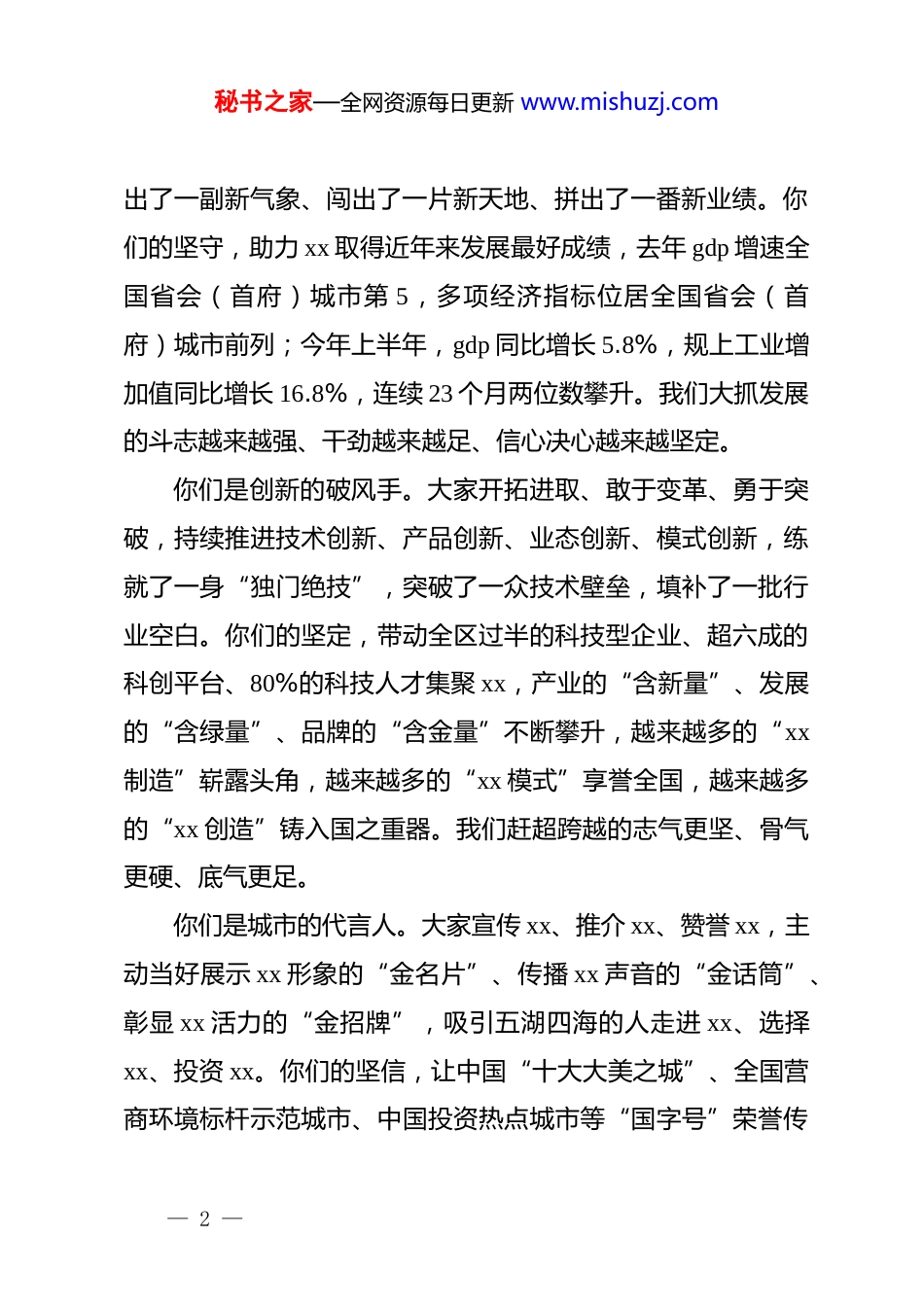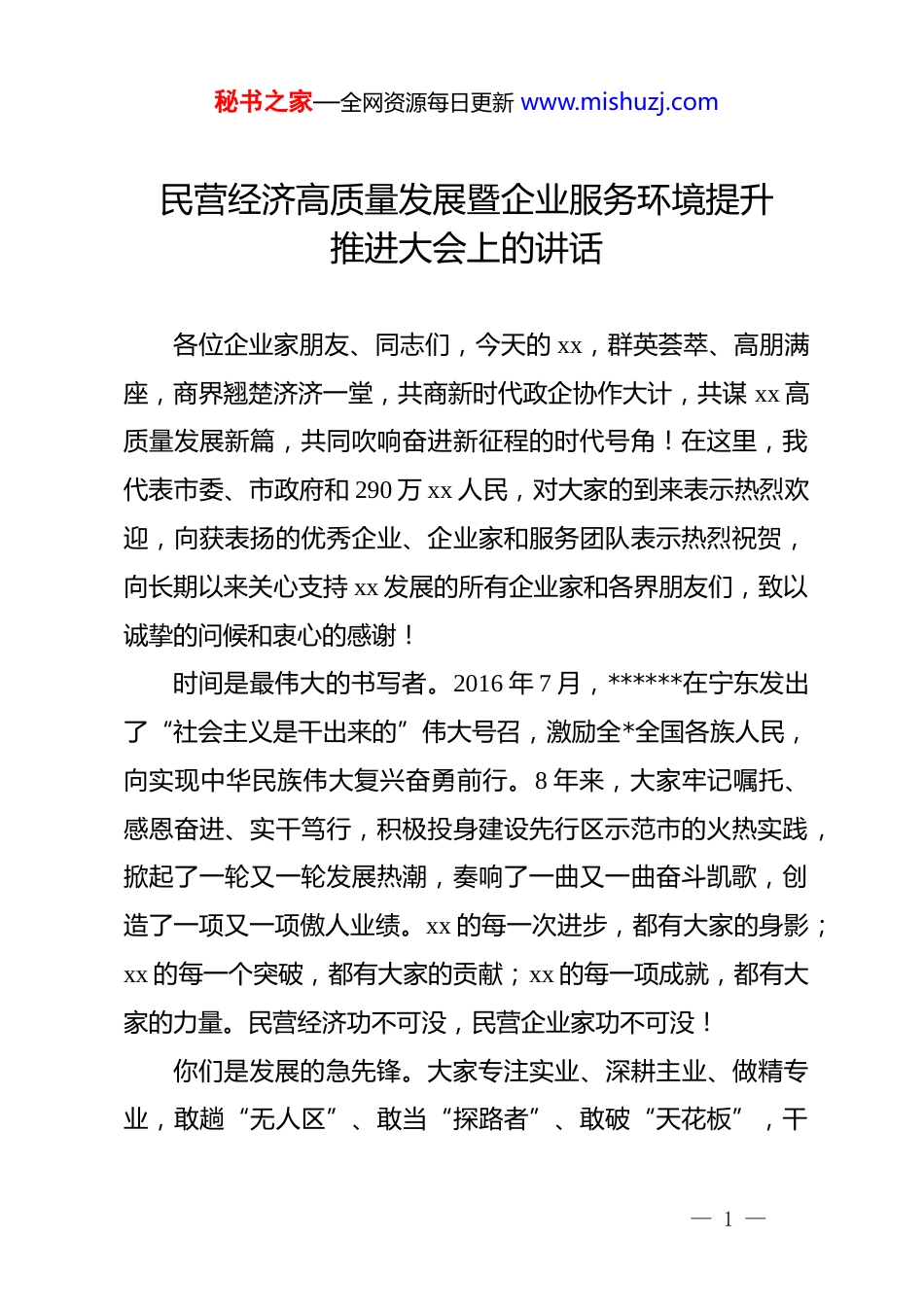 秘书之家—全网资源每日更新 www.mishuzj.com民营经济高质量发展暨企业服务环境提升推进大会上的讲话各位企业家朋友、同志们,今天的 xx,群英荟萃、高朋满座,商界翘楚济济一堂,共商新时代政企协作大计,共谋 xx 高质量发展新篇,共同吹响奋进新征程的时代号角!在这里,我代表市委、市政府和 290 万 xx 人民,对大家的到来表示热烈欢迎,向获表扬的优秀企业、企业家和服务团队表示热烈祝贺,向长期以来关心支持 xx 发展的所有企业家和各界朋友们,致以诚挚的问候和衷心的感谢!时间是最伟大的书写者。2016 年 7 月,******在宁东发出了“社会主义是干出来的”伟大号召,激励全*全国各族人民,向实现中华民族伟大复兴奋勇前行。8 年来,大家牢记嘱托、感恩奋进、实干笃行,积极投身建设先行区示范市的火热实践,掀起了一轮又一轮发展热潮,奏响了一曲又一曲奋斗凯歌,创造了一项又一项傲人业绩。xx 的每一次进步,都有大家的身影;xx 的每一个突破,都有大家的贡献;xx 的每一项成就,都有大家的力量。民营经济功不可没,民营企业家功不可没!你们是发展的急先锋。大家专注实业、深耕主业、做精专业,敢趟“无人区”、敢当“探路者”、敢破“天花板”,干— 1 —秘书之家—全网资源每日更新 www.mishuzj.com出了一副新气象、闯出了一片新天地、拼出了一番新业绩。你们的坚守,助力 xx 取得近年来发展最好成绩,去年 gdp 增速全国省会(首府)城市第 5,多项经济指标位居全国省会(首府)城市前列;今年上半年,gdp 同比增长 5.8%,规上工业增加值同比增长 16.8%,连续 23 个月两位数攀升。我们大抓发展的斗志越来越强、干劲越来越足、信心决心越来越坚定。你们是创新的破风手。大家开拓进取、敢于变革、勇于突破,持续推进技术创新、产品创新、业态创新、模式创新,练就了一身“独门绝技”,突破了一众技术壁垒,填补了一批行业空白。你们的坚定,带动全区过半的科技型企业、超六成的科创平台、80%的科技人才集聚 xx,产业的“含新量”、发展的“含绿量”、品牌的“含金量”不断攀升,越来越多的“xx制造”崭露头角,越来越多的“xx 模式”享誉全国,越来越多的“xx 创造”铸入国之重器。我们赶超跨越的志气更坚、骨气更硬、底气更足。你们是城市的代言人。大家宣传 xx、推介 xx、赞誉 xx,主动当好展示 xx 形象的“金名片”、传播 xx 声音的“金话筒”、彰显 xx 活力的“金招牌”,吸引五湖四海的人走进 xx、选择xx、投资 xx。你们的坚信,让中国“十大大美之城”、全国营商环境标杆示范城市、中国投资热点城市等“国字号”荣誉传— 2 —秘书之家—全网资源每日更新 www.mishuzj.com遍大江南北,xx 正成为对外开放的新高地、多元文化的交汇点、吸引要素的强磁场。我们建设 xx 的激情越来越充沛、热情越来越高涨、豪情越来越昂扬。你们是社会的回馈者。大家有情怀、有风骨、有境界,富而思报、饮水思源、反哺社会,无论是在脱贫攻坚、抗击疫情、赈灾救灾的大仗硬仗中,还是在公益事业、慈善事业、社会事业的一点一滴里,一段段动人故事口口相传,一个个闪光名字声声传颂。你们的坚持,帮助 xx 啃下了一块块“硬骨头”,攻克了一座座“娄山关”,汇聚了一股股“正能量”,成为了 xx城市的一分子。我们共筑精神家园、共建大美 xx、共享发展成果,已经是每个人的态度、担当和自觉。实践充分证明,企业和企业家是我们极为珍贵的社会财富极其重要的战略资源,举足轻重、不可替代。全市人民为你们的成功骄傲,为你们的精神点赞,为你们的付出感动自豪!各位企业家朋友、同志们,去年,我们以立法形式设立“xx 企业家日”,以城之名,向努力拼搏、不懈奋斗、贡献突出的企业和企业家们致以崇高的敬意。我们发布“3 个 100”榜单、出台“15 条”惠企利企政策、认定 15 支“先锋队”,就是要表明服务企业情真意切,让大家共享 xx 成果、共筑美好 xx。我们将把优化营商环境作为“永不竣工的重大工程”,让大家— 3 —秘书之家—全网资源每日更新 www.mishuzj.com坐大会的“c 位”、享服务的“c 位”、当发展的“c 位...