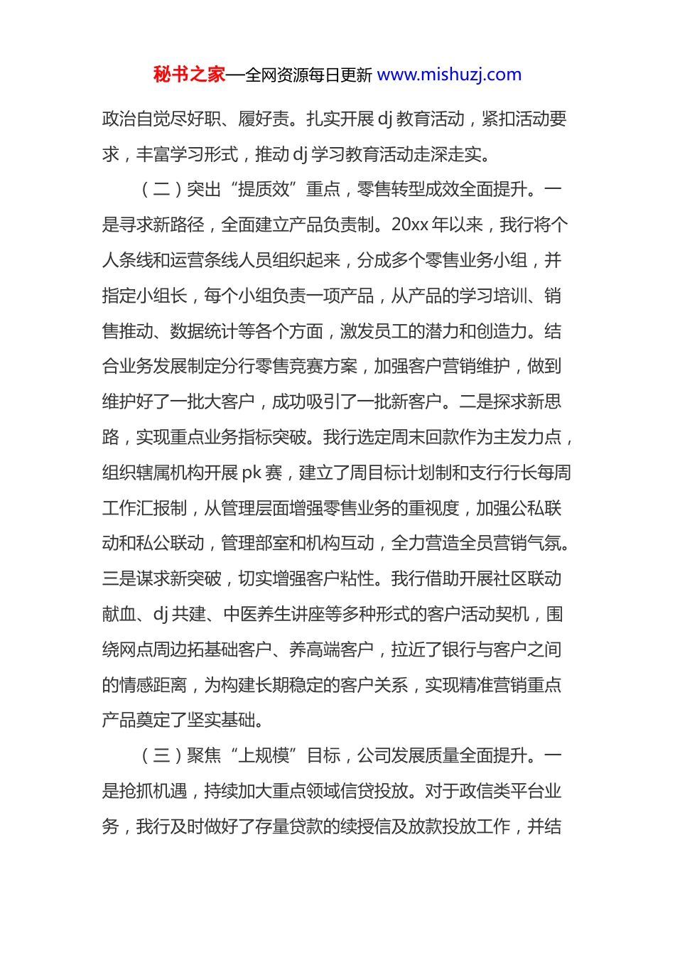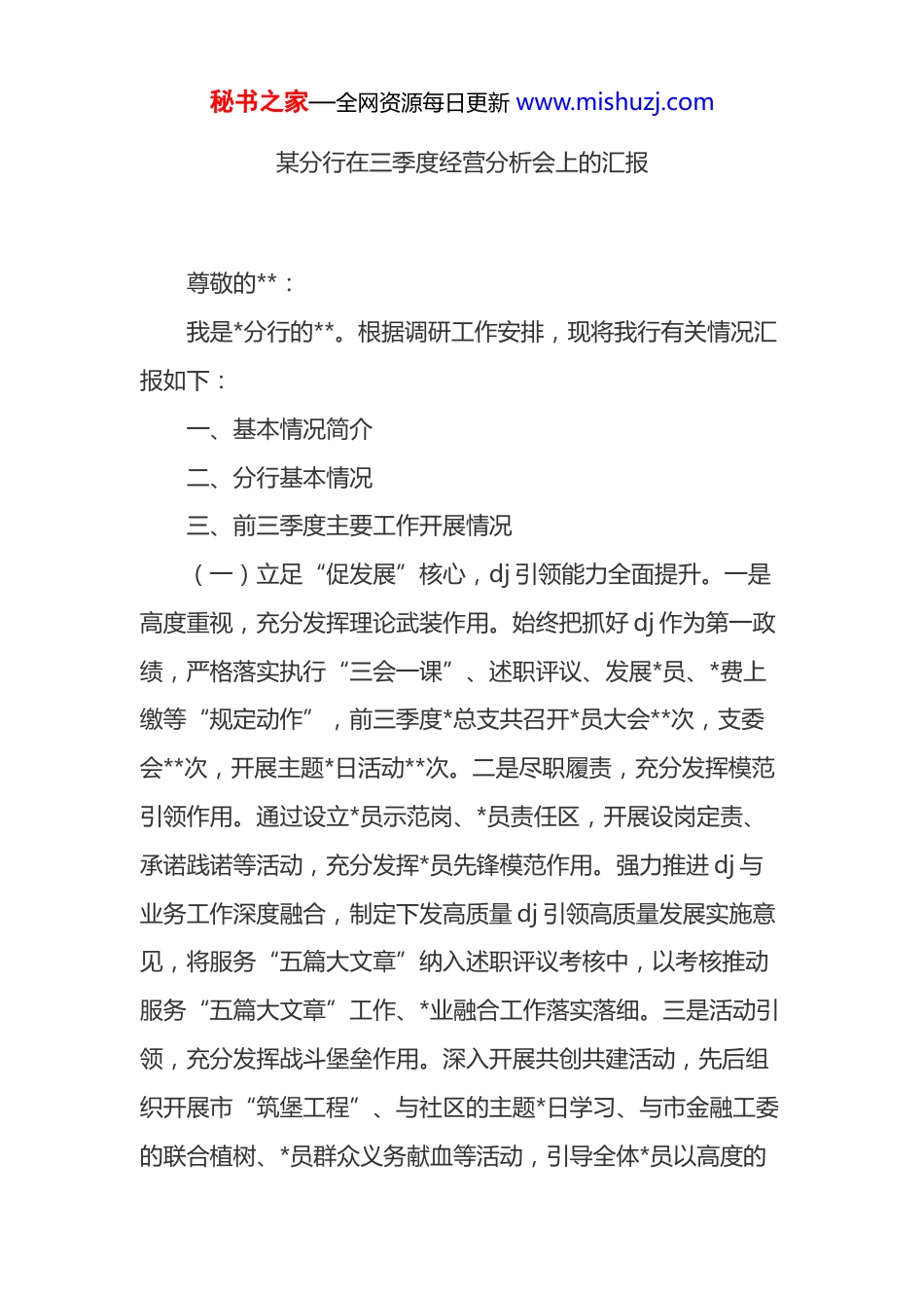 秘书之家—全网资源每日更新 www.mishuzj.com某分行在三季度经营分析会上的汇报尊敬的**:我是*分行的**。根据调研工作安排,现将我行有关情况汇报如下:一、基本情况简介二、分行基本情况三、前三季度主要工作开展情况(一)立足“促发展”核心,dj 引领能力全面提升。一是高度重视,充分发挥理论武装作用。始终把抓好 dj 作为第一政绩,严格落实执行“三会一课”、述职评议、发展*员、*费上缴等“规定动作”,前三季度*总支共召开*员大会**次,支委会**次,开展主题*日活动**次。二是尽职履责,充分发挥模范引领作用。通过设立*员示范岗、*员责任区,开展设岗定责、承诺践诺等活动,充分发挥*员先锋模范作用。强力推进 dj 与业务工作深度融合,制定下发高质量 dj 引领高质量发展实施意见,将服务“五篇大文章”纳入述职评议考核中,以考核推动服务“五篇大文章”工作、*业融合工作落实落细。三是活动引领,充分发挥战斗堡垒作用。深入开展共创共建活动,先后组织开展市“筑堡工程”、与社区的主题*日学习、与市金融工委的联合植树、*员群众义务献血等活动,引导全体*员以高度的秘书之家—全网资源每日更新 www.mishuzj.com政治自觉尽好职、履好责。扎实开展 dj 教育活动,紧扣活动要求,丰富学习形式,推动 dj 学习教育活动走深走实。(二)突出“提质效”重点,零售转型成效全面提升。一是寻求新路径,全面建立产品负责制。20xx 年以来,我行将个人条线和运营条线人员组织起来,分成多个零售业务小组,并指定小组长,每个小组负责一项产品,从产品的学习培训、销售推动、数据统计等各个方面,激发员工的潜力和创造力。结合业务发展制定分行零售竞赛方案,加强客户营销维护,做到维护好了一批大客户,成功吸引了一批新客户。二是探求新思路,实现重点业务指标突破。我行选定周末回款作为主发力点,组织辖属机构开展 pk 赛,建立了周目标计划制和支行行长每周工作汇报制,从管理层面增强零售业务的重视度,加强公私联动和私公联动,管理部室和机构互动,全力营造全员营销气氛。三是谋求新突破,切实增强客户粘性。我行借助开展社区联动献血、dj 共建、中医养生讲座等多种形式的客户活动契机,围绕网点周边拓基础客户、养高端客户,拉近了银行与客户之间的情感距离,为构建长期稳定的客户关系,实现精准营销重点产品奠定了坚实基础。(三)聚焦“上规模”目标,公司发展质量全面提升。一是抢抓机遇,持续加大重点领域信贷投放。对于政信类平台业务,我行及时做好了存量贷款的续授信及放款投放工作,并结秘书之家—全网资源每日更新 www.mishuzj.com合总分行信贷导向深入梳理平台优质项目,成功营销落地 xx 银行系统内首笔 eod 贷款项目,累计投放 1 亿元,并得到社会媒体的广泛报道。该笔贷款投放也是我行 20xx 年以来不断加大绿色信贷投放的缩影,截至目前,我行绿色贷款余额 xx 亿元,较年初增长 xx%。二是主动出击,持续提升客户综合服务质效。我行坚持以“商行+投行”服务体系,在与当地政府融资平台合作的过程中,不断调整营销策略。在各种外部监管政策及总、分行对政府平台融资收紧的情况下,加强产品运用,提升非息收入。截至三季度末办理贴现业务 xx 亿元,国内信用证福费廷xx 亿元,理财子非标信托投放 x 亿元,产品池银票办理 x 万元,产品池融资余额 x 万元,办理同业存单 x 亿元,同业存单余额 x亿元;利率债分销 x 万元(行内首单)。贸金及金市实现对公非息收入实现 x 万元。三季度在贸易、金市、投行产品中均有运用,且较好的带动非息收入,提前完成了条线非息计划。三是强化走访,坚定执行客户拜访“一号工程”。我行始终以客户为中心,坚从分行班子成员、各支行负责人、全体对公营销人员分层级开展稳客拓客营销,在新增生态客户、净增对公有效户指标方面全面完成武汉分行年度计划任务。(四)注重“夯基础”任务,全面风险管理能力全面提升。一是防风险。将风险防控放在首位,成立由行长为组长、分管行长为副组长、风险合规部为统筹管理的风险管理领导小组。秘书之家—全网资源每日更新 www.mishuzj.com截至目前,...