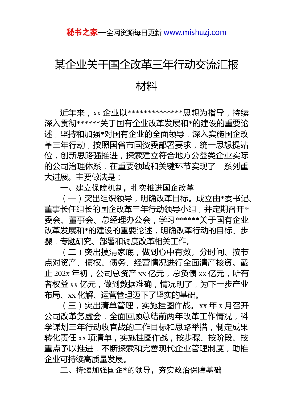 秘书之家—全网资源每日更新 www.mishuzj.com某企业关于国企改革三年行动交流汇报材料近年来,xx 企业以**************思想为指导,持续深入贯彻******关于国有企业改革发展和*的建设的重要论述,坚持和加强*对国有企业的全面领导,深入实施国企改革三年行动,按照国省市国资委部署要求,统一思想提站位,创新思路强推进,探索建立符合地方公益类企业实际的公司治理体系,在重要领域和关键环节实现了一系列重大进展。主要做法是:一、建立保障机制,扎实推进国企改革(一)突出组织领导,明确改革目标。成立由*委书记、董事长任组长的国企改革三年行动领导小组,并定期召开*委会、董事会、总经理办公会,学习******关于国有企业改革发展和*的建设的重要论述,明确改革行动的目标、步骤,专题研究、部署和调度改革相关工作。(二)突出摸清家底,做到心中有数。分时间、按节点对资产、债权、债务、经营情况进行全面清产核资。截止 202x 年初,公司总资产 xx 亿元,总负债 xx 亿元,所有者权益 xx 亿元,做到数据准确,情况明了,为下一步产业布局、xx 化解、运营管理迈下了坚实的基础。(三)突出清单管理,实施挂图作战。xx 年 x 月召开公司改革务虚会,全面回顾总结前两年改革工作情况,科学谋划三年行动收官战的工作目标和思路举措,制定成果转化责任 xx 项清单,实施挂图作战,按步骤、按阶段、按重点予以推进,不断探索和完善现代企业管理制度,助推企业可持续高质量发展。二、持续加强国企*的领导,夯实政治保障基础秘书之家—全网资源每日更新 www.mishuzj.com(一)*对国有企业的领导地位不断巩固。切实把*的领导融入公司治理各环节,建立*委把方向、管大局、保落实;董事会定战略、作决策、防风险;经理层谋经营、抓落实、强管理的治理架构。特别是今年以来,xx 次*委会 xx个事项、xx 次董事会 xx 个事项,xx 次总经理办公会 xx 个事项全部完成,形成了各司其职、各负其责、协调运转、有效制衡的公司治理机制,使*组织发挥作用组织化、制度化、具体化。(二)*对国有企业的政治建设不断加强。坚持用*的创新理论武装*员干部职工头脑,以*的政治建设为统领,坚决落实*中央、省市决策部署,全面履行经济责任、政治责任、社会责任,在疫情防控、脱贫攻坚、乡村振兴、“双碳”战略、营商环境等工作上彰显国企担当。公司(*委)获得“xx 活动成绩突出集体”、“推动 xx 发展先进集体”、“xx 省先进基层*组织”、“xx 省抗击新冠肺炎疫情先进集体”、“20xx 年 xx 省文明窗口单位”等荣誉。(三)dj 工作与生产经营深度融合发展。坚持把提高企业效益、增强企业竞争力、实现国有资产保值增值作为国有企业*组织工作的出发点和落脚点,找准基层*组织服务生产经营、联系职工群众、参与基层治理的着力点,xx余名*员干部与 xx 余名实施结对,把 dj 工作成效转换为企业发展活力和竞争实力。公司安全服务水平不断提升,被认定为 xx 标准化一级达标企业认证,满意度达到 xx%以上。三、不断完善现代企业制度,全面提升治理能力(一)坚持依法治企。建立健全以公司章程为核心的企业内部制度体系,落实各类事项的审议程序,通过职代会修改、重订和编制公司规章制度 xx 项,经营管理实现制度化、清单化。xx 年,充分运用市委巡察、政治考察结果,新增选人用人、招投标、物资采购、工程项目、资产管理财务管理、投融资等 xx 余项制度,全面构建了特色化的风险防控体系。公司被授予 20xx-20xx 年 xx 市依法治理创建秘书之家—全网资源每日更新 www.mishuzj.com活动先进单位。(二)坚持内部审计。推动审计关口前移,强化事前、事中、事后监督,分批对各分(子)公司资产、负债、损益情况、内部控制实施情况、绩效指标完成情况进行全面审计,压实经营风险识别和把关责任,加强风险辨识、评估、监测和预警。去年以来,已启动对 xx 的内部审计,目前已发现问题 xx 个,整改到位 xx 个。(三)坚持内部巡查。对标对表市委巡察,从政治纪律、组织纪律、廉洁纪律、群众纪律、工作纪律、生活纪律等 xx 个方面实施内部巡查。去年以来,已巡...
