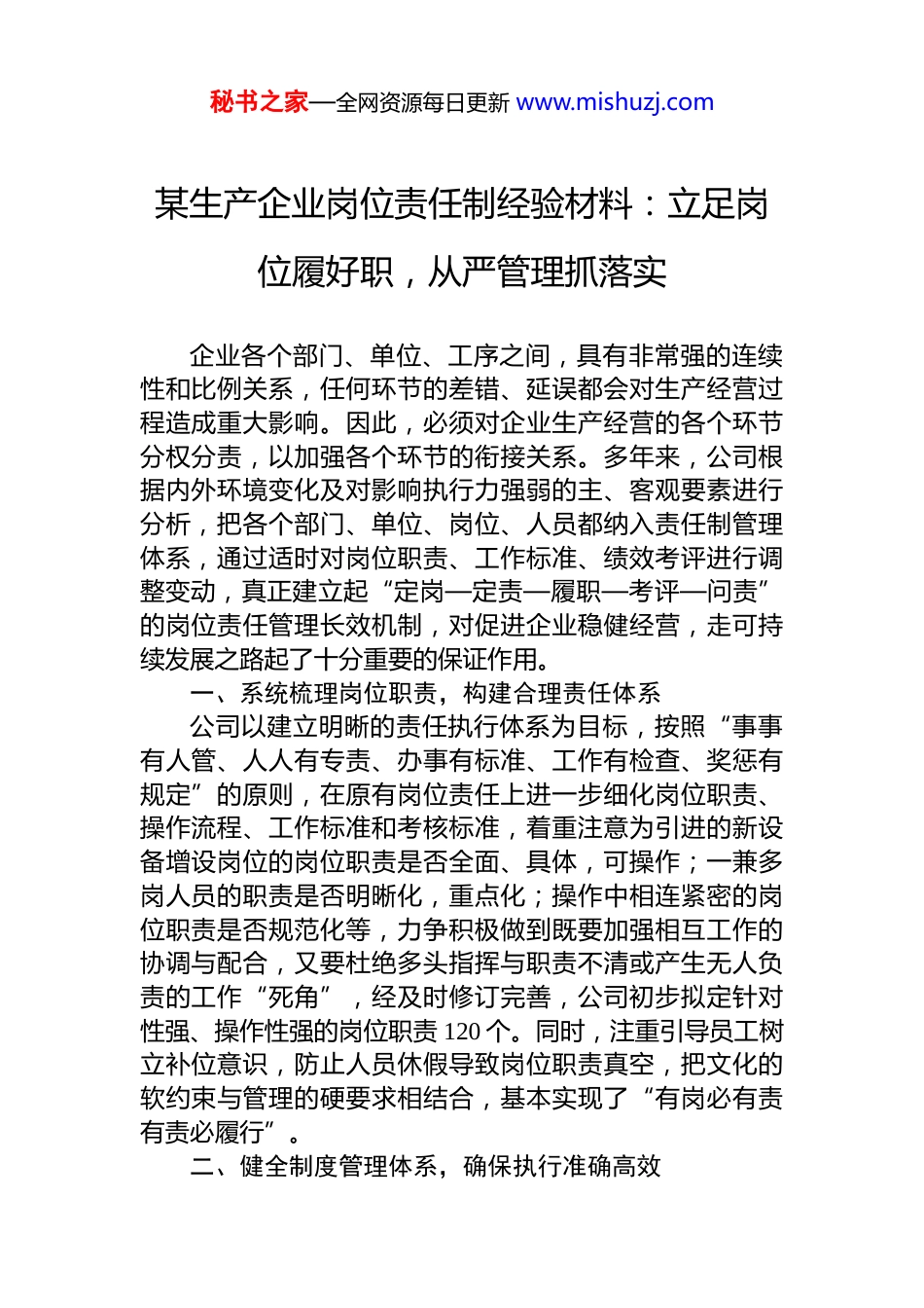 秘书之家—全网资源每日更新 www.mishuzj.com某生产企业岗位责任制经验材料:立足岗位履好职,从严管理抓落实企业各个部门、单位、工序之间,具有非常强的连续性和比例关系,任何环节的差错、延误都会对生产经营过程造成重大影响。因此,必须对企业生产经营的各个环节分权分责,以加强各个环节的衔接关系。多年来,公司根据内外环境变化及对影响执行力强弱的主、客观要素进行分析,把各个部门、单位、岗位、人员都纳入责任制管理体系,通过适时对岗位职责、工作标准、绩效考评进行调整变动,真正建立起“定岗—定责—履职—考评—问责”的岗位责任管理长效机制,对促进企业稳健经营,走可持续发展之路起了十分重要的保证作用。一、系统梳理岗位职责,构建合理责任体系公司以建立明晰的责任执行体系为目标,按照“事事有人管、人人有专责、办事有标准、工作有检查、奖惩有规定”的原则,在原有岗位责任上进一步细化岗位职责、操作流程、工作标准和考核标准,着重注意为引进的新设备增设岗位的岗位职责是否全面、具体,可操作;一兼多岗人员的职责是否明晰化,重点化;操作中相连紧密的岗位职责是否规范化等,力争积极做到既要加强相互工作的协调与配合,又要杜绝多头指挥与职责不清或产生无人负责的工作“死角”,经及时修订完善,公司初步拟定针对性强、操作性强的岗位职责 120 个。同时,注重引导员工树立补位意识,防止人员休假导致岗位职责真空,把文化的软约束与管理的硬要求相结合,基本实现了“有岗必有责有责必履行”。二、健全制度管理体系,确保执行准确高效秘书之家—全网资源每日更新 www.mishuzj.com要落实好岗位责任制,就必须让管理制度走进员工内心,形成员工的心理定势,进而转化为上标准岗、干标准活,履好职、尽好责的良好行为习惯。近年,公司以制度完善、标准规范、制度落实为着力点,围绕职权责任体系建立健全了各业务范围 98 个管理制度,并注重将制度条款与其相应岗位及业务关联,实现了制度管辖效力与工作职责的一一对应。同时,对现有各项管理流程进行改进、细化、分解,建立系统的工作标准和工作流程 50 个,对各级组织、岗位员工所负责的系统关键点工作目标、具体责任运行办法和考核标准进行详细明确,实现了“目标、责任运行、考核”的有机统一,进而达到制度、流程、职责“三位一体”的目的,并通过严格奖惩兑现,基本形成“工作重担大家挑、人人肩上有指标”的良好格局。三、丰富人才培养手段,促进业务素质提高公司以“人本主义”作为构建内部管理机制的信条,探索各种人才培养方法,丰富人才培养手段,为企业发展创造良好的人文环境。一是秉承“人人是人才,个个有舞台”的人才理念,大力培育各类人才,通过采取相马与赛马相结合的人才选拔、培养和使用机制,建立起人才成长后备库和中层后备干部人才档案;二是实行人才培养分级负责、多岗锻炼、交叉使用,分层分类推进经营管理和专业技术人员跨部门、跨业务、跨岗位任职,培养复合型人才和高精尖人才;三是加大高层次、高素质人才引进力度通过提高特殊人才待遇、搭建事业平台等“特区”政策,引进新技术产品研发等专业紧缺人才;四是不断完善“三支队伍”晋升晋级机制,健全定期评比表彰制度,形成尊重人才、崇尚创新、追求科学的价值导向;五是建立公司培训中心(学校)、开展全员系统培训,力争实现“三支队伍骨干 3 年轮训一遍、全员 5 年轮训一遍”的目标;六是将专业技师职称评定、职业技能鉴定与职工教育培训有机结合,优化人才队伍结构。秘书之家—全网资源每日更新 www.mishuzj.com四、强化动态岗位检查,推进责任执行落实岗位责任制建设的关键在于责任的落实、责权利的统一和执行力的提高,公司为切实发挥岗检作用,采取一系列措施,千抓万抓抓落实。一是加强组织领导,实施动态岗检。公司成立了工作领导小组,实行公司主要领导亲自抓、主管领导靠前抓的管理机制,并采取查看台账、现场巡查、岗位抽检、夜间抽查等形式不定期组织进行岗位检查,保证了岗检工作动态化、常态化。二是跟踪整改情况确保检查效果。通过建立岗位责任制检查问题原因分析要素表,对岗检发现的问题及...