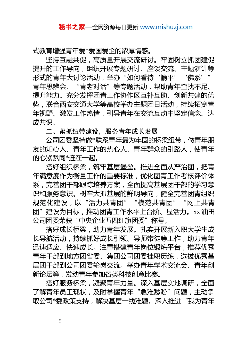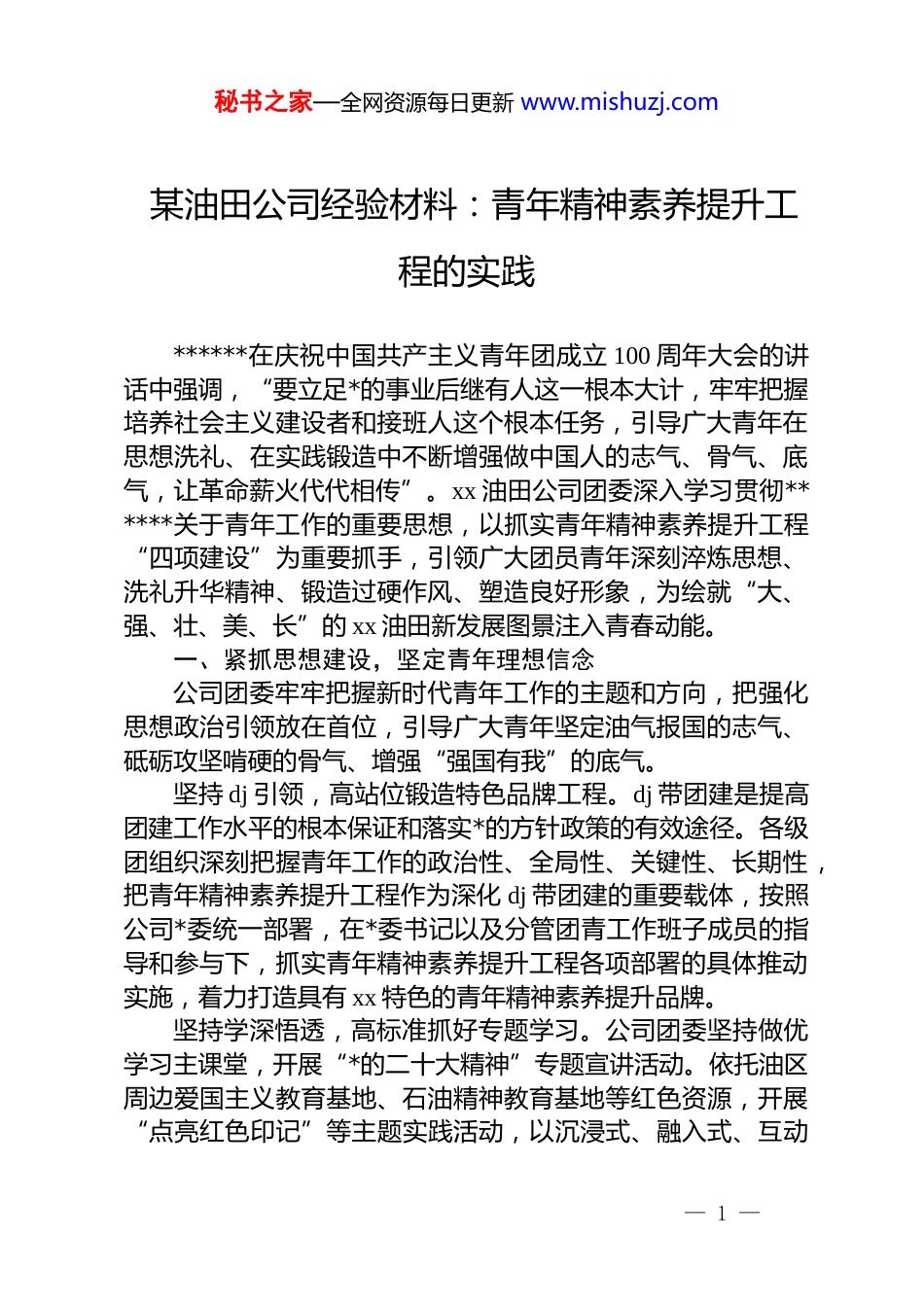 秘书之家—全网资源每日更新 www.mishuzj.com某油田公司经验材料:青年精神素养提升工程的实践******在庆祝中国共产主义青年团成立 100 周年大会的讲话中强调,“要立足*的事业后继有人这一根本大计,牢牢把握培养社会主义建设者和接班人这个根本任务,引导广大青年在思想洗礼、在实践锻造中不断增强做中国人的志气、骨气、底气,让革命薪火代代相传”。xx 油田公司团委深入学习贯彻******关于青年工作的重要思想,以抓实青年精神素养提升工程“四项建设”为重要抓手,引领广大团员青年深刻淬炼思想、洗礼升华精神、锻造过硬作风、塑造良好形象,为绘就“大、强、壮、美、长”的 xx 油田新发展图景注入青春动能。一、紧抓思想建设,坚定青年理想信念公司团委牢牢把握新时代青年工作的主题和方向,把强化思想政治引领放在首位,引导广大青年坚定油气报国的志气、砥砺攻坚啃硬的骨气、增强“强国有我”的底气。坚持 dj 引领,高站位锻造特色品牌工程。dj 带团建是提高团建工作水平的根本保证和落实*的方针政策的有效途径。各级团组织深刻把握青年工作的政治性、全局性、关键性、长期性,把青年精神素养提升工程作为深化 dj 带团建的重要载体,按照公司*委统一部署,在*委书记以及分管团青工作班子成员的指导和参与下,抓实青年精神素养提升工程各项部署的具体推动实施,着力打造具有 xx 特色的青年精神素养提升品牌。坚持学深悟透,高标准抓好专题学习。公司团委坚持做优学习主课堂,开展“*的二十大精神”专题宣讲活动。依托油区周边爱国主义教育基地、石油精神教育基地等红色资源,开展“点亮红色印记”等主题实践活动,以沉浸式、融入式、互动— 1 —秘书之家—全网资源每日更新 www.mishuzj.com式教育增强青年爱*爱国爱企的浓厚情感。坚持互融共促,高质量开展交流研讨。牢固树立抓团建促提升的工作导向,组织开展专题研讨、座谈交流、主题演讲等形式的青年大讨论活动,举办“如何看待‘躺平’‘佛系’”青年思辨会、“青老对话”等专题活动,帮助青年查找不足、提升能力。充分发挥团青工作协作区互补互助、创新共建的优势,联合西安交通大学等高校举办主题团日活动,持续拓宽青年视野、激发工作热情,引导青年在交流互动中坚定信念、达成共识。二、紧抓纽带建设,服务青年成长发展公司团委坚持做*联系青年最为牢固的桥梁纽带,做青年朋友的知心人、青年工作的热心人、青年群众的引路人,使青年的心紧紧同*连在一起。搭好组织桥梁,筑牢基层堡垒。推进全面从严治团,把青年满意度作为衡量工作的重要标准,优化团青工作考核评价体系,完善团干部跟踪培养方案,全面提高基层团干部的学习意识和服务意识。树牢大抓基层的鲜明导向,健全完善团青组织规范化建设,以“活力共青团”“模范共青团”“网上共青团”建设为目标,推动团青工作水平上台阶、显活力。xx 油田公司团委荣获“中央企业五四红旗团委”称号。搭好成长桥梁,助力青年发展。扎实开展新入职大学生成长导航活动,持续抓好成长引领、导师带徒等工作,助力青年迅速适应、快速成长。注重搭建青年岗位锻炼平台,推荐优秀青年干部到地方团省委、集团公司团委挂职历练,选拔优秀基层团干部到公司团委轮岗交流。举办青年学术交流会、青年创新论坛等,发动青年参加各类科技创意比赛。搭好服务桥梁,凝聚青年力量。深入基层实地调研,全面了解青年员工现状,及时掌握青年“急难愁盼”问题,主动争取公司*委政策支持,解决基层一线难题。深入推进“我为青年— 2 —秘书之家—全网资源每日更新 www.mishuzj.com办实事”活动,联合地方企事业单位团委开展青年联谊交友活动,举办青年集体婚礼,持续拓宽青年沟通渠道。抓好青年员工子女暑期教育,开展“萌娃讲 xx”、爱心托管、红色教育等特色活动,广大青年的获得感、安全感、幸福感不断提升。三、紧抓载体建设,激发青年青春活力公司团委坚持拓宽青年成才渠道,激发青年成长动能,不断探索优培优用实践路径,积极搭建成长舞台。丰富教培载体,助力青年锤炼技艺。高质量实施“青马工程”,全程跟进理论学习、课题研究、岗位实践等环节,不断提升青年思想政治素...