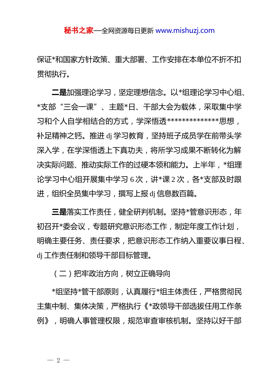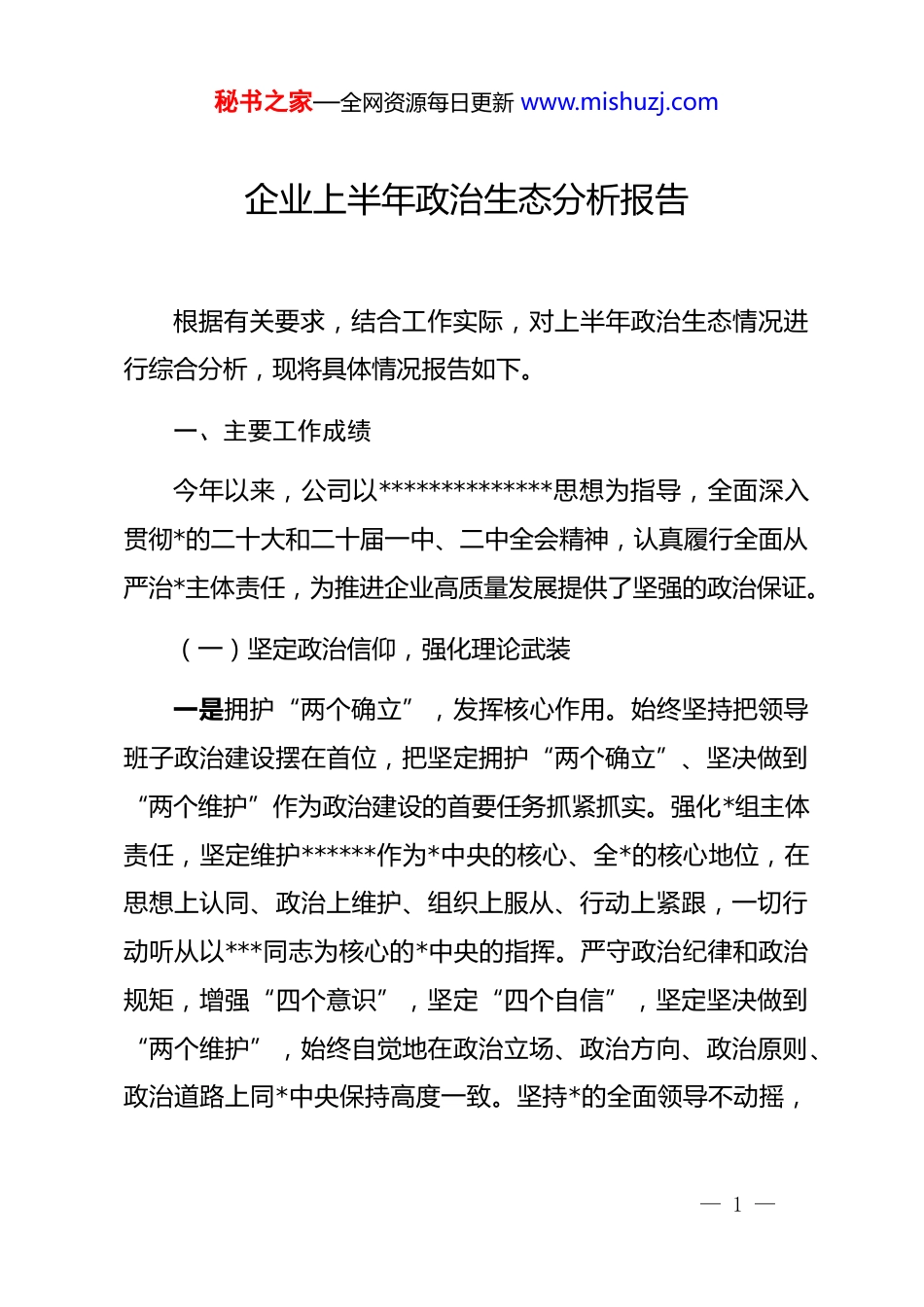 秘书之家—全网资源每日更新 www.mishuzj.com企业上半年政治生态分析报告根据有关要求,结合工作实际,对上半年政治生态情况进行综合分析,现将具体情况报告如下。一、主要工作成绩今年以来,公司以**************思想为指导,全面深入贯彻*的二十大和二十届一中、二中全会精神,认真履行全面从严治*主体责任,为推进企业高质量发展提供了坚强的政治保证。(一)坚定政治信仰,强化理论武装一是拥护“两个确立”,发挥核心作用。始终坚持把领导班子政治建设摆在首位,把坚定拥护“两个确立”、坚决做到“两个维护”作为政治建设的首要任务抓紧抓实。强化*组主体责任,坚定维护******作为*中央的核心、全*的核心地位,在思想上认同、政治上维护、组织上服从、行动上紧跟,一切行动听从以***同志为核心的*中央的指挥。严守政治纪律和政治规矩,增强“四个意识”,坚定“四个自信”,坚定坚决做到“两个维护”,始终自觉地在政治立场、政治方向、政治原则、政治道路上同*中央保持高度一致。坚持*的全面领导不动摇,— 1 —秘书之家—全网资源每日更新 www.mishuzj.com保证*和国家方针政策、重大部署、工作安排在本单位不折不扣贯彻执行。二是加强理论学习,坚定理想信念。以*组理论学习中心组、*支部“三会一课”、主题*日、干部大会为载体,采取集中学习和个人自学相结合的方式,学深悟透**************思想,补足精神之钙。推进 dj 学习教育,坚持班子成员学在前带头学深入学,在学深悟透上下真功夫,将所学习成果不断转化为解决实际问题、推动实际工作的过硬本领和能力。上半年,*组理论学习中心组开展集中学习 6 次,讲*课 2 次,各*支部及时跟进,组织全员集中学习,撰写上报 dj 信息数百篇。三是落实工作责任,健全研判机制。坚持*管意识形态,年初召开*委会议,专题研究意识形态工作,制定年度工作计划,明确主要任务、责任要求,把意识形态工作纳入重要议事日程、dj 工作责任制和领导干部目标管理。(二)把牢政治方向,树立正确导向*组坚持*管干部原则,认真履行*组主体责任,严格贯彻民主集中制、集体决策,严格执行《*政领导干部选拔任用工作条例》,明确人事管理权限,规范审查审核机制。坚持以好干部— 2 —秘书之家—全网资源每日更新 www.mishuzj.com标准选人用人,突出政治过硬、责任过硬、能力过硬,选拔勇于担当、善于作为、实绩突出的干部。一是坚持*管干部。通过每月部门会议、集中学习等方式,对中层干部压担子、提要求,尤其强调作风建设,为干部廉洁从政奠定思想基础,确保他们在政治上靠得住、工作上有本事、作风上过得硬、人民群众信得过。二是注重队伍培养。为进一步激发干部职工干事创业、争先创优的积极性和主动性,继续实施实干典型评选,评选结果不仅作为年度评先评优的重要依据,同时也是作为今后识别干部、发现干部、提拔干部的有效线索。三是关注青年干部成长。在年强干部中强化“三种意识”:即强化*要管*的意识,强化管思想才能管根本的意识,强化严管才是真爱的意识。(三)严明政治纪律,强化廉政建设一是从严落实管*治*责任。认真贯彻落实《*委(*组)落实全面从严治*主体责任规定》,做到年初有部署、年中有落实、年终有结果,半年一汇报,全年有总结。制订*风廉政建设和反腐败工作领导班子任务清单、“一把手”任务清单、班子成员— 3 —秘书之家—全网资源每日更新 www.mishuzj.com任务清单,形成*风廉政建设和反腐败工作“一岗双责”责任清单,确保工作顺利开展。二是持续开展警示教育学习。认真学习贯彻《中国共产 dj律处分条例》,开展正面典型教育、反面警示教育。组织召开警示教育会,观看警示教育片,传达上级警示教育会议精神,认真学习违反中央八项规定精神典型问题案例,组织参观廉政教育基地,用身边人身边事,教育*员干部知敬畏守底线。三是强化监督执纪问责力度。设立举报信箱,公布举报电话,开展日常监督检查,尤其紧盯节假日等重要时间节点。综合运用监督执纪“四种形态”和问责条例,发现苗头性问题及时提醒,发现违规违纪立即处理。上半年,*组书记与班子成员开展谈心谈话*人次,*委书记履行“一把手...