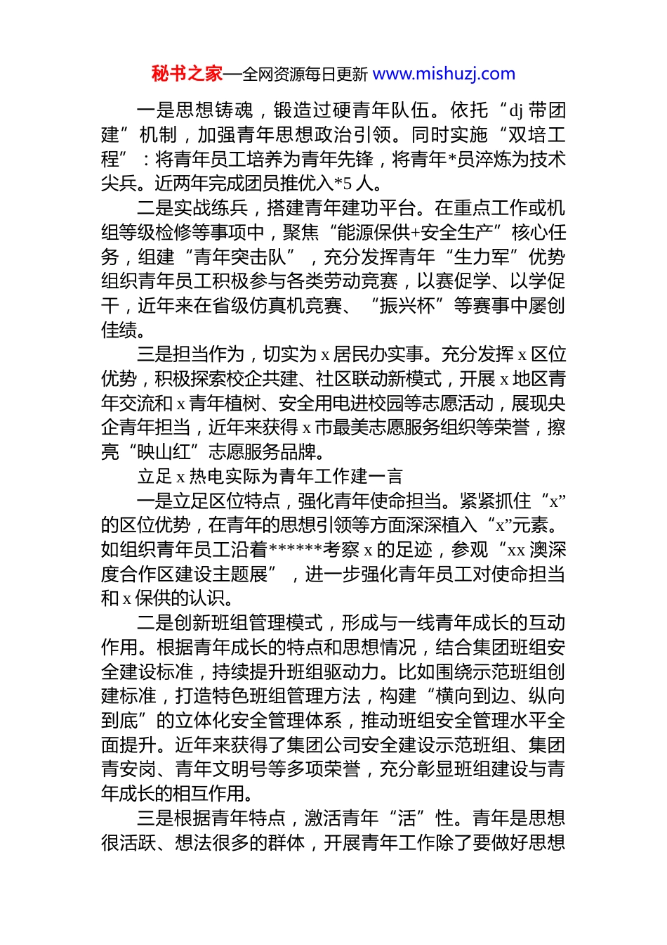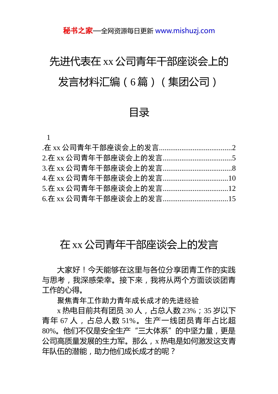 秘书之家—全网资源每日更新 www.mishuzj.com先进代表在 xx 公司青年干部座谈会上的发言材料汇编(6 篇)(集团公司)目录1.在 xx 公司青年干部座谈会上的发言.......................................22.在 xx 公司青年干部座谈会上的发言.....................................53.在 xx 公司青年干部座谈会上的发言.....................................84.在 xx 公司青年干部座谈会上的发言...................................105.在 xx 公司青年干部座谈会上的发言...................................126.在 xx 公司青年干部座谈会上的发言...................................15在 xx 公司青年干部座谈会上的发言大家好!今天能够在这里与各位分享团青工作的实践与思考,我深感荣幸。接下来,我将从两个方面谈谈团青工作的心得。聚焦青年工作助力青年成长成才的先进经验x 热电目前共有团员 30 人,占总人数 23%;35 岁以下青年 67 人,占总人数 51%。生产一线团员青年占比超80%。他们不仅是安全生产“三大体系”的中坚力量,更是公司高质量发展的生力军。那么,x 热电是如何激发这支青年队伍的潜能,助力他们成长成才的呢?秘书之家—全网资源每日更新 www.mishuzj.com一是思想铸魂,锻造过硬青年队伍。依托“dj 带团建”机制,加强青年思想政治引领。同时实施“双培工程”:将青年员工培养为青年先锋,将青年*员淬炼为技术尖兵。近两年完成团员推优入*5 人。二是实战练兵,搭建青年建功平台。在重点工作或机组等级检修等事项中,聚焦“能源保供+安全生产”核心任务,组建“青年突击队”,充分发挥青年“生力军”优势组织青年员工积极参与各类劳动竞赛,以赛促学、以学促干,近年来在省级仿真机竞赛、“振兴杯”等赛事中屡创佳绩。三是担当作为,切实为 x 居民办实事。充分发挥 x 区位优势,积极探索校企共建、社区联动新模式,开展 x 地区青年交流和 x 青年植树、安全用电进校园等志愿活动,展现央企青年担当,近年来获得 x 市最美志愿服务组织等荣誉,擦亮“映山红”志愿服务品牌。立足 x 热电实际为青年工作建一言一是立足区位特点,强化青年使命担当。紧紧抓住“x”的区位优势,在青年的思想引领等方面深深植入“x”元素。如组织青年员工沿着******考察 x 的足迹,参观“xx 澳深度合作区建设主题展”,进一步强化青年员工对使命担当和 x 保供的认识。二是创新班组管理模式,形成与一线青年成长的互动作用。根据青年成长的特点和思想情况,结合集团班组安全建设标准,持续提升班组驱动力。比如围绕示范班组创建标准,打造特色班组管理方法,构建“横向到边、纵向到底”的立体化安全管理体系,推动班组安全管理水平全面提升。近年来获得了集团公司安全建设示范班组、集团青安岗、青年文明号等多项荣誉,充分彰显班组建设与青年成长的相互作用。三是根据青年特点,激活青年“活”性。青年是思想很活跃、想法很多的群体,开展青年工作除了要做好思想秘书之家—全网资源每日更新 www.mishuzj.com引领,也需要时刻回应青年需要,及时听取青年的建议和真实想法,发动其他团干日常收集团员的合理需求。2024年开展的活动参与率上升 65%,初步让青年从“宅”走出来,进一步激发他们参与活动的积极性和参与各项工作的主动性,逐步实现青年成长和企业发展的双向奔赴。围绕发展新质生产力为青年发展献一策团员青年有活力、有创新力、有执行力,是 x 公司经营发展的骨干力量。但在激发他们的“三力”方面,可能欠缺一些有针对性的机制,我认为,x 公司可以进一步完善青年员工创新激励机制,重点从两方面发力:一方面可扩大“五小”创新活动覆盖面,设立专项奖金,对节能降耗、工艺改进等生产一线创新成果实施“即时申报、快速评审及时奖励”机制;另一方面配套建立创新积分与职级晋升评优评先挂钩的长效机制,让青年人才的“金点子”能落地、“好苗子”有舞台,真正将创新活力转化为发展新质生产力的强劲动能。下一步,我们将进一步学习贯彻******关于青年工作的重要思想,立足 x 港澳大湾区建设前沿阵地,以 xx 深度合作区...