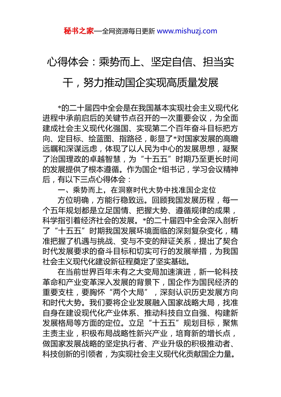 秘书之家—全网资源每日更新 www.mishuzj.com心得体会:乘势而上、坚定自信、担当实干,努力推动国企实现高质量发展*的二十届四中全会是在我国基本实现社会主义现代化进程中承前启后的关键节点召开的一次重要会议,为全面建成社会主义现代化强国、实现第二个百年奋斗目标把方向、定目标、绘蓝图、指路径,彰显了*对国家发展的高瞻远瞩和深谋远虑,体现了以人民为中心的发展思想,凝聚了治国理政的卓越智慧,为“十五五”时期乃至更长时间的发展提供了根本遵循。作为国企*组书记,学习会议精神后,有以下三点心得体会:一、乘势而上,在洞察时代大势中找准国企定位方位明确,方能行稳致远。回顾我国发展历程,每一个五年规划都是立足国情、把握大势、遵循规律的成果,科学指引着经济社会的发展。*的二十届四中全会深入剖析了“十五五”时期我国发展环境面临的深刻复杂变化,精准把握了机遇与挑战、变与不变的辩证关系,提出了契合时代发展要求的奋斗目标和切实可行的发展举措,为我国社会主义现代化建设新征程奠定了坚实基础。在当前世界百年未有之大变局加速演进,新一轮科技革命和产业变革深入发展的背景下,国企作为国民经济的重要支柱,要胸怀“两个大局”,深刻认识历史发展方向和时代大势。我们要将企业发展融入国家战略大局,找准自身在建设现代化产业体系、推动科技自立自强、构建新发展格局等方面的定位。立足“十五五”规划目标,聚焦主责主业,积极布局战略性新兴产业,培育新的增长点,做国家发展战略的坚定执行者、产业升级的积极推动者、科技创新的引领者,为实现社会主义现代化贡献国企力量。秘书之家—全网资源每日更新 www.mishuzj.com二、坚定自信,在增强政治定力中走好国企发展之路“十四五”时期,我国在复杂严峻的国际形势和艰巨繁重的国内改革发展稳定任务面前,取得了重大成就,经济实力、科技实力、综合国力跃上新台阶,充分彰显了中国共产*领导和中国特色社会主义制度的显著优势。*的坚强领导是我们战胜一切困难和挑战的根本保障,是国企不断发展壮大的“定海神针”。面对国际环境的不确定性和各种风险挑战,国企要保持政治定力,坚定“四个自信”、做到“两个维护”。我们要始终坚持*的全面领导,确保企业发展的正确方向。在企业改革发展过程中,要充分发挥*组织的领导核心和政治核心作用,把*的领导融入公司治理各环节,确保*的路线方针政策和决策部署在企业得到贯彻落实。同时,要积极践行社会主义核心价值观,弘扬国企精神,增强企业的凝聚力和向心力。作为国企*组书记,要带领全体员工坚定不移地走中国特色国有企业发展道路,不为外界干扰所动摇在激烈的市场竞争中站稳脚跟,实现企业的高质量发展。三、担当实干,在落实目标任务中办好国企之事办好自己的事是应对外部风险挑战的制胜法宝。*的二十届四中全会为“十五五”时期的发展描绘了宏伟蓝图,明确了各项任务和目标。国企作为经济发展的主力军,要以高度的责任感和使命感,将全会精神落实到具体工作中。一是聚焦主责主业,推动产业升级。立足全会提出的建设现代化产业体系的要求,国企要加大在实体经济领域的投入,巩固壮大实体经济根基。聚焦智能化、绿色化、融合化方向,加快传统产业转型升级,培育壮大新兴产业和未来产业。加强与产业链上下游企业的合作,构建产业生态,提升产业竞争力。例如,在制造业领域,要加大技术创新力度,提高产品质量和生产效率,推动制造业向高端化、智能化、绿色化发展。二是强化科技创新,引领新质生产力发展。抓住新一秘书之家—全网资源每日更新 www.mishuzj.com轮科技革命和产业变革的历史机遇,国企要加大科技创新投入,提升自主创新能力。加强原始创新和关键核心技术攻关,推动科技创新和产业创新深度融合。积极参与国家重大科技项目,加强与高校、科研机构的合作,建立产学研用协同创新机制。同时,要注重人才培养和引进,打造一支高素质的科技人才队伍。通过科技创新,不断催生新质生产力,为企业发展注入新动力。三是深化改革攻坚,增强企业活力。坚持和完善社会主义基本经济制度,国企要加快构建高水平社会主义市场经济体制。深化企业内部改革,完...