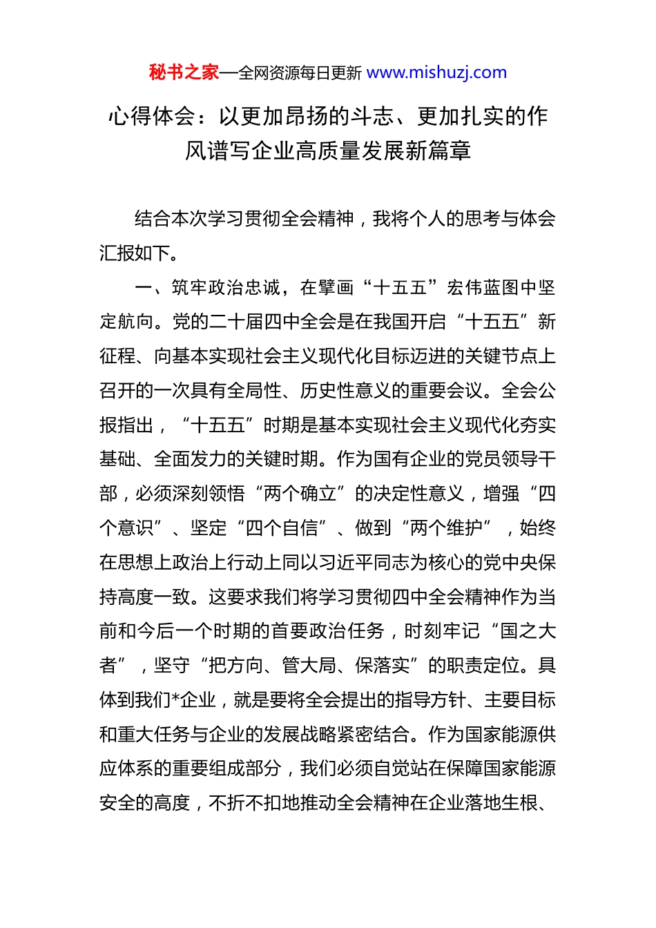 秘书之家—全网资源每日更新 www.mishuzj.com心得体会:以更加昂扬的斗志、更加扎实的作风谱写企业高质量发展新篇章 结合本次学习贯彻全会精神,我将个人的思考与体会汇报如下。一、筑牢政治忠诚,在擘画“十五五”宏伟蓝图中坚定航向。党的二十届四中全会是在我国开启“十五五”新征程、向基本实现社会主义现代化目标迈进的关键节点上召开的一次具有全局性、历史性意义的重要会议。全会公报指出,“十五五”时期是基本实现社会主义现代化夯实基础、全面发力的关键时期。作为国有企业的党员领导干部,必须深刻领悟“两个确立”的决定性意义,增强“四个意识”、坚定“四个自信”、做到“两个维护”,始终在思想上政治上行动上同以习近平同志为核心的党中央保持高度一致。这要求我们将学习贯彻四中全会精神作为当前和今后一个时期的首要政治任务,时刻牢记“国之大者”,坚守“把方向、管大局、保落实”的职责定位。具体到我们*企业,就是要将全会提出的指导方针、主要目标和重大任务与企业的发展战略紧密结合。作为国家能源供应体系的重要组成部分,我们必须自觉站在保障国家能源安全的高度,不折不扣地推动全会精神在企业落地生根、秘书之家—全网资源每日更新 www.mishuzj.com开花结果,确保企业的发展始终沿着党指引的正确方向前进,成为党和国家最可信赖的依靠力量。二、聚焦高质量发展,在新征程上培育和壮大新质生产力。高质量发展是全面建设社会主义现代化国家的首要任务。四中全会公报和新闻发布会解读都明确强调,要坚持把发展经济的着力点放在实体经济上,全面贯彻新发展理念,加快构建新发展格局,着力推动高质量发展。全会提出的一个鲜明导向,就是要加快培育新质生产力,推动科技创新和产业创新深度融合。这为我们传统能源企业的转型升级指明了核心路径。对于我们*煤矿而言,学习贯彻全会精神,绝不能停留在口号上,必须转化为推动企业发展的实际行动。我们要摆脱传统路径依赖,将发展新质生产力作为破解发展难题、增强发展动力的关键之举。一要向“智”转型,大力推进智能化矿山建设,以 5G、工业互联网、大数据等技术赋能生产全流程,建设更多智能化采掘工作面,实现“少人则安、无人则安”。二要向“绿”转型,坚定不移走生态优先、绿色发展的道路,探索实践绿色开采、保水开采等技术,做好矿区生态修复和土地复垦,将“黑色煤炭”转化为“绿色能源”。三要向“新”转型,积极延伸产业链、提升价值链,探索煤炭清洁高效利用的新路径,在煤基新材料、煤化工等领域寻求突破,秘书之家—全网资源每日更新 www.mishuzj.com将资源优势转化为产业优势和经济优势,为企业高质量发展注入源源不断的内生动力。三、坚持统筹兼顾,在发展与安全的良性互动中行稳致远。四中全会深刻分析了我国发展面临的内外部环境,强调要增强忧患意识,坚持底线思维,统筹好发展和安全两件大事。对于*行业来说,安全是天字号的大事,是企业生存发展的基石,也是对职工生命健康、对社会和谐稳定应尽的最大责任。全会强调“严格落实安全生产责任”,这为我们的安全工作敲响了警钟、划出了红线。我们必须以“时时放心不下”的责任感,将安全生产的神经绷得更紧、责任压得更实。一方面,要持续完善安全生产责任体系和风险分级管控、隐患排查治理双重预防机制,运用智能化手段提升安全监测预警能力,坚决杜绝重特大事故发生。另一方面,要将“大安全”理念贯穿企业运营全过程。这不仅包括生产安全,还包括经营安全、环保安全、意识形态安全等。在当前复杂严峻的经济形势下,要有效防范化解经营风险,确保企业健康平稳运行。同时,要牢牢掌握意识形态工作领导权,筑牢职工思想防线,凝聚起同心同德、共促发展的强大正能量,切实以一域之稳服务全局之安。四、强化党建引领,在深化改革创新中激发组织活秘书之家—全网资源每日更新 www.mishuzj.com力。办好中国的事情,关键在党。全会《建议》明确提出要坚持和加强党的全面领导。作为国有企业,坚持党的领导、加强党的建设是我们的“根”和“魂”。我们*煤矿在过去的发展中,正是得益于党建工作与生产经营的深度融合,才取得了显著成绩。立足新...