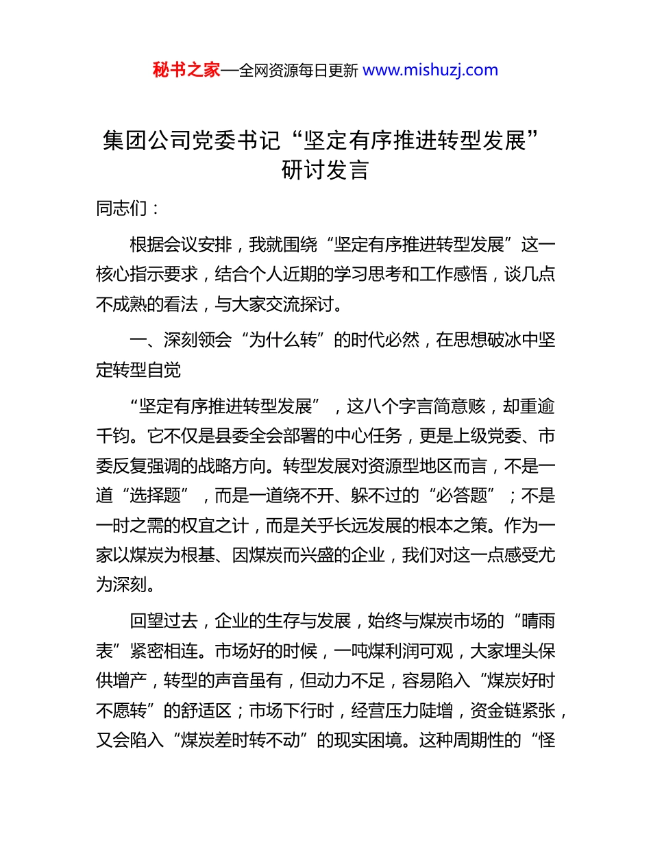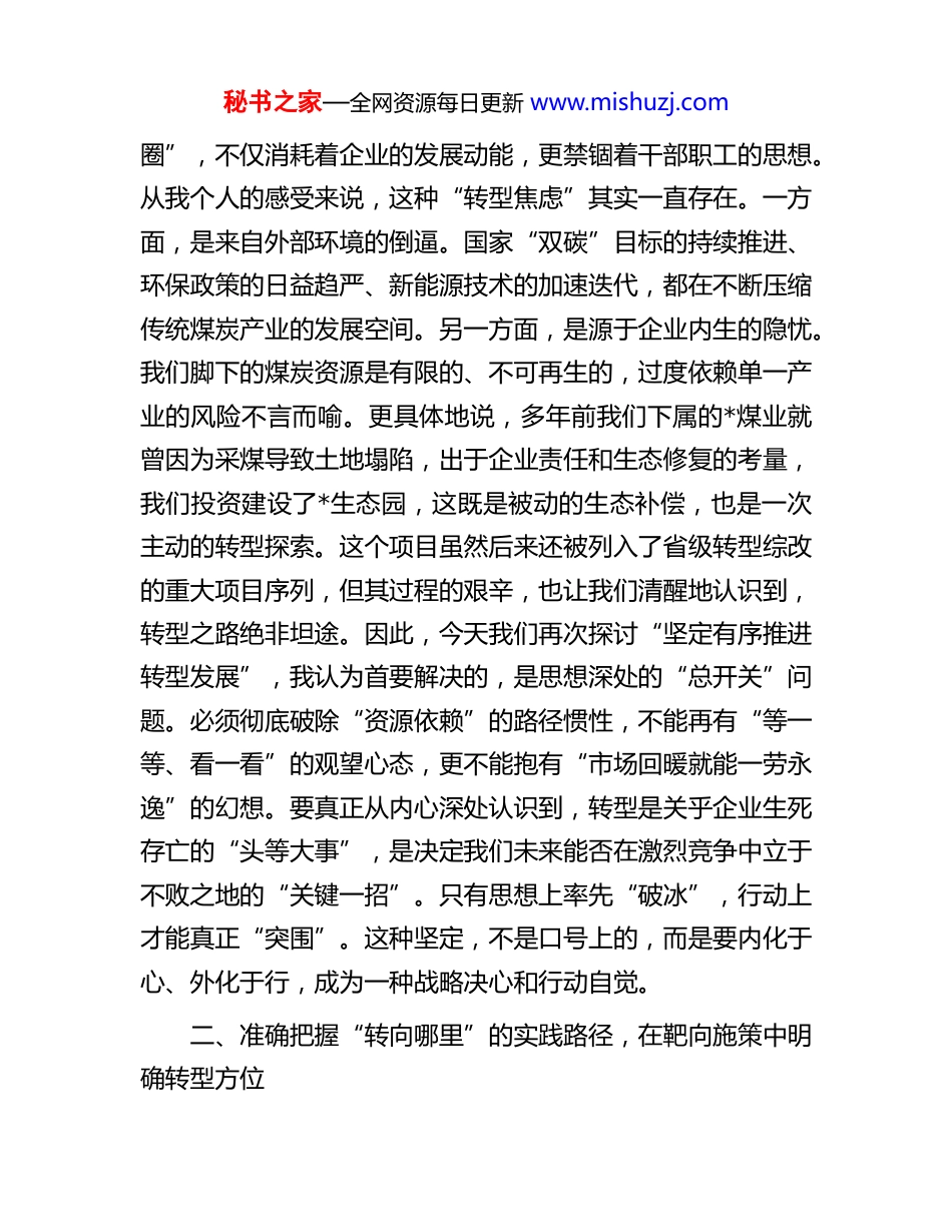 秘书之家—全网资源每日更新 www.mishuzj.com集团公司党委书记“坚定有序推进转型发展”研讨发言同志们:根据会议安排,我就围绕“坚定有序推进转型发展”这一核心指示要求,结合个人近期的学习思考和工作感悟,谈几点不成熟的看法,与大家交流探讨。一、深刻领会“为什么转”的时代必然,在思想破冰中坚定转型自觉“坚定有序推进转型发展”,这八个字言简意赅,却重逾千钧。它不仅是县委全会部署的中心任务,更是上级党委、市委反复强调的战略方向。转型发展对资源型地区而言,不是一道“选择题”,而是一道绕不开、躲不过的“必答题”;不是一时之需的权宜之计,而是关乎长远发展的根本之策。作为一家以煤炭为根基、因煤炭而兴盛的企业,我们对这一点感受尤为深刻。回望过去,企业的生存与发展,始终与煤炭市场的“晴雨表”紧密相连。市场好的时候,一吨煤利润可观,大家埋头保供增产,转型的声音虽有,但动力不足,容易陷入“煤炭好时不愿转”的舒适区;市场下行时,经营压力陡增,资金链紧张,又会陷入“煤炭差时转不动”的现实困境。这种周期性的“怪秘书之家—全网资源每日更新 www.mishuzj.com圈”,不仅消耗着企业的发展动能,更禁锢着干部职工的思想。从我个人的感受来说,这种“转型焦虑”其实一直存在。一方面,是来自外部环境的倒逼。国家“双碳”目标的持续推进、环保政策的日益趋严、新能源技术的加速迭代,都在不断压缩传统煤炭产业的发展空间。另一方面,是源于企业内生的隐忧。我们脚下的煤炭资源是有限的、不可再生的,过度依赖单一产业的风险不言而喻。更具体地说,多年前我们下属的*煤业就曾因为采煤导致土地塌陷,出于企业责任和生态修复的考量,我们投资建设了*生态园,这既是被动的生态补偿,也是一次主动的转型探索。这个项目虽然后来还被列入了省级转型综改的重大项目序列,但其过程的艰辛,也让我们清醒地认识到,转型之路绝非坦途。因此,今天我们再次探讨“坚定有序推进转型发展”,我认为首要解决的,是思想深处的“总开关”问题。必须彻底破除“资源依赖”的路径惯性,不能再有“等一等、看一看”的观望心态,更不能抱有“市场回暖就能一劳永逸”的幻想。要真正从内心深处认识到,转型是关乎企业生死存亡的“头等大事”,是决定我们未来能否在激烈竞争中立于不败之地的“关键一招”。只有思想上率先“破冰”,行动上才能真正“突围”。这种坚定,不是口号上的,而是要内化于心、外化于行,成为一种战略决心和行动自觉。二、准确把握“转向哪里”的实践路径,在靶向施策中明确转型方位秘书之家—全网资源每日更新 www.mishuzj.com想清楚了“为什么转”,接下来的关键就是“转向哪里”县委全会提出的“有序”二字,我认为核心要义在于尊重规律、讲求科学、稳扎稳打,不能脱离实际、盲目冒进。对于我们这样一家传统的能源企业,转型发展绝不意味着要另起炉灶、推倒重来,而是要在巩固根基的前提下,进行优势的再造和动能的转换。结合企业实际,我思考有三个主要方向。第一,立足主业,向“精”向“绿”延伸。煤炭是我们的“压舱石”和“稳定器”,任何时候都不能轻易动摇。在当前乃至未来一个时期,扛牢能源保供的政治责任依然是我们的首要任务。但“保供”不等于“傻大黑粗”地挖煤卖煤。转型,首先要从煤炭自身的革命开始。这要求我们必须在存量上做文章,推动产业“升链”。一方面是智能化改造。要持续加大投入,推进工作面无人化、系统智能化,在减人提效、保障安全的同时,实现资源开采效率的最大化。另一方面是绿色化开采。大力推广应用保水开采、充填开采等绿色技术,最大限度减少对生态环境的扰动,改变过去“黑色 GDP”的形象。更重要的是,要推动煤炭由“燃料”向“原料”和“材料”转变。我们过去也曾尝试过构建“采煤—洗煤—炼焦—炼镁”的循环链条,但因种种原因中断。历史的教训值得反思。今天,在新技术、新工艺的支持下,我们是否可以重新审视煤化工、煤基新材料等领域的发展潜力,拉长产业链条,提升产品附加值,真正把资源优势转化为高质量发展的产业优势。秘书之家—全网资源每日更新 www.mishuzj.com第二,适度多元,向“新...