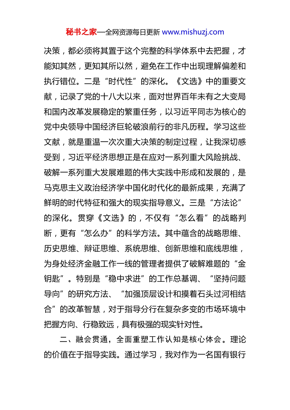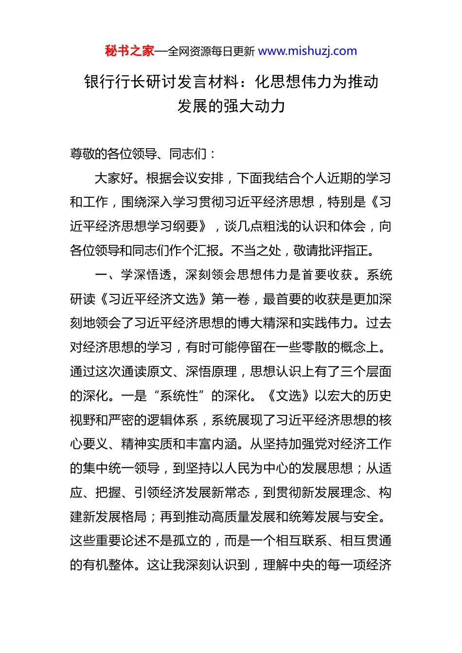 秘书之家—全网资源每日更新 www.mishuzj.com银行行长研讨发言材料:化思想伟力为推动发展的强大动力 尊敬的各位领导、同志们:大家好。根据会议安排,下面我结合个人近期的学习和工作,围绕深入学习贯彻习近平经济思想,特别是《习近平经济思想学习纲要》,谈几点粗浅的认识和体会,向各位领导和同志们作个汇报。不当之处,敬请批评指正。一、学深悟透,深刻领会思想伟力是首要收获。系统研读《习近平经济文选》第一卷,最首要的收获是更加深刻地领会了习近平经济思想的博大精深和实践伟力。过去对经济思想的学习,有时可能停留在一些零散的概念上。通过这次通读原文、深悟原理,思想认识上有了三个层面的深化。一是“系统性”的深化。《文选》以宏大的历史视野和严密的逻辑体系,系统展现了习近平经济思想的核心要义、精神实质和丰富内涵。从坚持加强党对经济工作的集中统一领导,到坚持以人民为中心的发展思想;从适应、把握、引领经济发展新常态,到贯彻新发展理念、构建新发展格局;再到推动高质量发展和统筹发展与安全。这些重要论述不是孤立的,而是一个相互联系、相互贯通的有机整体。这让我深刻认识到,理解中央的每一项经济秘书之家—全网资源每日更新 www.mishuzj.com决策,都必须将其置于这个完整的科学体系中去把握,才能知其然,更知其所以然,避免在工作中出现理解偏差和执行错位。二是“时代性”的深化。《文选》中的重要文献,记录了党的十八大以来,面对世界百年未有之大变局和国内改革发展稳定的繁重任务,以习近平同志为核心的党中央领导中国经济巨轮破浪前行的非凡历程。学习这些文献,就是重温一次次重大决策的制定过程,让我深切感受到,习近平经济思想正是在应对一系列重大风险挑战、破解一系列重大发展难题的伟大实践中形成和发展的,是马克思主义政治经济学中国化时代化的最新成果,充满了鲜明的时代特征和强大的现实指导意义。三是“方法论”的深化。贯穿《文选》的,不仅有“怎么看”的战略判断,更有“怎么办”的科学方法。其中蕴含的战略思维、历史思维、辩证思维、系统思维、创新思维和底线思维,为身处经济金融工作一线的管理者提供了破解难题的“金钥匙”。特别是“稳中求进”的工作总基调、“坚持问题导向”的研究方法、“加强顶层设计和摸着石头过河相结合”的改革智慧,对于指导分行在复杂多变的市场环境中把握方向、行稳致远,具有极强的现实针对性。二、融会贯通,全面重塑工作认知是核心体会。理论的价值在于指导实践。通过学习,我对作为一名国有银行秘书之家—全网资源每日更新 www.mishuzj.com市级分行负责人的职责使命,有了更深层次的认识和体会。这种体会,核心是对银行工作三大关系的再审视、再定位。第一,是对“利”与“义”关系的再审视,深刻体悟金融工作的人民性。习近平经济思想最鲜明的底色就是“人民至上”。《文选》中反复强调,要坚持以人民为中心的发展思想,发展的成果要由人民共享。这让我深刻反思,银行经营不能只见“商业性”,不见“人民性”;不能只算“经济账”,不算“社会账”。作为*市的地方金融主力军,分行的发展与*市千万市民的福祉紧密相连。单纯追求利润最大化不是最终目的,如何通过金融服务,支持实体经济创造更多就业岗位,如何为小微企业和个体工商户纾困解难,如何在服务城市建设和民生改善中实现自身价值,这才是金融工作的“国之大者”,是必须坚守的“义”。第二,是对“虚”与“实”关系的再审视,深刻体悟金融服务实体经济的天职。“金融是实体经济的血脉,为实体经济服务是金融的天职”。这是《文选》中反复强调的核心观点。在学习中我认识到,金融业的繁荣,绝不能建立在实体经济的羸弱之上。任何脱离实体经济需求的金融创新,都可能演变为“脱实向虚”的风险隐患。这要求在日常工作中,必须时刻校准服务航向,将信贷资源、金融产品、服务精力真正倾注到实体经济最需要的地秘书之家—全网资源每日更新 www.mishuzj.com方。分行的资产负债表,不仅要健康、安全,更要成为反映地方经济活力的“晴雨表”和支持产业升级的“助推器”。第三,是对“进”与“稳”关系的再审视,深刻体悟统筹发...