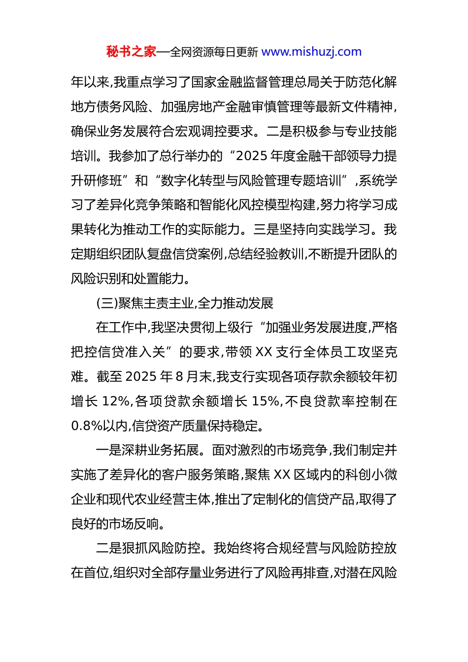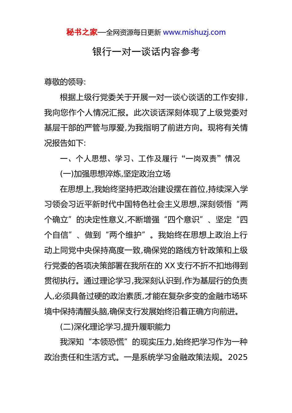 秘书之家—全网资源每日更新 www.mishuzj.com银行一对一谈话内容参考 尊敬的领导:根据上级行党委关于开展一对一谈心谈话的工作安排,我向您作个人情况汇报。此次谈话深刻体现了上级党委对基层干部的严管与厚爱,为我指明了前进方向。现将有关情况报告如下:一、个人思想、学习、工作及履行“一岗双责”情况(一)加强思想淬炼,坚定政治立场在思想上,我始终坚持把政治建设摆在首位,持续深入学习领会习近平新时代中国特色社会主义思想,深刻领悟“两个确立”的决定性意义,不断增强“四个意识”、坚定“四个自信”、做到“两个维护”。我始终在思想上政治上行动上同党中央保持高度一致,确保党的路线方针政策和上级行党委的各项决策部署在我所在的 XX 支行不折不扣地得到贯彻执行。通过理论学习,我深刻认识到,作为基层行的负责人,必须具备过硬的政治素质,才能在复杂多变的金融市场环境中保持清醒头脑,确保支行发展始终沿着正确方向前进。(二)深化理论学习,提升履职能力我深知“本领恐慌”的现实压力,始终把学习作为一种政治责任和生活方式。一是系统学习金融政策法规。2025秘书之家—全网资源每日更新 www.mishuzj.com年以来,我重点学习了国家金融监督管理总局关于防范化解地方债务风险、加强房地产金融审慎管理等最新文件精神,确保业务发展符合宏观调控要求。二是积极参与专业技能培训。我参加了总行举办的“2025 年度金融干部领导力提升研修班”和“数字化转型与风险管理专题培训”,系统学习了差异化竞争策略和智能化风控模型构建,努力将学习成果转化为推动工作的实际能力。三是坚持向实践学习。我定期组织团队复盘信贷案例,总结经验教训,不断提升团队的风险识别和处置能力。(三)聚焦主责主业,全力推动发展在工作中,我坚决贯彻上级行“加强业务发展进度,严格把控信贷准入关”的要求,带领 XX 支行全体员工攻坚克难。截至 2025 年 8 月末,我支行实现各项存款余额较年初增长 12%,各项贷款余额增长 15%,不良贷款率控制在0.8%以内,信贷资产质量保持稳定。一是深耕业务拓展。面对激烈的市场竞争,我们制定并实施了差异化的客户服务策略,聚焦 XX 区域内的科创小微企业和现代农业经营主体,推出了定制化的信贷产品,取得了良好的市场反响。二是狠抓风险防控。我始终将合规经营与风险防控放在首位,组织对全部存量业务进行了风险再排查,对潜在风险秘书之家—全网资源每日更新 www.mishuzj.com点逐一建立台账,明确化解措施与时限。在信贷审批中,我坚持原则,严格执行授信标准,确保每一笔贷款都经得起检验。三是注重团队建设。按照您提出的“关注员工成长,搭建良好的职业发展平台”的要求,我行建立了“导师制”新员工培养计划,并为骨干员工规划了清晰的职业发展路径,有效激发了团队的积极性与创造力。(四)严格履行“一岗双责”,抓好党风廉政建设我始终牢记自己作为支行负责人的双重责任,坚持业务工作与党风廉政建设同谋划、同部署、同落实。我定期主持召开支部的专题会议,组织学习党纪法规和金融领域违纪违法典型案例,以案为鉴,教育引导全体员工作知敬畏、存戒惧、守底线。同时,我将廉洁从业要求融入业务流程,在信贷审批、财务报销等关键环节加强监督,确保权力在阳光下运行,营造了风清气正的干事创业氛围。二、个人廉洁自律与接受监督情况(一)对正确履职用权、自觉接受监督的认识和态度我深刻认识到,岗位所赋予的权力来自于党和人民,只能用来为公众服务、为银行发展尽责,绝不能异化为谋取私利的工具。因此,我始终对权力怀有敬畏之心,坚持依法用权、秉公用权、廉洁用权。我将监督视为最好的保护、最真诚的爱护,主动将自己的工作和生活置于组织和群众的监督之秘书之家—全网资源每日更新 www.mishuzj.com下,习惯在受监督和约束的环境中工作生活。无论是来自上级纪委的监督检查,还是班子成员间的相互监督、普通员工的日常监督,我都诚恳接受、积极配合,有则改之、无则加勉。(二)贯彻落实中央八项规定精神及遵守廉洁自律规定情况我始终把落实中央八项规定精神作为一项严肃的政治任务,带头严格执行。在公务接待、差旅报销等方面,我均按最低标准执行,从未超标。我坚决抵制任何形式的“人情往来”...