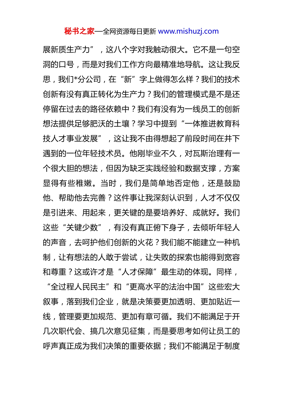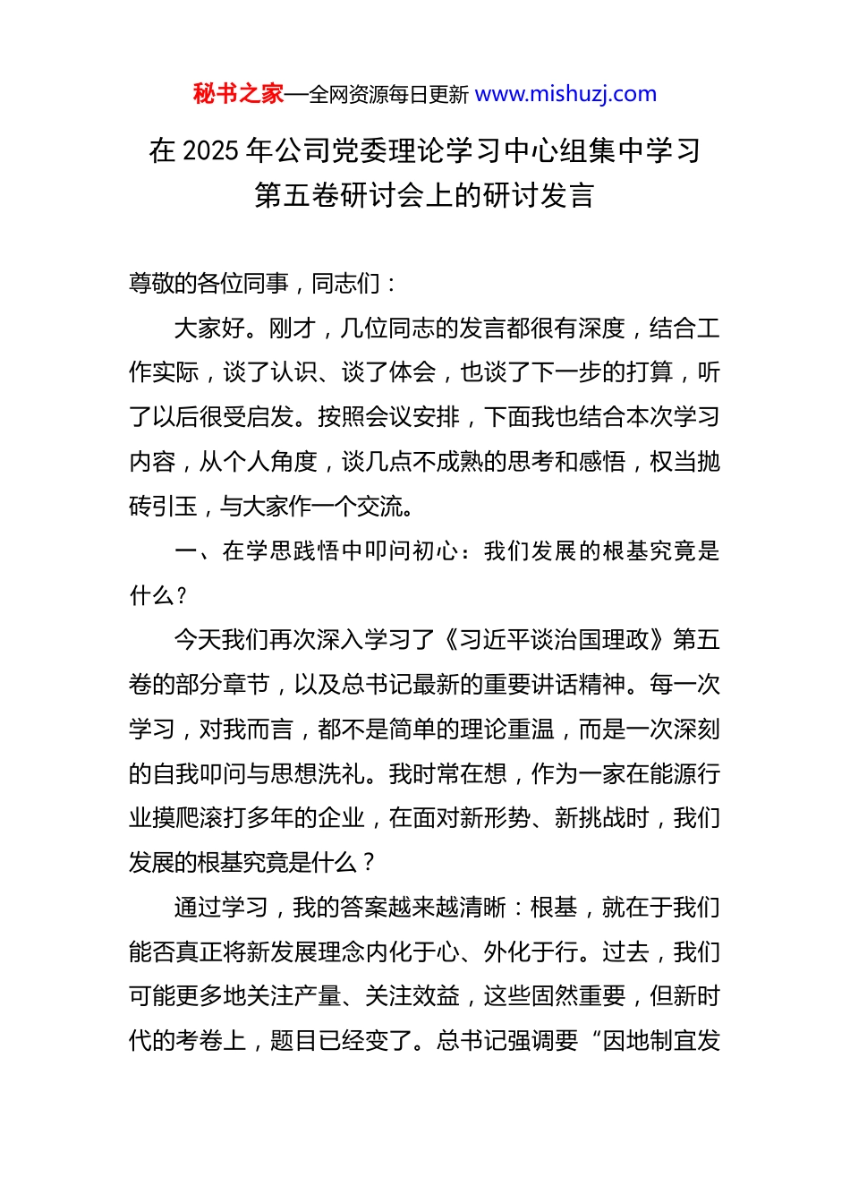 秘书之家—全网资源每日更新 www.mishuzj.com在 2025 年公司党委理论学习中心组集中学习第五卷研讨会上的研讨发言 尊敬的各位同事,同志们:大家好。刚才,几位同志的发言都很有深度,结合工作实际,谈了认识、谈了体会,也谈了下一步的打算,听了以后很受启发。按照会议安排,下面我也结合本次学习内容,从个人角度,谈几点不成熟的思考和感悟,权当抛砖引玉,与大家作一个交流。一、在学思践悟中叩问初心:我们发展的根基究竟是什么?今天我们再次深入学习了《习近平谈治国理政》第五卷的部分章节,以及总书记最新的重要讲话精神。每一次学习,对我而言,都不是简单的理论重温,而是一次深刻的自我叩问与思想洗礼。我时常在想,作为一家在能源行业摸爬滚打多年的企业,在面对新形势、新挑战时,我们发展的根基究竟是什么?通过学习,我的答案越来越清晰:根基,就在于我们能否真正将新发展理念内化于心、外化于行。过去,我们可能更多地关注产量、关注效益,这些固然重要,但新时代的考卷上,题目已经变了。总书记强调要“因地制宜发秘书之家—全网资源每日更新 www.mishuzj.com展新质生产力”,这八个字对我触动很大。它不是一句空洞的口号,而是对我们工作方向最精准地导航。这让我反思,我们*分公司,在“新”字上做得怎么样?我们的技术创新有没有真正转化为生产力?我们的管理模式是不是还停留在过去的路径依赖中?我们有没有为一线员工的创新想法提供足够肥沃的土壤?学习中提到“一体推进教育科技人才事业发展”,这让我不由得想起了前段时间在井下遇到的一位年轻技术员。他刚毕业不久,对瓦斯治理有一个很大胆的想法,但因为缺乏实践经验和数据支撑,方案显得有些稚嫩。当时,我们是简单地否定他,还是鼓励他、帮助他去完善?这件事让我深刻认识到,人才不仅仅是引进来、用起来,更关键的是要培养好、成就好。我们这些“关键少数”,有没有真正俯下身子,去倾听年轻人的声音,去呵护他们创新的火花?我们能不能建立一种机制,让有想法的人敢于尝试,让失败的探索也能得到宽容和尊重?这或许才是“人才保障”最生动的体现。同样,“全过程人民民主”和“更高水平的法治中国”这些宏大叙事,落到我们企业,就是决策要更加透明、更加贴近一线,管理要更加规范、更加有章可循。我们不能满足于开几次职代会、搞几次意见征集,而是要思考如何让员工的呼声真正成为我们决策的重要依据;我们不能满足于制度秘书之家—全网资源每日更新 www.mishuzj.com挂在墙上,而是要让每一项操作、每一次奖惩都有法可依、有据可查。只有这样,我们的发展才会有最坚实的群众基础和法治保障,才能行稳致远。二、在战略重组中审视自身:我们个人的价值在哪里实现?本次学习传达了*集团关于安全稳定工作会议的精神,特别是*同志的讲话,对战略重组的重大意义做了深刻阐述。坦白说,每次听到“重组”“变革”这样的词,内心都会有些波澜。作为在企业工作多年的老人,我亲身经历了公司发展的风风雨雨,对这片土地、对身边的同事,都有着深厚的感情。变革,必然会触及利益、打破常规,带来阵痛。*同志强调,要从战略、发展、实践三个层面深刻理解重组的意义。这让我开始审视自己,也审视我们每一位干部职工。在时代的洪流和集团发展的宏大棋局中,我们个人的价值究竟在哪里实现?是守着自己的一亩三分地,担心位置、待遇的变化?还是主动跳出舒适区,在大局中找准自己的新定位?我想,答案不言自明。真正的价值,在于融入大局、在于主动担当。集团战略重组,是基于更宏大的视野、更长远的考量做出的决策,旨在整合资源、优化布局,最终实现“世界一流企业”的目标。这个过程秘书之家—全网资源每日更新 www.mishuzj.com中,“稳大局、强融合、开新局”是我们的行动指南。对我个人而言,“稳”字当头,首先是稳住自己的心神,做改革的坚定支持者和推动者,而不是观望者、评论者。其次,是要帮助大家稳住人心。员工有疑虑、有担心,这是人之常情。我们作为干部,不能回避问题,更不能居高临下地宣讲大道理。而是要多到基层走一走,多和员工聊一聊,把集团的承诺、公司的考量,用最朴实的话讲清楚...