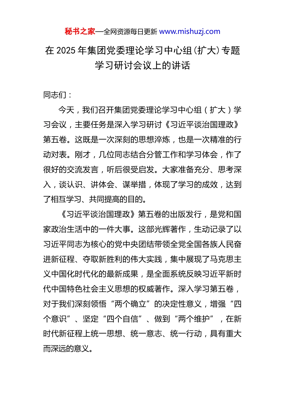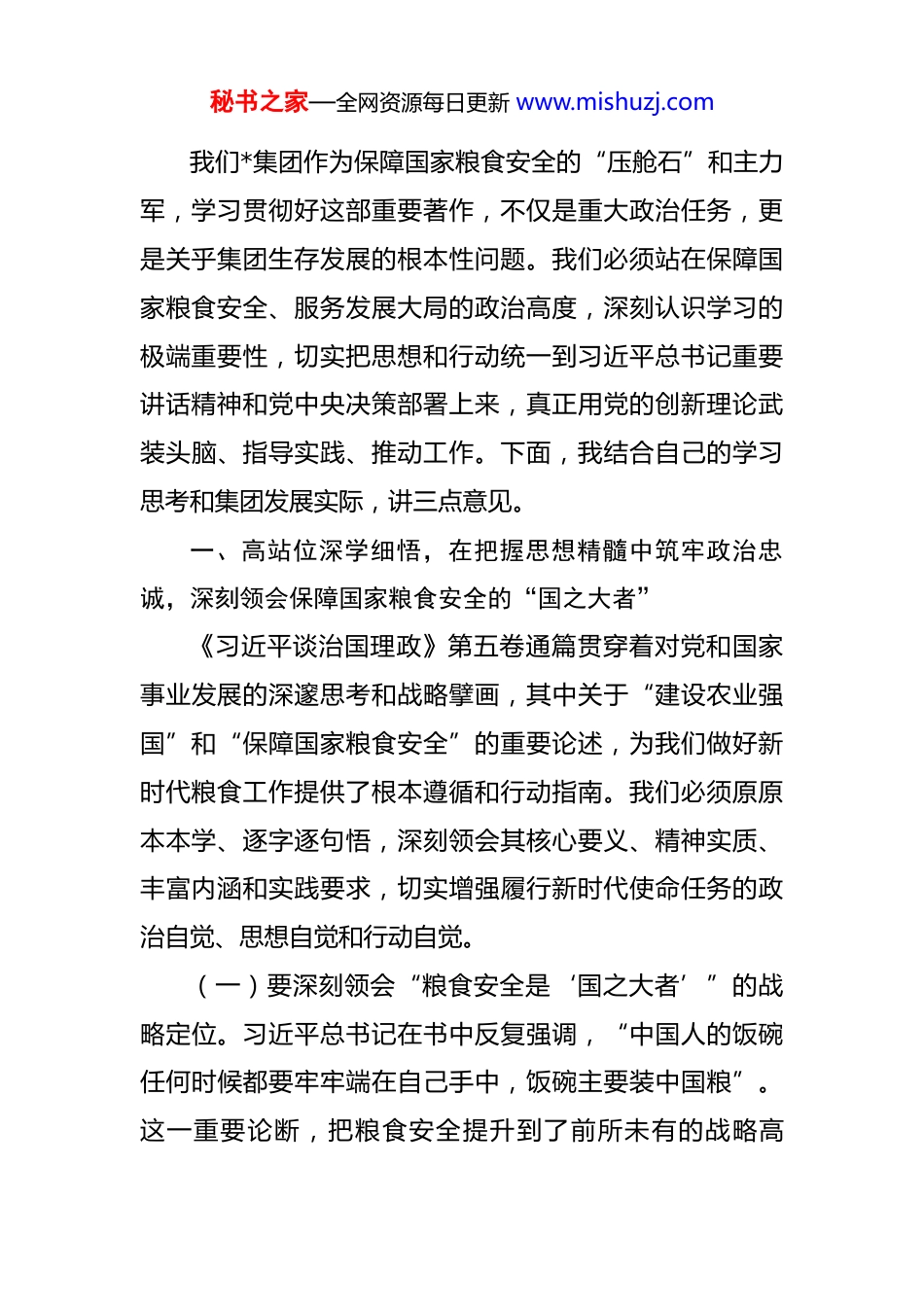 秘书之家—全网资源每日更新 www.mishuzj.com在 2025 年集团党委理论学习中心组(扩大)专题学习研讨会议上的讲话 同志们:今天,我们召开集团党委理论学习中心组(扩大)学习会议,主要任务是深入学习研讨《习近平谈治国理政》第五卷。这既是一次深刻的思想淬炼,也是一次精准的行动对表。刚才,几位同志结合分管工作和学习体会,作了很好的交流发言,听后很受启发。大家准备充分、思考深入,谈认识、讲体会、谋举措,体现了学习的成效,达到了相互学习、共同提高的目的。《习近平谈治国理政》第五卷的出版发行,是党和国家政治生活中的一件大事。这部光辉著作,生动记录了以习近平同志为核心的党中央团结带领全党全国各族人民奋进新征程、夺取新胜利的伟大实践,集中展现了马克思主义中国化时代化的最新成果,是全面系统反映习近平新时代中国特色社会主义思想的权威著作。深入学习第五卷,对于我们深刻领悟“两个确立”的决定性意义,增强“四个意识”、坚定“四个自信”、做到“两个维护”,在新时代新征程上统一思想、统一意志、统一行动,具有重大而深远的意义。秘书之家—全网资源每日更新 www.mishuzj.com我们*集团作为保障国家粮食安全的“压舱石”和主力军,学习贯彻好这部重要著作,不仅是重大政治任务,更是关乎集团生存发展的根本性问题。我们必须站在保障国家粮食安全、服务发展大局的政治高度,深刻认识学习的极端重要性,切实把思想和行动统一到习近平总书记重要讲话精神和党中央决策部署上来,真正用党的创新理论武装头脑、指导实践、推动工作。下面,我结合自己的学习思考和集团发展实际,讲三点意见。一、高站位深学细悟,在把握思想精髓中筑牢政治忠诚,深刻领会保障国家粮食安全的“国之大者”《习近平谈治国理政》第五卷通篇贯穿着对党和国家事业发展的深邃思考和战略擘画,其中关于“建设农业强国”和“保障国家粮食安全”的重要论述,为我们做好新时代粮食工作提供了根本遵循和行动指南。我们必须原原本本学、逐字逐句悟,深刻领会其核心要义、精神实质、丰富内涵和实践要求,切实增强履行新时代使命任务的政治自觉、思想自觉和行动自觉。(一)要深刻领会“粮食安全是‘国之大者’”的战略定位。习近平总书记在书中反复强调,“中国人的饭碗任何时候都要牢牢端在自己手中,饭碗主要装中国粮”。这一重要论断,把粮食安全提升到了前所未有的战略高秘书之家—全网资源每日更新 www.mishuzj.com度。当前,世界百年未有之大变局加速演进,全球粮食产业链、供应链面临的不确定性、不稳定性显著增加。我们必须清醒地认识到,粮食安全问题绝不是单纯的经济问题,而是关系国计民生、社会稳定和国家安全的重大政治问题。我们*集团作为*省粮食储备体系建设和运营管理的主力军,肩负着 880 万吨仓容的重大责任,我们的一举一动都与国家粮食安全大局紧密相连。我们必须胸怀“国之大者”,时刻绷紧粮食安全这根弦,决不能有丝毫麻痹和懈怠。要不断提高政治判断力、政治领悟力、政治执行力,自觉把集团的工作放到党和国家事业发展全局中去思考、去定位、去摆布,确保党中央关于粮食安全的各项决策部署在集团不折不扣地落地生根。(二)要深刻领会“藏粮于地、藏粮于技”的根本路径。总书记指出,保障粮食安全,关键在于落实藏粮于地、藏粮于技战略。这为我们从根本上保障粮食供给提供了科学指引。虽然我们集团的主业是粮食收储、贸易和加工,不直接参与前端种植,但我们是连接生产与消费的关键枢纽,是推动农业技术应用和产业升级的重要力量。我们要思考,如何通过我们的市场化运作,反哺农业生产端?如何利用我们的仓储物流优势,引导和激励广大农户采用更先进的种植技术、种植更优质的粮食品种?例如,秘书之家—全网资源每日更新 www.mishuzj.com我们可以深化“订单种植”模式,与合作社、种植大户建立更紧密的利益联结机制,提供精准的市场信息和技术服务,引导他们从“种得好”向“卖得好”转变,从而激发他们保护黑土地、应用新技术的内生动力。同时,我们自身的“藏粮于技”水平也要不断提升。集团正在推进的“数字*”一体化管控系统建设,就是落实“藏粮...