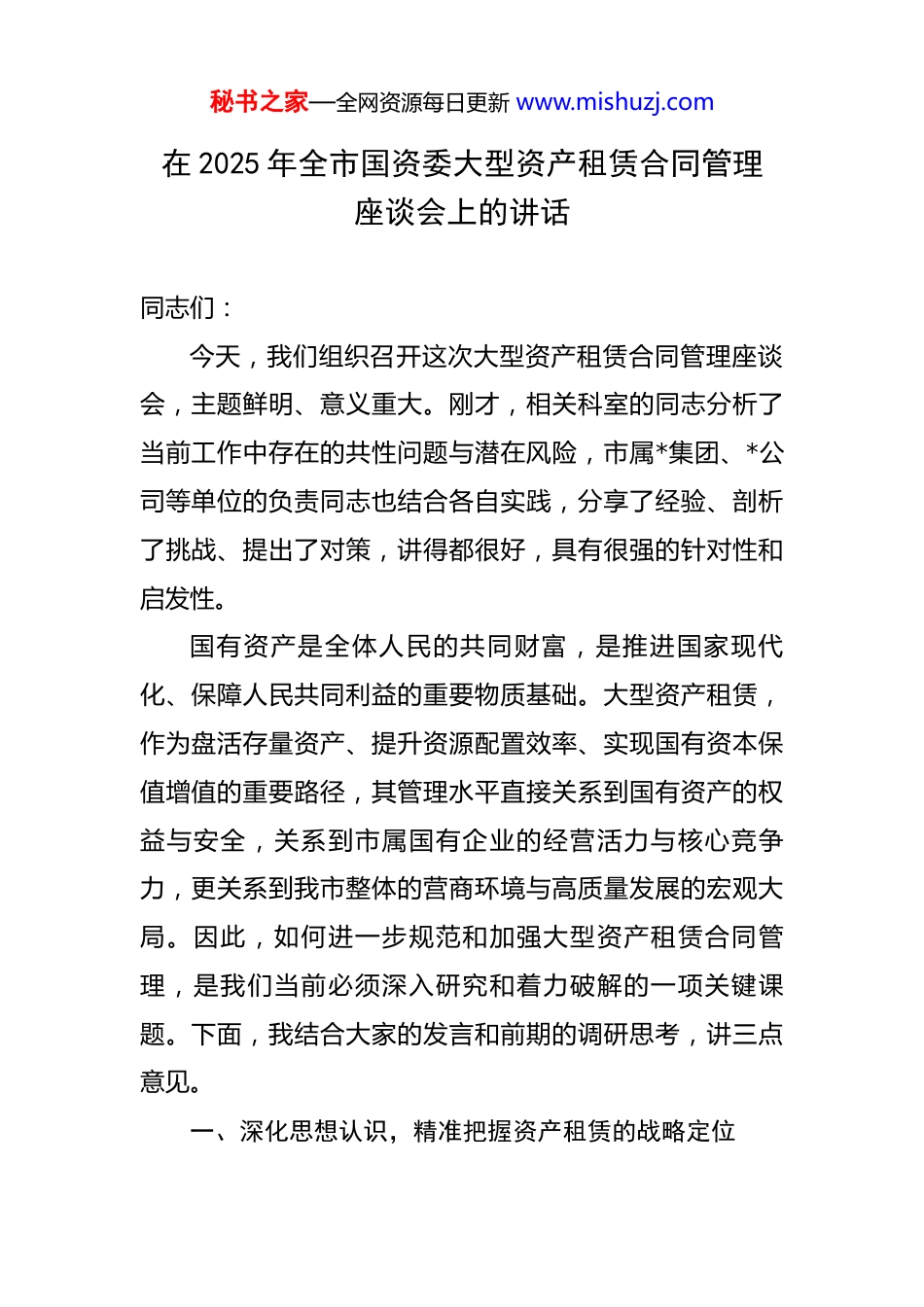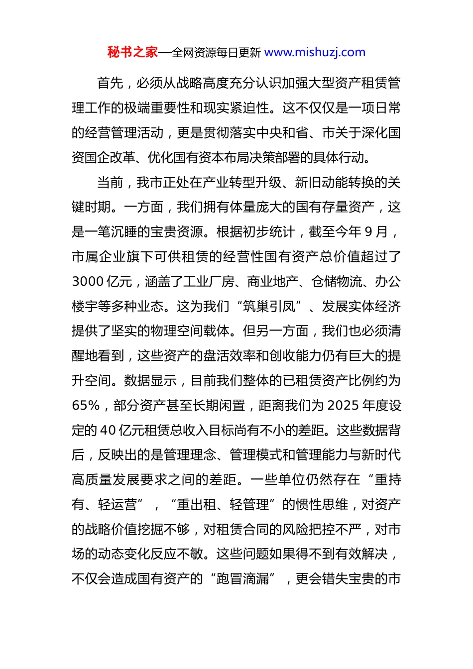 秘书之家—全网资源每日更新 www.mishuzj.com在 2025 年全市国资委大型资产租赁合同管理座谈会上的讲话 同志们:今天,我们组织召开这次大型资产租赁合同管理座谈会,主题鲜明、意义重大。刚才,相关科室的同志分析了当前工作中存在的共性问题与潜在风险,市属*集团、*公司等单位的负责同志也结合各自实践,分享了经验、剖析了挑战、提出了对策,讲得都很好,具有很强的针对性和启发性。国有资产是全体人民的共同财富,是推进国家现代化、保障人民共同利益的重要物质基础。大型资产租赁,作为盘活存量资产、提升资源配置效率、实现国有资本保值增值的重要路径,其管理水平直接关系到国有资产的权益与安全,关系到市属国有企业的经营活力与核心竞争力,更关系到我市整体的营商环境与高质量发展的宏观大局。因此,如何进一步规范和加强大型资产租赁合同管理,是我们当前必须深入研究和着力破解的一项关键课题。下面,我结合大家的发言和前期的调研思考,讲三点意见。一、深化思想认识,精准把握资产租赁的战略定位秘书之家—全网资源每日更新 www.mishuzj.com首先,必须从战略高度充分认识加强大型资产租赁管理工作的极端重要性和现实紧迫性。这不仅仅是一项日常的经营管理活动,更是贯彻落实中央和省、市关于深化国资国企改革、优化国有资本布局决策部署的具体行动。当前,我市正处在产业转型升级、新旧动能转换的关键时期。一方面,我们拥有体量庞大的国有存量资产,这是一笔沉睡的宝贵资源。根据初步统计,截至今年 9 月,市属企业旗下可供租赁的经营性国有资产总价值超过了3000 亿元,涵盖了工业厂房、商业地产、仓储物流、办公楼宇等多种业态。这为我们“筑巢引凤”、发展实体经济提供了坚实的物理空间载体。但另一方面,我们也必须清醒地看到,这些资产的盘活效率和创收能力仍有巨大的提升空间。数据显示,目前我们整体的已租赁资产比例约为65%,部分资产甚至长期闲置,距离我们为 2025 年度设定的 40 亿元租赁总收入目标尚有不小的差距。这些数据背后,反映出的是管理理念、管理模式和管理能力与新时代高质量发展要求之间的差距。一些单位仍然存在“重持有、轻运营”,“重出租、轻管理”的惯性思维,对资产的战略价值挖掘不够,对租赁合同的风险把控不严,对市场的动态变化反应不敏。这些问题如果得不到有效解决,不仅会造成国有资产的“跑冒滴漏”,更会错失宝贵的市秘书之家—全网资源每日更新 www.mishuzj.com场机遇,拖累我市经济社会发展的整体步伐。因此,各单位必须彻底摒弃“坐地收租”的陈旧观念,牢固树立“以经营的理念管资产、以市场的逻辑谋发展”的新思维,将大型资产租赁工作置于服务全市发展大局、增强企业核心功能、提升核心竞争力的战略高度来谋划和推进。二、坚持问题导向,系统构建风险防控的坚固防线刚才会上通报的共性问题和潜在风险点,触及了我们工作的痛点和难点,必须引起高度警觉。防范化解重大风险,是国有企业行稳致远的生命线。在大型资产租赁领域,风险防控体系的建设尤为关键。结合日常监管和外部案例,当前我们面临的风险主要集中在以下几个方面:第一,是合同管理的法律合规风险。一些租赁合同文本不规范、权责界定模糊,对违约责任、续租条件、资产维护、不可抗力等关键条款约定不明,为后续的履约纠纷埋下了隐患。更有甚者,存在绕过公开招租程序、违规审批、签订“阴阳合同”等现象,不仅可能导致国有资产流失,更触及了廉政红线,法律风险极高。第二,是承租方的信用履约风险。这是租赁业务最核心的风险之一。由于前期对承租方的资信调查不深入、不全面,对其实际经营能力和财务状况评估不足,导致在经济下行周期中,部分承租方经营困难,出现租金拖欠、中途退租甚至“跑路”秘书之家—全网资源每日更新 www.mishuzj.com的情况,给我们的资产收益和后续处置带来极大被动。特别是对于一些租赁周期长、涉及金额大的合同,承租方的信用风险一旦爆发,将造成难以挽回的重大损失。第三,是资产价值的动态波动风险。租赁标的物的价值并非一成不变。市场行情的变化、区域规划的调整、资产本身的折旧老化、维护保养的缺失等因素...