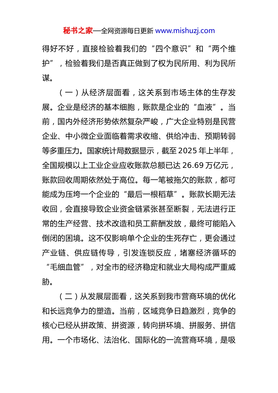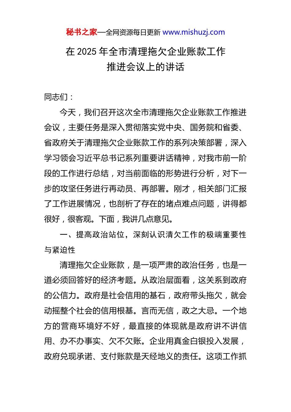 秘书之家—全网资源每日更新 www.mishuzj.com在 2025 年全市清理拖欠企业账款工作推进会议上的讲话 同志们:今天,我们召开这次全市清理拖欠企业账款工作推进会议,主要任务是深入贯彻落实党中央、国务院和省委、省政府关于清理拖欠企业账款工作的系列决策部署,深入学习领会习近平总书记系列重要讲话精神,对我市前一阶段的工作进行总结,对当前面临的形势进行分析,对下一步的攻坚任务进行再动员、再部署。刚才,相关部门汇报了工作进展情况,也剖析了存在的堵点难点问题,讲得都很好,很客观。下面,我讲几点意见。一、提高政治站位,深刻认识清欠工作的极端重要性与紧迫性清理拖欠企业账款,是一项严肃的政治任务,也是一道必须回答好的经济考题。从政治层面看,这关系到政府的公信力。政府是社会信用的基石,政府带头拖欠,就会动摇整个社会的信用根基。言而无信,政之大忌。一个地方的营商环境好不好,最直接的体现就是政府讲不讲信用、办不办事实、欠不欠账。企业用真金白银投入发展,政府兑现承诺、支付账款是天经地义的责任。这项工作抓秘书之家—全网资源每日更新 www.mishuzj.com得好不好,直接检验着我们的“四个意识”和“两个维护”,检验着我们是否真正做到了权为民所用、利为民所谋。(一)从经济层面看,这关系到市场主体的生存发展。企业是经济的基本细胞,账款是企业的“血液”。当前,国内外经济形势依然复杂严峻,广大企业特别是民营企业、中小微企业面临着需求收缩、供给冲击、预期转弱等多重压力。国家统计局数据显示,截至 2025 年上半年,全国规模以上工业企业应收账款总额已达 26.69 万亿元,账款回收周期依然处于高位。每一笔被拖欠的账款,都可能成为压垮一个企业的“最后一根稻草”。账款长期无法收回,会直接导致企业资金链紧张甚至断裂,无法进行正常的生产经营、技术改造和员工薪酬发放,最终可能陷入倒闭的困境。这不仅影响单个企业的生死存亡,更会通过产业链、供应链传导,引发连锁反应,堵塞经济循环的“毛细血管”,对全市的经济稳定和就业大局构成严重威胁。(二)从发展层面看,这关系到我市营商环境的优化和长远竞争力的塑造。当前,区域竞争日趋激烈,竞争的核心已经从拼政策、拼资源,转向拼环境、拼服务、拼信用。一个市场化、法治化、国际化的一流营商环境,是吸秘书之家—全网资源每日更新 www.mishuzj.com引投资、集聚人才、培育产业的“金字招牌”。如果拖欠企业账款的问题长期得不到解决,就会形成“投资不过*”的负面印象,严重挫伤市场信心和投资者预期。反之,如果我们能以壮士断腕的决心,彻底解决这一顽疾,就能向外界释放出我市尊商、重商、亲商、安商的强烈信号,从而吸引更多的优质企业和项目落地生根、开花结果,为我市高质量发展注入源源不断的动力。因此,全市上下必须把思想和行动统一到中央和省委的决策部署上来,以高度的政治自觉、思想自觉和行动自觉,把清欠工作作为当前一项刻不容缓的重要任务,抓紧抓实抓出成效。(三)从社会层面看,这关系到社会和谐稳定的大局。企业账款被拖欠,不仅影响企业自身发展,还会波及广大员工。企业资金链紧张可能导致员工薪酬无法按时发放,进而影响员工的基本生活保障,容易引发劳资纠纷和社会矛盾。特别是对于一些劳动密集型企业,员工数量众多,一旦出现大规模的欠薪问题,将对社会稳定造成极大冲击。同时,拖欠账款还可能引发上下游企业之间的连锁欠薪问题,形成恶性循环,进一步加剧社会不稳定因素。因此,做好清欠工作,保障企业账款及时回收,对于维护员工合法权益、促进社会和谐稳定具有重要意义。二、正视已有进展,清醒把握当前清欠工作的复杂性秘书之家—全网资源每日更新 www.mishuzj.com与艰巨性自清欠工作开展以来,市委、市政府高度重视,成立了工作专班,各地区、各部门也付出了巨大努力,取得了一定的阶段性成效。特别是我市在 2024 年系统性地开展了债务化解资产清查工作,为摸清家底、盘活资产、制定化债方案打下了坚实基础。一些部门通过府院联动机制,有效化解了一批“骨头案”“钉子案”。这些成绩值得肯定。但在肯定成绩的同时,我们更要清...