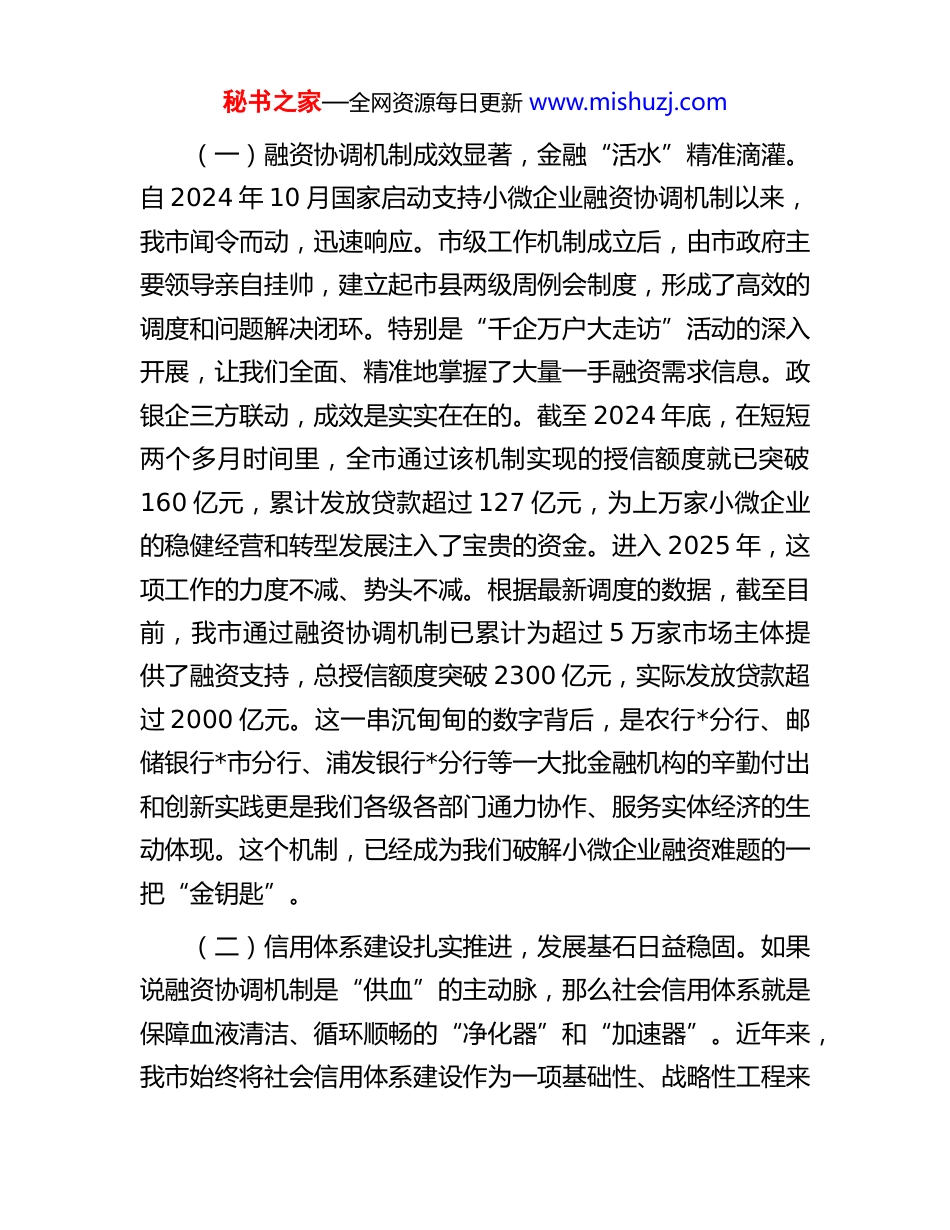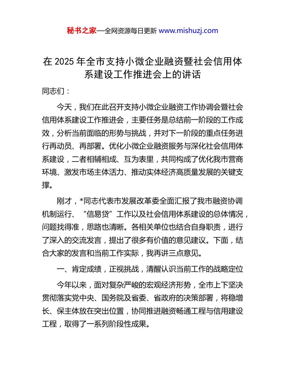 秘书之家—全网资源每日更新 www.mishuzj.com在 2025 年全市支持小微企业融资暨社会信用体系建设工作推进会上的讲话同志们:今天,我们在此召开支持小微企业融资工作协调会暨社会信用体系建设工作推进会,主要任务是总结前一阶段的工作成效,分析当前面临的形势与挑战,并对下一阶段的重点任务进行再动员、再部署。优化小微企业融资服务与深化社会信用体系建设,二者相辅相成、互为表里,共同构成了优化我市营商环境、激发市场主体活力、推动实体经济高质量发展的关键支撑。刚才,*同志代表市发展改革委全面汇报了我市融资协调机制运行、“信易贷”工作以及社会信用体系建设的总体情况,问题找得准,思路也清晰。各相关单位也结合自身职责,进行了深入的交流发言,提出了很多有价值的意见建议。下面,结合大家的发言和当前工作实际,我再讲三点意见。一、肯定成绩,正视挑战,清醒认识当前工作的战略定位今年以来,面对复杂严峻的宏观经济形势,全市上下坚决贯彻落实党中央、国务院及省委、省政府的决策部署,将稳增长、保主体放在突出位置,协同推进融资畅通工程与信用建设工程,取得了一系列阶段性成果。秘书之家—全网资源每日更新 www.mishuzj.com(一)融资协调机制成效显著,金融“活水”精准滴灌。自 2024 年 10 月国家启动支持小微企业融资协调机制以来,我市闻令而动,迅速响应。市级工作机制成立后,由市政府主要领导亲自挂帅,建立起市县两级周例会制度,形成了高效的调度和问题解决闭环。特别是“千企万户大走访”活动的深入开展,让我们全面、精准地掌握了大量一手融资需求信息。政银企三方联动,成效是实实在在的。截至 2024 年底,在短短两个多月时间里,全市通过该机制实现的授信额度就已突破160 亿元,累计发放贷款超过 127 亿元,为上万家小微企业的稳健经营和转型发展注入了宝贵的资金。进入 2025 年,这项工作的力度不减、势头不减。根据最新调度的数据,截至目前,我市通过融资协调机制已累计为超过 5 万家市场主体提供了融资支持,总授信额度突破 2300 亿元,实际发放贷款超过 2000 亿元。这一串沉甸甸的数字背后,是农行*分行、邮储银行*市分行、浦发银行*分行等一大批金融机构的辛勤付出和创新实践更是我们各级各部门通力协作、服务实体经济的生动体现。这个机制,已经成为我们破解小微企业融资难题的一把“金钥匙”。(二)信用体系建设扎实推进,发展基石日益稳固。如果说融资协调机制是“供血”的主动脉,那么社会信用体系就是保障血液清洁、循环顺畅的“净化器”和“加速器”。近年来,我市始终将社会信用体系建设作为一项基础性、战略性工程来秘书之家—全网资源每日更新 www.mishuzj.com抓,取得了长足进步。核心标志是“信易贷”平台的推广应用。作为破解银企信息不对称的核心抓手,我市“信易贷”平台建设走在了全省前列。截至 2025 年 2 月底,平台已成功促成授信近 100 亿元,发放贷款超 74 亿元。经过大半年的持续努力,截至今天,平台累计入驻企业已超过 15 万家,实现全市银行金融机构 100%覆盖,累计促成授信总额突破 1200 亿元,发放纯信用贷款突破 1000 亿元。这不仅是量的飞跃,更是质的提升。更为关键的是,支撑“信易贷”高效运转的信用信息共享平台,其数据“家底”越来越厚实。平台归集的各类信用信息已从 2023 年的 3.6 亿余条,向着 2025 年底突破 4 亿条的目标稳步迈进。数据的准确率提升至 98%以上,迟报率显著下降,为信用评价和融资对接提供了坚实的数据基础。正因如此,我市在全省社会信用体系建设评估中能够连续获得“优秀”等次这是对我们工作的最好肯定。(三)问题与短板不容忽视,攻坚克难任重道远。在肯定成绩的同时,必须清醒地看到,对照高质量发展的要求,对照先进地区的实践,我们的工作仍存在不少亟待破解的难题。第一个问题是“数据壁垒”依然顽固。正如刚才会议指出的,部分单位尚未将政务数据归集共享作为一项“法定职责”来履行。数据依然散落于不同部门的“信息孤岛”之中,跨部门、跨层级的数据共享机制仍不顺畅,“应归尽归”的目标尚未完全实现。这直接导...