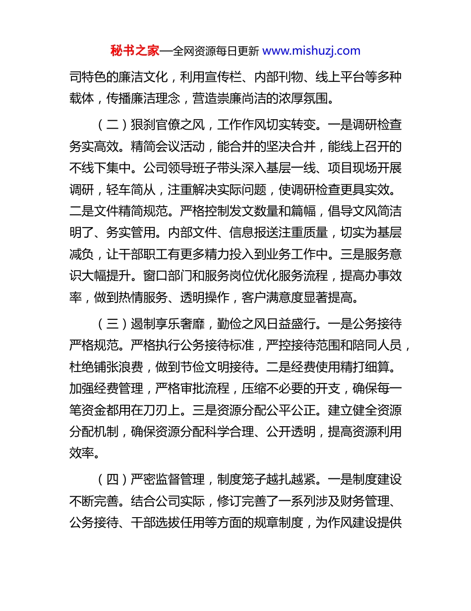 秘书之家—全网资源每日更新 www.mishuzj.com国企党委书记在 2025 年作风建设总结大会上的讲话同志们:今天,我们在这里召开专题会议,核心目的是全面总结回顾公司作风建设情况,巩固拓展已取得的成果,深刻反思存在的问题,科学谋划后续工作任务。通过此次会议,推动公司全面从严治党向纵深发展,为公司高质量发展筑牢坚实的作风保障。一、勠力同心,作风建设收获新成果自纪律规定颁布以来,公司党委始终将贯彻落实其精神作为一项重大政治任务,以“钉钉子”精神持续推进作风建设,取得了阶段性显著成效。(一)强化思想铸魂,政治自觉显著增强。一是理论学习入脑入心。通过党委理论学习中心组学习、专题研讨、支部“三会一课”等多种形式,组织党员干部深入学习纪律规定及其实施细则,深刻领会其内涵与要求,切实增强了贯彻落实的思想自觉和行动自觉。二是警示教育触及灵魂。定期组织观看警示教育片、开展廉政讲座、参观廉政教育基地,用身边案例警示身边人,引导干部职工知敬畏、存戒惧、守底线,筑牢拒腐防变的思想防线。三是廉洁文化浸润人心。积极培育具有公秘书之家—全网资源每日更新 www.mishuzj.com司特色的廉洁文化,利用宣传栏、内部刊物、线上平台等多种载体,传播廉洁理念,营造崇廉尚洁的浓厚氛围。(二)狠刹官僚之风,工作作风切实转变。一是调研检查务实高效。精简会议活动,能合并的坚决合并,能线上召开的不线下集中。公司领导班子带头深入基层一线、项目现场开展调研,轻车简从,注重解决实际问题,使调研检查更具实效。二是文件精简规范。严格控制发文数量和篇幅,倡导文风简洁明了、务实管用。内部文件、信息报送注重质量,切实为基层减负,让干部职工有更多精力投入到业务工作中。三是服务意识大幅提升。窗口部门和服务岗位优化服务流程,提高办事效率,做到热情服务、透明操作,客户满意度显著提高。(三)遏制享乐奢靡,勤俭之风日益盛行。一是公务接待严格规范。严格执行公务接待标准,严控接待范围和陪同人员,杜绝铺张浪费,做到节俭文明接待。二是经费使用精打细算。加强经费管理,严格审批流程,压缩不必要的开支,确保每一笔资金都用在刀刃上。三是资源分配公平公正。建立健全资源分配机制,确保资源分配科学合理、公开透明,提高资源利用效率。(四)严密监督管理,制度笼子越扎越紧。一是制度建设不断完善。结合公司实际,修订完善了一系列涉及财务管理、公务接待、干部选拔任用等方面的规章制度,为作风建设提供秘书之家—全网资源每日更新 www.mishuzj.com了坚实的制度保障。二是监督检查常态长效。建立常态化监督检查机制,采取定期检查与不定期抽查相结合的方式,对制度执行情况进行全面监督检查,及时发现和纠正问题。三是执纪问责严肃有力。对违反纪律规定精神的行为,坚持零容忍态度,严肃追究相关人员的责任,形成了强大的震慑力。(五)提升履职效能,各项工作稳步推进。一是业务质量持续提高。通过加强作风建设,员工的工作责任心和敬业精神明显增强,公司业务质量和服务水平稳步提升。二是运营效率显著增强。优化内部管理流程,减少不必要的环节和手续,提高了工作效率和决策速度,为公司发展赢得了时间和机遇。三是社会形象持续巩固。公司以良好的作风和优质的服务赢得了客户和社会的广泛认可,社会公信力和品牌影响力不断提升。二、总结经验,作风建设积累宝贵财富在贯彻落实纪律规定精神的实践中,我们深化了认识,积累了宝贵经验。(一)坚守政治引领,压实主体责任。坚持把政治建设摆在首位,切实增强“四个意识”、坚定“四个自信”、做到“两个维护”。公司党委认真履行全面从严治党主体责任,各级党组织负责人切实扛起第一责任人责任,层层传导压力,确保责任落实到位。秘书之家—全网资源每日更新 www.mishuzj.com(二)发挥头雁效应,引领示范前行。公司领导班子成员以身作则、率先垂范,带头遵守纪律规定精神,严格执行廉洁自律各项规定。以“关键少数”带动“绝大多数”,形成了以上率下、上下联动的良好局面。(三)坚持常抓不懈,构建长效机制。作风建设是一项长期而艰巨的任务,必须持之以恒、常抓不懈。我们建...