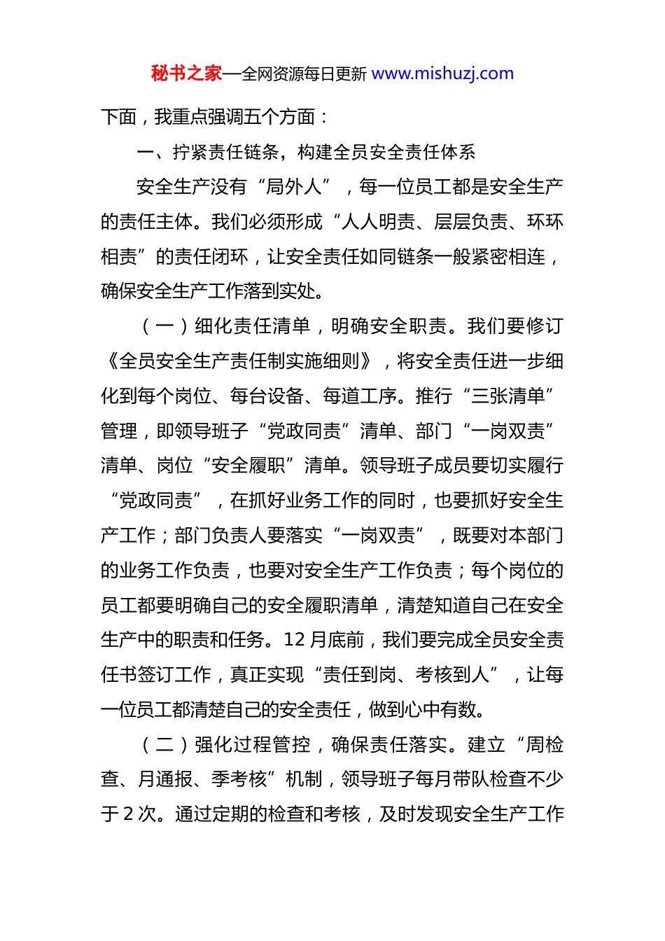 秘书之家—全网资源每日更新 www.mishuzj.com在公司 2025 年四季度安全生产工作会议上的讲话 同志们:今天,我们在这里召开安全生产专题会议,目的就是要向全公司传递一个强烈且明确的信号:安全生产,是我们必须牢牢守住的“生命线”,它关乎每一位员工的生命安危,关乎企业的生存与发展;是任何时候都不能突破的“底线”,一旦突破,所有的努力都将付诸东流;是检验领导干部政治担当的“标尺”,能否抓好安全生产工作,是对领导干部政治觉悟、责任意识和工作能力的直接考验。当前,我们正处于冲刺全年目标的关键时期,各项工作任务繁重且紧迫。在这个时候,我们越要绷紧安全这根弦,不能有丝毫的松懈和麻痹。近期,行业内连续发生的几起事故,给我们敲响了沉重的警钟。这些事故,不仅造成了人员伤亡和财产损失,也给相关企业带来了巨大的负面影响。“安全失守,一切归零”,这句话绝非危言耸听,它深刻地揭示了安全生产的重要性。我们必须以“时时放心不下”的责任感和“事事落实到位”的执行力,坚决打好安全生产保卫战,为公司的高质量发展保驾护航。秘书之家—全网资源每日更新 www.mishuzj.com下面,我重点强调五个方面:一、拧紧责任链条,构建全员安全责任体系安全生产没有“局外人”,每一位员工都是安全生产的责任主体。我们必须形成“人人明责、层层负责、环环相责”的责任闭环,让安全责任如同链条一般紧密相连,确保安全生产工作落到实处。(一)细化责任清单,明确安全职责。我们要修订《全员安全生产责任制实施细则》,将安全责任进一步细化到每个岗位、每台设备、每道工序。推行“三张清单”管理,即领导班子“党政同责”清单、部门“一岗双责”清单、岗位“安全履职”清单。领导班子成员要切实履行“党政同责”,在抓好业务工作的同时,也要抓好安全生产工作;部门负责人要落实“一岗双责”,既要对本部门的业务工作负责,也要对安全生产工作负责;每个岗位的员工都要明确自己的安全履职清单,清楚知道自己在安全生产中的职责和任务。12 月底前,我们要完成全员安全责任书签订工作,真正实现“责任到岗、考核到人”,让每一位员工都清楚自己的安全责任,做到心中有数。(二)强化过程管控,确保责任落实。建立“周检查、月通报、季考核”机制,领导班子每月带队检查不少于 2 次。通过定期的检查和考核,及时发现安全生产工作秘书之家—全网资源每日更新 www.mishuzj.com中存在的问题和隐患,并督促相关部门和人员进行整改。对重大危险源实行“双主任制”,由技术负责人和行政负责人共同包保。技术负责人要从技术层面保障重大危险源的安全运行,行政负责人要从管理层面落实各项安全措施。推行隐患整改“五落实”,即落实责任、措施、资金、时限、预案。对于排查出的安全隐患,要明确整改责任人,制定具体的整改措施,落实整改资金,确定整改时限,并制定相应的应急预案,确保隐患能够得到及时、有效的整改。(三)严肃追责问责,形成强大威慑。对重复出现的安全隐患,按照“隐患即事故”原则从严处理。这意味着我们不能对重复出现的隐患掉以轻心,要像对待事故一样严肃对待,查明原因,追究相关人员的责任。发生责任事故的,实行“一案双查”,既查直接责任,也查管理责任。不仅要追究直接导致事故发生的人员的责任,也要追究相关管理人员在安全管理方面的责任。将安全绩效与干部晋升、评优评先、薪酬分配直接挂钩,让安全工作成为干部考核的重要指标。通过严肃的追责问责,形成强大的威慑力,促使各级管理人员和员工切实履行安全责任。二、强化风险防控,筑牢双重预防机制我们要把隐患当事故对待,把风险当危机管控,下好秘书之家—全网资源每日更新 www.mishuzj.com先手棋、打好主动仗,做到防患于未然。(一)深化风险辨识,精准识别风险。开展第四季度全流程风险再辨识,重点排查新工艺、新设备、新环境带来的风险。随着公司业务的发展和技术的进步,新工艺、新设备、新环境不断出现,这些都可能带来新的安全风险。我们要运用 HAZOP 分析法对重点装置进行系统评估,建立“红橙黄蓝”风险分布图。通过科学的分析和评估,准确识别出各个区域和设备的...