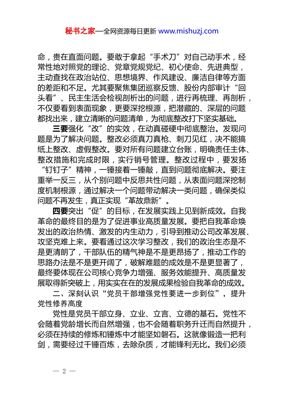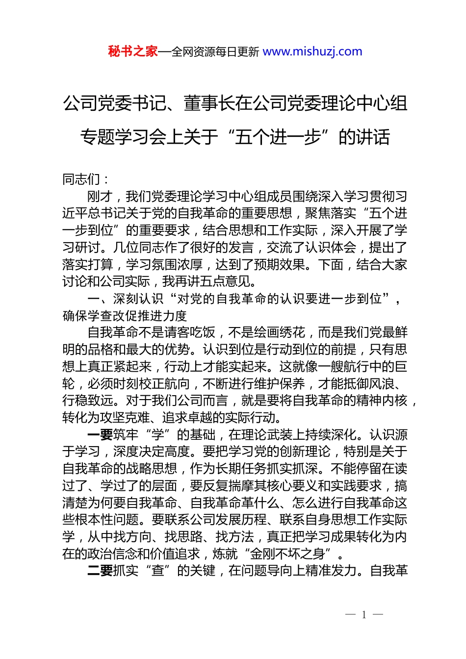秘书之家—全网资源每日更新 www.mishuzj.com公司党委书记、董事长在公司党委理论中心组专题学习会上关于“五个进一步”的讲话同志们:刚才,我们党委理论学习中心组成员围绕深入学习贯彻习近平总书记关于党的自我革命的重要思想,聚焦落实“五个进一步到位”的重要要求,结合思想和工作实际,深入开展了学习研讨。几位同志作了很好的发言,交流了认识体会,提出了落实打算,学习氛围浓厚,达到了预期效果。下面,结合大家讨论和公司实际,我再讲五点意见。一、深刻认识“对党的自我革命的认识要进一步到位”,确保学查改促推进力度自我革命不是请客吃饭,不是绘画绣花,而是我们党最鲜明的品格和最大的优势。认识到位是行动到位的前提,只有思想上真正紧起来,行动上才能实起来。这就像一艘航行中的巨轮,必须时刻校正航向,不断进行维护保养,才能抵御风浪、行稳致远。对于我们公司而言,就是要将自我革命的精神内核,转化为攻坚克难、追求卓越的实际行动。一要筑牢“学”的基础,在理论武装上持续深化。认识源于学习,深度决定高度。要把学习党的创新理论,特别是关于自我革命的战略思想,作为长期任务抓实抓深。不能停留在读过了、学过了的层面,要反复揣摩其核心要义和实践要求,搞清楚为何要自我革命、自我革命革什么、怎么进行自我革命这些根本性问题。要联系公司发展历程、联系自身思想工作实际学,从中找方向、找思路、找方法,真正把学习成果转化为内在的政治信念和价值追求,炼就“金刚不坏之身”。二要抓实“查”的关键,在问题导向上精准发力。自我革— 1 —秘书之家—全网资源每日更新 www.mishuzj.com命,贵在直面问题。要敢于拿起“手术刀”对自己动手术,经常性地对照党的理论、党章党规党纪、初心使命、先进典型,主动查找在政治站位、思想境界、作风建设、廉洁自律等方面的差距和不足。尤其要聚焦集团巡察反馈、股份内部审计“回头看”、民主生活会检视剖析出的问题,进行再梳理、再剖析,不仅要看到表面现象,更要深挖根源,把潜藏的、深层的问题都找出来,建立清晰的问题清单,为彻底整改打下坚实基础。三要强化“改”的实效,在动真碰硬中彻底整治。发现问题是为了解决问题。整改必须真刀真枪、刺刀见红,决不能搞纸上整改、虚假整改。要对所有问题建立台账,明确责任主体、整改措施和完成时限,实行销号管理。整改过程中,要发扬“钉钉子”精神,一锤接着一锤敲,直到问题彻底解决。要注重举一反三,从个别问题中反思共性问题,从表面问题深挖制度机制根源,通过解决一个问题带动解决一类问题,确保类似问题不再发生,真正实现“革故鼎新”。四要突出“促”的目标,在发展实践上见到新成效。自我革命的最终目的是为了促进事业高质量发展。要把自我革命焕发出的政治热情、激发的内生动力,引导到推动公司改革发展、攻坚克难上来。要看通过这次学习整改,我们的政治生态是不是更清朗了,干部队伍的精气神是不是更昂扬了,推动工作的思路办法是不是更开阔了,破解难题的成效是不是更显著了,最终要体现在公司核心竞争力增强、服务效能提升、高质量发展取得新突破上,用实实在在的发展成果检验自我革命的成效。二、深刻认识“党员干部增强党性要进一步到位”,提升党性修养高度党性是党员干部立身、立业、立言、立德的基石。党性不会随着党龄增长而自然增强,也不会随着职务升迁而自然提升,必须在持续的修炼和锤炼中才能坚如磐石。这就像锻造一把利剑,需要经过千锤百炼,去除杂质,才能锋利无比。我们必须— 2 —秘书之家—全网资源每日更新 www.mishuzj.com把加强党性修养作为终身课题,常修常炼,不断提升政治境界、思想境界、道德境界。一要拧紧“总开关”,在理论滋养中固本培元。思想上的清醒是政治上坚定的基础。要坚持把理论学习作为增强党性的根本途径,深入学习马克思主义基本原理,学深悟透习近平新时代中国特色社会主义思想,掌握蕴含其中的立场观点方法。要读原著、学原文、悟原理,做到学思用贯通、知信行统一,真正让党的创新理论融入血脉、注入灵魂,转化为不可撼动的理想信念。只有理论上的彻底,才能有党性上的纯粹,才能在任何风浪...