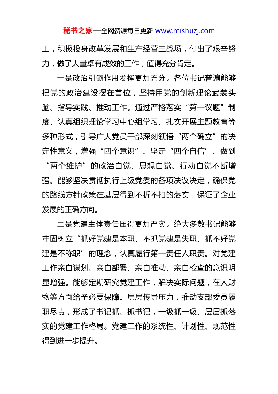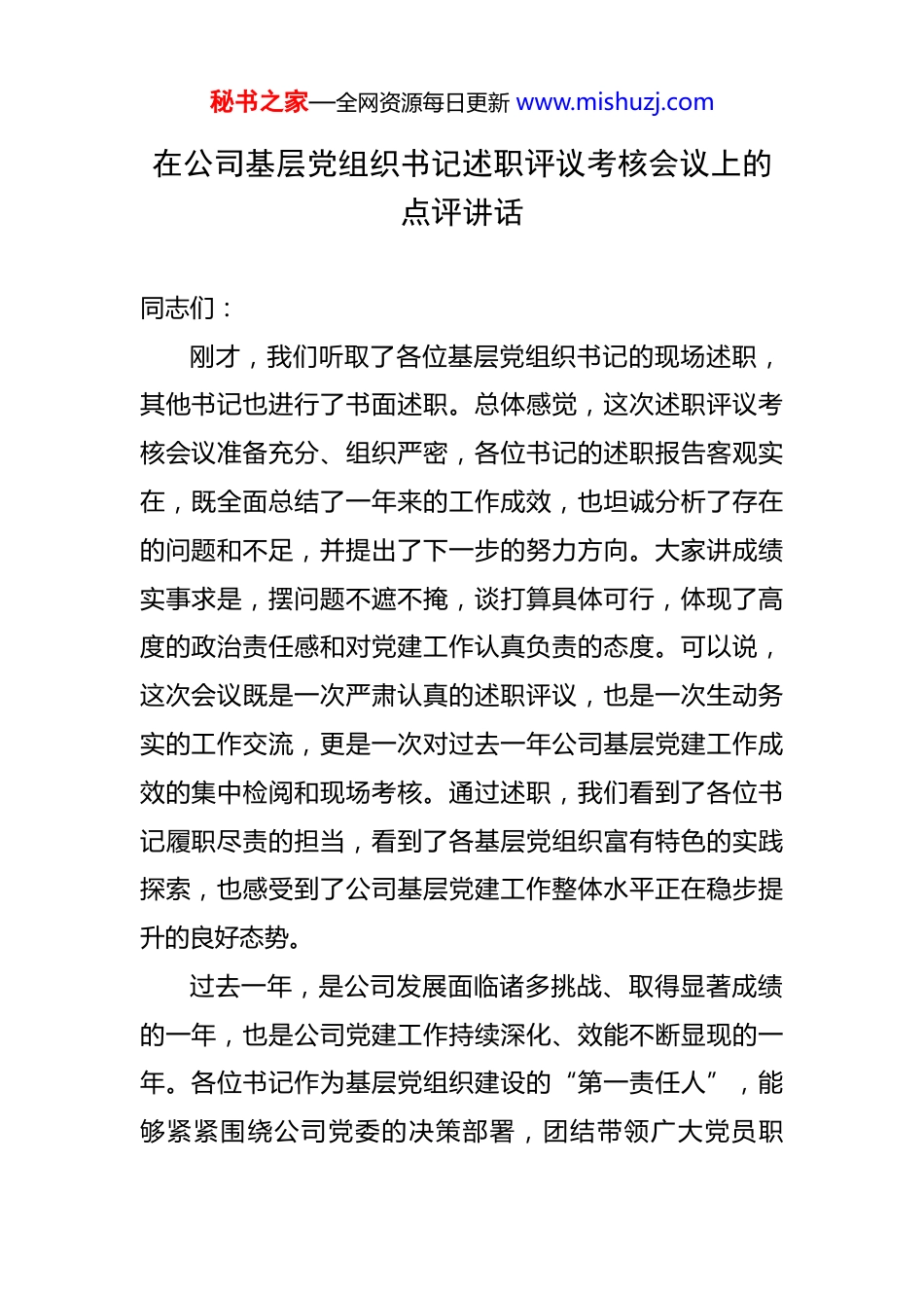 秘书之家—全网资源每日更新 www.mishuzj.com在公司基层党组织书记述职评议考核会议上的点评讲话 同志们:刚才,我们听取了各位基层党组织书记的现场述职,其他书记也进行了书面述职。总体感觉,这次述职评议考核会议准备充分、组织严密,各位书记的述职报告客观实在,既全面总结了一年来的工作成效,也坦诚分析了存在的问题和不足,并提出了下一步的努力方向。大家讲成绩实事求是,摆问题不遮不掩,谈打算具体可行,体现了高度的政治责任感和对党建工作认真负责的态度。可以说,这次会议既是一次严肃认真的述职评议,也是一次生动务实的工作交流,更是一次对过去一年公司基层党建工作成效的集中检阅和现场考核。通过述职,我们看到了各位书记履职尽责的担当,看到了各基层党组织富有特色的实践探索,也感受到了公司基层党建工作整体水平正在稳步提升的良好态势。过去一年,是公司发展面临诸多挑战、取得显著成绩的一年,也是公司党建工作持续深化、效能不断显现的一年。各位书记作为基层党组织建设的“第一责任人”,能够紧紧围绕公司党委的决策部署,团结带领广大党员职秘书之家—全网资源每日更新 www.mishuzj.com工,积极投身改革发展和生产经营主战场,付出了艰辛努力,做了大量卓有成效的工作,值得充分肯定。一是政治引领作用发挥更加充分。各位书记普遍能够把党的政治建设摆在首位,坚持用党的创新理论武装头脑、指导实践、推动工作。通过严格落实“第一议题”制度、认真组织理论学习中心组学习、扎实开展主题教育等多种形式,引导广大党员干部深刻领悟“两个确立”的决定性意义,增强“四个意识”、坚定“四个自信”、做到“两个维护”的政治自觉、思想自觉、行动自觉不断增强。能够坚决贯彻执行上级党委的各项决议决定,确保党的路线方针政策在基层得到不折不扣的落实,保证了企业发展的正确方向。二是党建主体责任压得更加严实。绝大多数书记能够牢固树立“抓好党建是本职、不抓党建是失职、抓不好党建是不称职”的理念,认真履行第一责任人职责。对党建工作亲自谋划、亲自部署、亲自推动、亲自检查的意识明显增强。能够定期研究党建工作,解决实际问题,在人财物等方面给予必要保障。层层传导压力,推动支部委员履职尽责,形成了书记抓、抓书记,一级抓一级、层层抓落实的党建工作格局。党建工作的系统性、计划性、规范性得到进一步提升。秘书之家—全网资源每日更新 www.mishuzj.com三是基层组织基础夯得更加牢固。各支部在标准化规范化建设上持续用力,“三会一课”、组织生活会、民主评议党员、主题党日等基本制度得到较好落实,组织生活的政治性、时代性、原则性、战斗性有所增强。党员教育管理监督得到加强,发展党员工作更加规范,党员队伍结构不断优化。积极探索党建与业务融合的有效路径,创建了一些具有自身特色的党建品牌和活动载体,如“党员责任区”、“党员示范岗”、“党员突击队”等,在攻坚克难、技术创新、市场开拓、安全生产等方面发挥了积极作用,党支部的战斗堡垒作用和党员的先锋模范作用得到了有效发挥。四是服务改革发展成效更加凸显。各位书记能够自觉围绕中心、服务大局,坚持党建工作与生产经营深度融合,努力以高质量党建引领保障高质量发展。能够紧密结合本单位、本部门的实际,找准党建工作的切入点和着力点,将党建工作融入重大任务、重点项目的全过程。通过强有力的思想政治工作和组织动员,有效激发了广大党员职工干事创业的精气神,凝聚了推动发展的强大合力,在完成急难险重任务、提升产品质量、提高经济效益、维护和谐稳定等方面,提供了坚强的政治和组织保证。五是党风廉政建设抓得更加深入。各位书记能够认真秘书之家—全网资源每日更新 www.mishuzj.com履行全面从严治党主体责任,带头执行廉洁从业各项规定,加强对党员的日常教育、管理和监督。积极开展警示教育,深化廉洁文化建设,引导党员干部知敬畏、存戒惧、守底线。能够支持纪检委员履行监督职责,推动全面从严治党向纵深发展、向基层延伸,营造了风清气正的良好政治生态。在肯定成绩的同时,我们也要清醒地认识到,对照新时代党的建设总要求,对照上级党委的期望和...