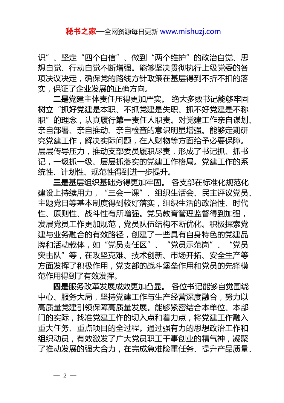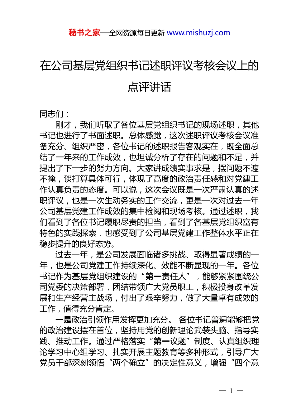 秘书之家—全网资源每日更新 www.mishuzj.com在公司基层党组织书记述职评议考核会议上的点评讲话同志们:刚才,我们听取了各位基层党组织书记的现场述职,其他书记也进行了书面述职。总体感觉,这次述职评议考核会议准备充分、组织严密,各位书记的述职报告客观实在,既全面总结了一年来的工作成效,也坦诚分析了存在的问题和不足,并提出了下一步的努力方向。大家讲成绩实事求是,摆问题不遮不掩,谈打算具体可行,体现了高度的政治责任感和对党建工作认真负责的态度。可以说,这次会议既是一次严肃认真的述职评议,也是一次生动务实的工作交流,更是一次对过去一年公司基层党建工作成效的集中检阅和现场考核。通过述职,我们看到了各位书记履职尽责的担当,看到了各基层党组织富有特色的实践探索,也感受到了公司基层党建工作整体水平正在稳步提升的良好态势。过去一年,是公司发展面临诸多挑战、取得显著成绩的一年,也是公司党建工作持续深化、效能不断显现的一年。各位书记作为基层党组织建设的“第一责任人”,能够紧紧围绕公司党委的决策部署,团结带领广大党员职工,积极投身改革发展和生产经营主战场,付出了艰辛努力,做了大量卓有成效的工作,值得充分肯定。一是政治引领作用发挥更加充分。 各位书记普遍能够把党的政治建设摆在首位,坚持用党的创新理论武装头脑、指导实践、推动工作。通过严格落实“第一议题”制度、认真组织理论学习中心组学习、扎实开展主题教育等多种形式,引导广大党员干部深刻领悟“两个确立”的决定性意义,增强“四个意— 1 —秘书之家—全网资源每日更新 www.mishuzj.com识”、坚定“四个自信”、做到“两个维护”的政治自觉、思想自觉、行动自觉不断增强。能够坚决贯彻执行上级党委的各项决议决定,确保党的路线方针政策在基层得到不折不扣的落实,保证了企业发展的正确方向。二是党建主体责任压得更加严实。 绝大多数书记能够牢固树立“抓好党建是本职、不抓党建是失职、抓不好党建是不称职”的理念,认真履行第一责任人职责。对党建工作亲自谋划、亲自部署、亲自推动、亲自检查的意识明显增强。能够定期研究党建工作,解决实际问题,在人财物等方面给予必要保障。层层传导压力,推动支部委员履职尽责,形成了书记抓、抓书记,一级抓一级、层层抓落实的党建工作格局。党建工作的系统性、计划性、规范性得到进一步提升。三是基层组织基础夯得更加牢固。 各支部在标准化规范化建设上持续用力,“三会一课”、组织生活会、民主评议党员、主题党日等基本制度得到较好落实,组织生活的政治性、时代性、原则性、战斗性有所增强。党员教育管理监督得到加强,发展党员工作更加规范,党员队伍结构不断优化。积极探索党建与业务融合的有效路径,创建了一些具有自身特色的党建品牌和活动载体,如“党员责任区”、“党员示范岗”、“党员突击队”等,在攻坚克难、技术创新、市场开拓、安全生产等方面发挥了积极作用,党支部的战斗堡垒作用和党员的先锋模范作用得到了有效发挥。四是服务改革发展成效更加凸显。 各位书记能够自觉围绕中心、服务大局,坚持党建工作与生产经营深度融合,努力以高质量党建引领保障高质量发展。能够紧密结合本单位、本部门的实际,找准党建工作的切入点和着力点,将党建工作融入重大任务、重点项目的全过程。通过强有力的思想政治工作和组织动员,有效激发了广大党员职工干事创业的精气神,凝聚了推动发展的强大合力,在完成急难险重任务、提升产品质量、— 2 —秘书之家—全网资源每日更新 www.mishuzj.com提高经济效益、维护和谐稳定等方面,提供了坚强的政治和组织保证。五是党风廉政建设抓得更加深入。 各位书记能够认真履行全面从严治党主体责任,带头执行廉洁从业各项规定,加强对党员的日常教育、管理和监督。积极开展警示教育,深化廉洁文化建设,引导党员干部知敬畏、存戒惧、守底线。能够支持纪检委员履行监督职责,推动全面从严治党向纵深发展、向基层延伸,营造了风清气正的良好政治生态。在肯定成绩的同时,我们也要清醒地认识到,对照新时代党的建设总要求,对照上级党委的期望和党员职工的期待,...