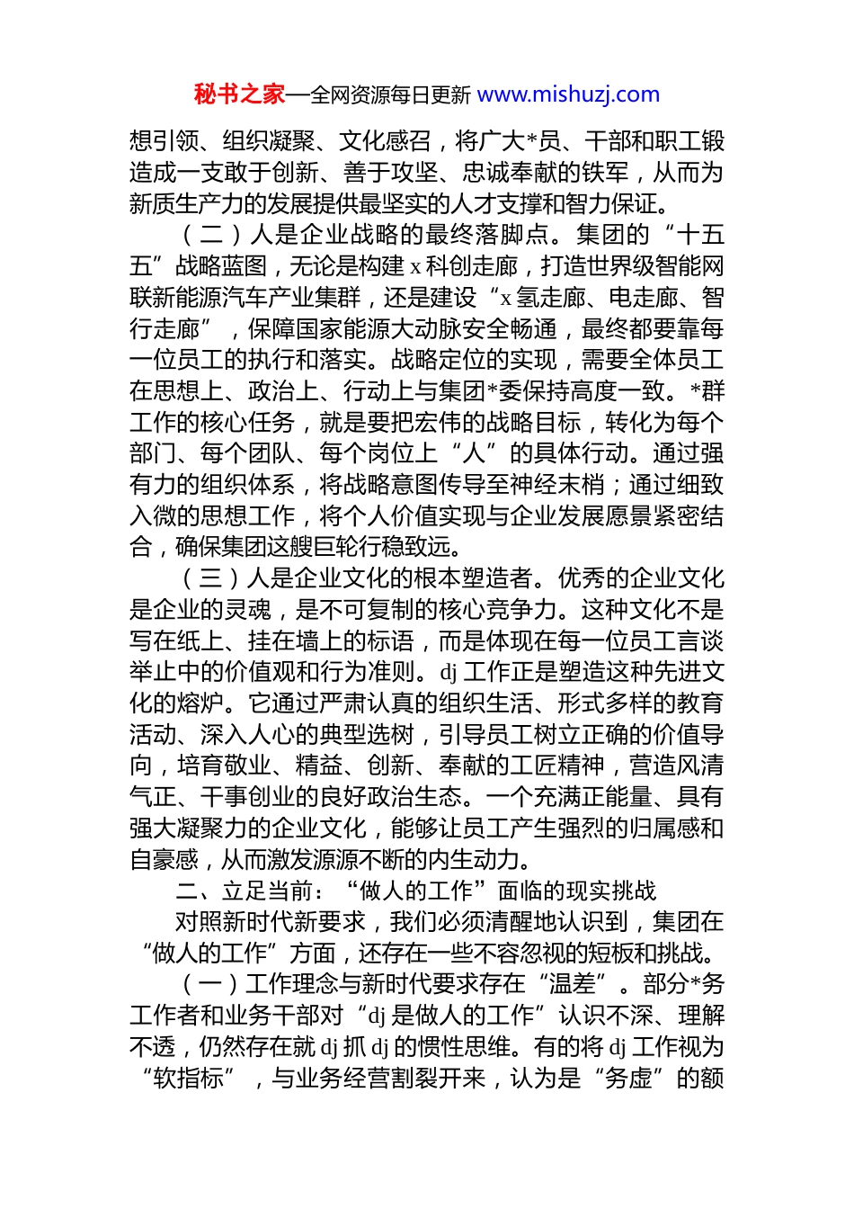 秘书之家—全网资源每日更新 www.mishuzj.com在集团“十五五”*群业务系统规划专题研讨会上的发言今天,我们召开集团“十五五”*群业务系统规划专题研讨会,主要任务是深入学习贯彻新时代*的建设总要求,聚焦“新质生产力”和“高质量发展”两大关键词,专题研讨“新时代如何深刻理解与系统把握‘dj 是做人的工作’这一核心要义”,为科学擘画集团未来五年*群工作的宏伟蓝图奠定坚实的思想与理论基础。“dj 是做人的工作”,这一论断深刻揭示了*的建设的本质规律和内在要求。在集团迈向世界一流、服务国家战略的关键时期,我们比以往任何时候都更需要激发人的创造力、凝聚人的向心力提升人的战斗力。因此,将这一核心要义融入“十五五”规划,不仅是政治任务,更是驱动集团基业长青的根本动力。一、回归本源:深刻理解“dj 是做人的工作”的时代内涵进入新时代,外部环境的复杂性、内部改革的艰巨性、科技革命的颠覆性前所未有。“dj 是做人的工作”这一命题,被赋予了更加丰富和深刻的时代内涵。(一)人是新质生产力的核心驱动要素。新质生产力以科技创新为核心驱动力,其载体是技术、资本和数据,但其真正的源头和最活跃的因素是人。无论是颠覆性技术的突破,还是生产要素的创新性配置,都离不开高素质、高水平、高觉悟的人才队伍。我们集团作为国家在先进制造和能源安全领域的骨干力量,承担着在载人航天、核能技术等领域突破关键核心技术的国家任务。这些尖端领域的竞争,归根到底是人才的竞争。dj 工作,就是要通过思秘书之家—全网资源每日更新 www.mishuzj.com想引领、组织凝聚、文化感召,将广大*员、干部和职工锻造成一支敢于创新、善于攻坚、忠诚奉献的铁军,从而为新质生产力的发展提供最坚实的人才支撑和智力保证。(二)人是企业战略的最终落脚点。集团的“十五五”战略蓝图,无论是构建 x 科创走廊,打造世界级智能网联新能源汽车产业集群,还是建设“x 氢走廊、电走廊、智行走廊”,保障国家能源大动脉安全畅通,最终都要靠每一位员工的执行和落实。战略定位的实现,需要全体员工在思想上、政治上、行动上与集团*委保持高度一致。*群工作的核心任务,就是要把宏伟的战略目标,转化为每个部门、每个团队、每个岗位上“人”的具体行动。通过强有力的组织体系,将战略意图传导至神经末梢;通过细致入微的思想工作,将个人价值实现与企业发展愿景紧密结合,确保集团这艘巨轮行稳致远。(三)人是企业文化的根本塑造者。优秀的企业文化是企业的灵魂,是不可复制的核心竞争力。这种文化不是写在纸上、挂在墙上的标语,而是体现在每一位员工言谈举止中的价值观和行为准则。dj 工作正是塑造这种先进文化的熔炉。它通过严肃认真的组织生活、形式多样的教育活动、深入人心的典型选树,引导员工树立正确的价值导向,培育敬业、精益、创新、奉献的工匠精神,营造风清气正、干事创业的良好政治生态。一个充满正能量、具有强大凝聚力的企业文化,能够让员工产生强烈的归属感和自豪感,从而激发源源不断的内生动力。二、立足当前:“做人的工作”面临的现实挑战对照新时代新要求,我们必须清醒地认识到,集团在“做人的工作”方面,还存在一些不容忽视的短板和挑战。(一)工作理念与新时代要求存在“温差”。部分*务工作者和业务干部对“dj 是做人的工作”认识不深、理解不透,仍然存在就 dj 抓 dj 的惯性思维。有的将 dj 工作视为“软指标”,与业务经营割裂开来,认为是“务虚”的额秘书之家—全网资源每日更新 www.mishuzj.com外负担,导致“两张皮”现象依然存在。有的在工作中,重程序、轻实效,重形式、轻内容,满足于开会、发文、建档,对如何深入到人、影响到人、激励到人思考不深、办法不多,存在一定程度的形式主义问题。(二)工作方式与数字化浪潮存在“时差”。当前,集团的经营管理、科技研发已全面拥抱数字化,但我们的*群工作在信息化、智能化方面还相对滞后。不少基层组织的管理模式依旧传统,依赖“人海战术”和手工台账,信息孤岛现象突出,工作效率不高。缺乏一个统一、高效、智能的*群业务系统,难以对*员队伍状况、职工思想动态、基层...
