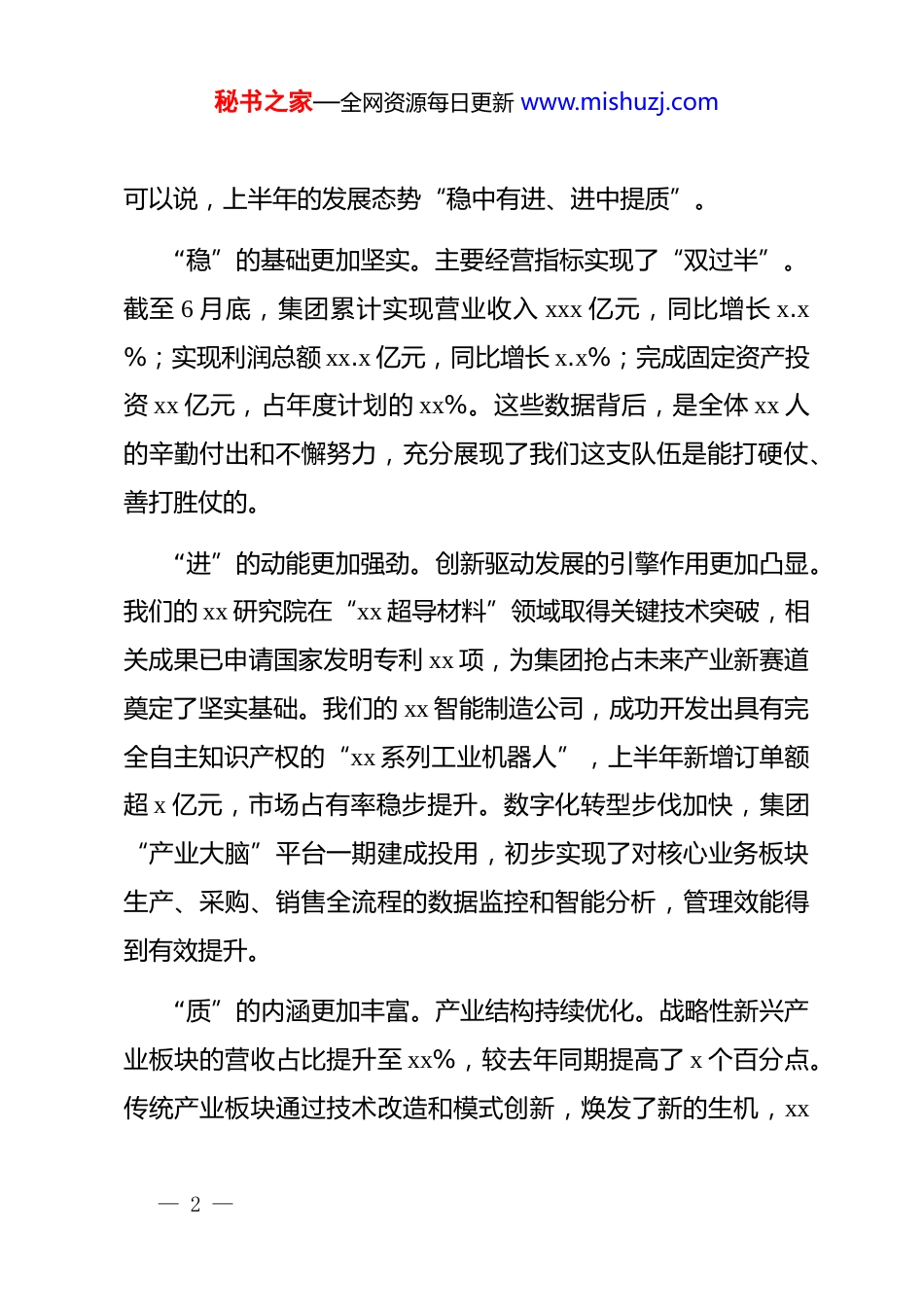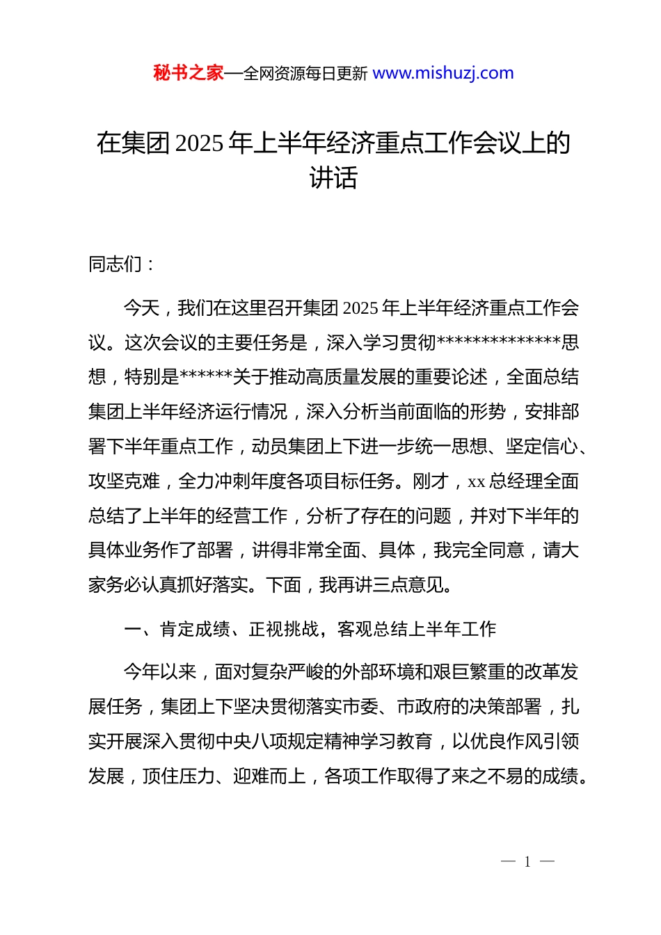 秘书之家—全网资源每日更新 www.mishuzj.com在集团 2025 年上半年经济重点工作会议上的讲话同志们:今天,我们在这里召开集团 2025 年上半年经济重点工作会议。这次会议的主要任务是,深入学习贯彻**************思想,特别是******关于推动高质量发展的重要论述,全面总结集团上半年经济运行情况,深入分析当前面临的形势,安排部署下半年重点工作,动员集团上下进一步统一思想、坚定信心、攻坚克难,全力冲刺年度各项目标任务。刚才,xx 总经理全面总结了上半年的经营工作,分析了存在的问题,并对下半年的具体业务作了部署,讲得非常全面、具体,我完全同意,请大家务必认真抓好落实。下面,我再讲三点意见。一、肯定成绩、正视挑战,客观总结上半年工作今年以来,面对复杂严峻的外部环境和艰巨繁重的改革发展任务,集团上下坚决贯彻落实市委、市政府的决策部署,扎实开展深入贯彻中央八项规定精神学习教育,以优良作风引领发展,顶住压力、迎难而上,各项工作取得了来之不易的成绩。— 1 —秘书之家—全网资源每日更新 www.mishuzj.com可以说,上半年的发展态势“稳中有进、进中提质”。“稳”的基础更加坚实。主要经营指标实现了“双过半”。截至 6 月底,集团累计实现营业收入 xxx 亿元,同比增长 x.x%;实现利润总额 xx.x 亿元,同比增长 x.x%;完成固定资产投资 xx 亿元,占年度计划的 xx%。这些数据背后,是全体 xx 人的辛勤付出和不懈努力,充分展现了我们这支队伍是能打硬仗、善打胜仗的。“进”的动能更加强劲。创新驱动发展的引擎作用更加凸显。我们的 xx 研究院在“xx 超导材料”领域取得关键技术突破,相关成果已申请国家发明专利 xx 项,为集团抢占未来产业新赛道奠定了坚实基础。我们的 xx 智能制造公司,成功开发出具有完全自主知识产权的“xx 系列工业机器人”,上半年新增订单额超 x 亿元,市场占有率稳步提升。数字化转型步伐加快,集团“产业大脑”平台一期建成投用,初步实现了对核心业务板块生产、采购、销售全流程的数据监控和智能分析,管理效能得到有效提升。“质”的内涵更加丰富。产业结构持续优化。战略性新兴产业板块的营收占比提升至 xx%,较去年同期提高了 x 个百分点。传统产业板块通过技术改造和模式创新,焕发了新的生机,xx— 2 —秘书之家—全网资源每日更新 www.mishuzj.com化工公司的“绿色循环生产线”项目成功投产,能耗和污染物排放均降低了 xx%以上。品牌影响力不断扩大,集团成功入选“中国制造业 500 强”,排名较去年跃升 xx 位,社会美誉度和市场认可度显著增强。这些成绩的取得,是市委市政府坚强领导的结果,是集团全体干部职工团结拼搏、奋勇争先的结果。在这里,我代表集团*委,向大家表示衷心的感谢!在肯定成绩的同时,我们更要清醒地看到前进道路上的困难和挑战。从外部看,全球经济复苏乏力,产业链供应链风险加剧,市场竞争日趋白热化,对我们的传统优势业务构成了巨大压力。从内部看,我们的发展不平衡不充分问题依然突出。有的子公司经营效益不佳,仍处于亏损状态;有的项目推进速度不及预期,投资效益有待提升;部分干部的市场意识、创新精神和攻坚能力还有待加强;形式主义、官僚主义等作风顽疾在一定程度上仍然存在,影响了决策效率和执行力。对于这些问题,我们必须高度重视,拿出壮士断腕的勇气,采取有力措施,切实加以解决。二、锚定目标、聚焦重点,全力冲刺下半年任务— 3 —秘书之家—全网资源每日更新 www.mishuzj.com下半年是决定全年收成、奠定明年基础的关键时期。我们必须保持清醒、坚定信心,紧紧围绕“高质量发展”这一首要任务,以“时时放心不下”的责任感和“事事落实到位”的执行力,全力打好下半场攻坚战。第一,要以决战决胜的姿态,全力以赴稳增长、提效益。稳增长是硬任务,是集团生存发展的根基。各单位要将年度目标任务再分解、再压实,把责任落实到每个环节、每个岗位、每个人头。市场营销部门要拿出“虎口夺食”的劲头,深耕传统市场,抢占新兴市场,全力以赴抢订单、拓份额。生产单位要精打细算,深入推进降本增效,向管理要效益、向技...