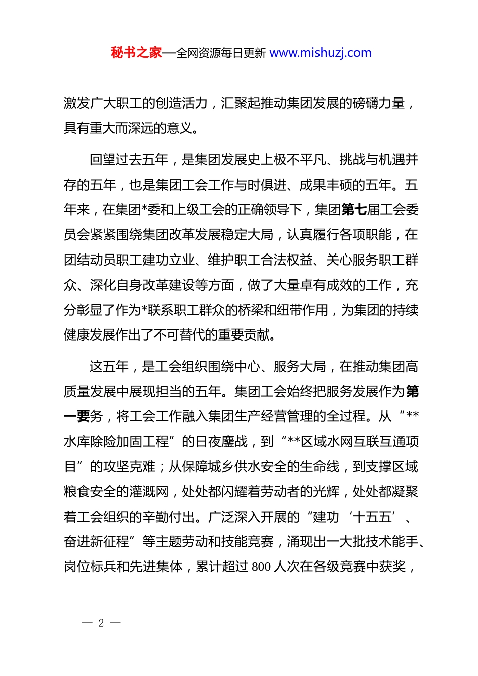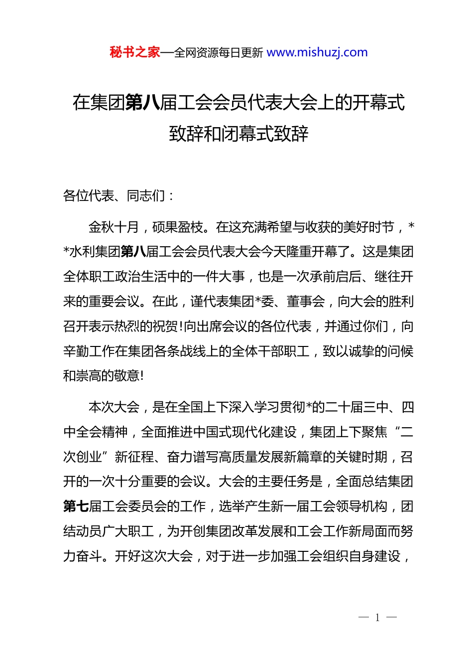 秘书之家—全网资源每日更新 www.mishuzj.com在集团第八届工会会员代表大会上的开幕式致辞和闭幕式致辞各位代表、同志们:金秋十月,硕果盈枝。在这充满希望与收获的美好时节,**水利集团第八届工会会员代表大会今天隆重开幕了。这是集团全体职工政治生活中的一件大事,也是一次承前启后、继往开来的重要会议。在此,谨代表集团*委、董事会,向大会的胜利召开表示热烈的祝贺!向出席会议的各位代表,并通过你们,向辛勤工作在集团各条战线上的全体干部职工,致以诚挚的问候和崇高的敬意!本次大会,是在全国上下深入学习贯彻*的二十届三中、四中全会精神,全面推进中国式现代化建设,集团上下聚焦“二次创业”新征程、奋力谱写高质量发展新篇章的关键时期,召开的一次十分重要的会议。大会的主要任务是,全面总结集团第七届工会委员会的工作,选举产生新一届工会领导机构,团结动员广大职工,为开创集团改革发展和工会工作新局面而努力奋斗。开好这次大会,对于进一步加强工会组织自身建设,— 1 —秘书之家—全网资源每日更新 www.mishuzj.com激发广大职工的创造活力,汇聚起推动集团发展的磅礴力量,具有重大而深远的意义。回望过去五年,是集团发展史上极不平凡、挑战与机遇并存的五年,也是集团工会工作与时俱进、成果丰硕的五年。五年来,在集团*委和上级工会的正确领导下,集团第七届工会委员会紧紧围绕集团改革发展稳定大局,认真履行各项职能,在团结动员职工建功立业、维护职工合法权益、关心服务职工群众、深化自身改革建设等方面,做了大量卓有成效的工作,充分彰显了作为*联系职工群众的桥梁和纽带作用,为集团的持续健康发展作出了不可替代的重要贡献。这五年,是工会组织围绕中心、服务大局,在推动集团高质量发展中展现担当的五年。集团工会始终把服务发展作为第一要务,将工会工作融入集团生产经营管理的全过程。从“**水库除险加固工程”的日夜鏖战,到“**区域水网互联互通项目”的攻坚克难;从保障城乡供水安全的生命线,到支撑区域粮食安全的灌溉网,处处都闪耀着劳动者的光辉,处处都凝聚着工会组织的辛勤付出。广泛深入开展的“建功‘十五五’、奋进新征程”等主题劳动和技能竞赛,涌现出一大批技术能手、岗位标兵和先进集体,累计超过 800 人次在各级竞赛中获奖,— 2 —秘书之家—全网资源每日更新 www.mishuzj.com有 3 个集体荣获“**市工人先锋号”称号。这些活动极大地激发了广大职工的劳动热情和创造潜能,为集团优质高效完成各项重大工程建设和生产经营任务提供了坚实的人才保障和精神动力。这五年,是工会组织履行主责、维护权益,在构建和谐劳动关系中彰显作为的五年。集团工会始终坚持以职工为中心的工作导向,把职工群众的冷暖安危放在心上。通过深化职工代表大会制度,保障职工的知情权、参与权、表达权和监督权落到实处,累计收集并推动解决了 210 余项涉及职工切身利益的提案。持续加强劳动保护监督检查,深入开展“安康杯”竞赛活动,五年来集团安全生产事故率持续下降,有效维护了职工的生命安全和健康权益。面对新形势下的劳动关系变化,主动作为,积极探索集体协商新模式,就薪酬增长、福利待遇、职业发展等关键问题与行政方进行有效沟通,签订的集体合同履约率达到 100%,有力促进了企业与职工的和谐共赢。这五年,是工会组织情系职工、普惠服务,在提升职工幸福指数中彰显温度的五年。集团工会用心用情用力解决职工群众的“急难愁盼”问题。坚持开展“夏送清凉、冬送温暖、金秋助学”等品牌活动,五年累计投入帮扶资金超过 300 万元,— 3 —秘书之家—全网资源每日更新 www.mishuzj.com慰问困难职工、一线职工近 5000 人次,资助困难职工子女 150余名圆了大学梦。“职工之家”建设提质升级,从文体活动中心的落成,到职工书屋、母婴关爱室、心理健康服务站的建立,服务阵地不断拓展,服务内涵不断丰富。举办的篮球赛、趣味运动会、摄影展、文艺汇演等一系列文体活动,丰富了职工业余文化生活,陶冶了情操,凝聚了人心,营造了健康向上、和谐融洽的企业文化氛围。这五年,是工会组织强基固本、锐意创新,在加强自身...