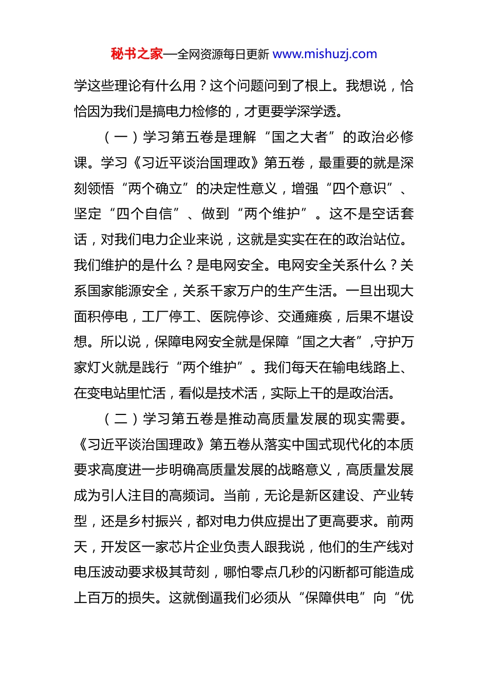 秘书之家—全网资源每日更新 www.mishuzj.com在企业党委理论学习中心组学习《习近平谈治国理政》第五卷专题研讨会上的发言 同志们:今天,我们召开公司党委理论学习中心组专题学习会,集中学习研讨《习近平谈治国理政》第五卷。这部重要著作收入了习近平总书记在 2022 年 5 月 27 日至 2024年 12 月 20 日期间的报告、讲话、谈话、演讲、致辞、文章、指示等 91 篇,分为 18 个专题,生动记录了面对严峻复杂的国际环境和艰巨繁重的国内改革发展稳定任务,以习近平同志为核心的党中央统筹国内国际两个大局,完整准确全面贯彻新发展理念,着力推动高质量发展,推动全面建设社会主义现代化国家迈出坚实步伐的生动实践。作为承担电网安全“压舱石”重任的检修企业,学深悟透这部纲领性文献,把思想和行动统一到党中央决策部署上来,对于我们找准前进方向、提升履职能力具有重要意义。下面,我结合公司实际,从“为什么学”“怎么学”“怎么办”三个方面谈谈体会。一、深刻认识“为什么学”——在把握时代方位中找准使命坐标说实话,有的同志可能会想,我们是搞电力检修的,秘书之家—全网资源每日更新 www.mishuzj.com学这些理论有什么用?这个问题问到了根上。我想说,恰恰因为我们是搞电力检修的,才更要学深学透。(一)学习第五卷是理解“国之大者”的政治必修课。学习《习近平谈治国理政》第五卷,最重要的就是深刻领悟“两个确立”的决定性意义,增强“四个意识”、坚定“四个自信”、做到“两个维护”。这不是空话套话,对我们电力企业来说,这就是实实在在的政治站位。我们维护的是什么?是电网安全。电网安全关系什么?关系国家能源安全,关系千家万户的生产生活。一旦出现大面积停电,工厂停工、医院停诊、交通瘫痪,后果不堪设想。所以说,保障电网安全就是保障“国之大者”,守护万家灯火就是践行“两个维护”。我们每天在输电线路上、在变电站里忙活,看似是技术活,实际上干的是政治活。(二)学习第五卷是推动高质量发展的现实需要。《习近平谈治国理政》第五卷从落实中国式现代化的本质要求高度进一步明确高质量发展的战略意义,高质量发展成为引人注目的高频词。当前,无论是新区建设、产业转型,还是乡村振兴,都对电力供应提出了更高要求。前两天,开发区一家芯片企业负责人跟我说,他们的生产线对电压波动要求极其苛刻,哪怕零点几秒的闪断都可能造成上百万的损失。这就倒逼我们必须从“保障供电”向“优秘书之家—全网资源每日更新 www.mishuzj.com质服务”转变,从“经验检修”向“智慧运维”升级。而这些转变的理论指引和实践路径,第五卷里讲得清清楚楚。(三)学习第五卷是破解发展难题的思想武器。坦率讲,我们公司面临不少难题:设备老化与检修任务重的矛盾、安全压力大与人员紧张的矛盾、传统模式与数字化转型的矛盾。这些问题靠老办法解决不了,必须用新理念新思想来破题。习近平总书记创造性提出因地制宜发展新质生产力,从理论上总结概括新质生产力的基本内涵、本质特征、发展途径等,强调发展新质生产力是推动高质量发展的内在要求和重要着力点。这为我们指明了方向——向科技创新要答案、要效率、要安全。二、准确把握“怎么学”——在学深悟透中汲取真理力量学习不能搞形式主义,不能“学归学、干归干”。怎么学才能学出成效?我觉得要把握三个关键。(一)原原本本学,在逐字逐句中悟透精髓要义。要原原本本、逐篇逐句研读《习近平谈治国理政》第五卷关于中国式现代化、新质生产力、党的自我革命等重要论述。不能光听别人讲、看别人的学习笔记,必须自己静下心来读原著、学原文、悟原理。我自己这段时间每天早上秘书之家—全网资源每日更新 www.mishuzj.com坚持学一个专题,反复读、认真想,有时候一句话要琢磨好几遍。比如总书记讲“人民至上、生命至上”,最开始觉得理解了,但细想我们检修工作,这话就越琢磨越有味道——既要保证检修人员的生命安全,也要保证电网安全运行,让老百姓用上安全电、放心电,这才是真正的“人民至上”。(二)联系实际学,在结合工作中找准发力方向。要认认真真读原著、学原文、悟原理,努力做到...