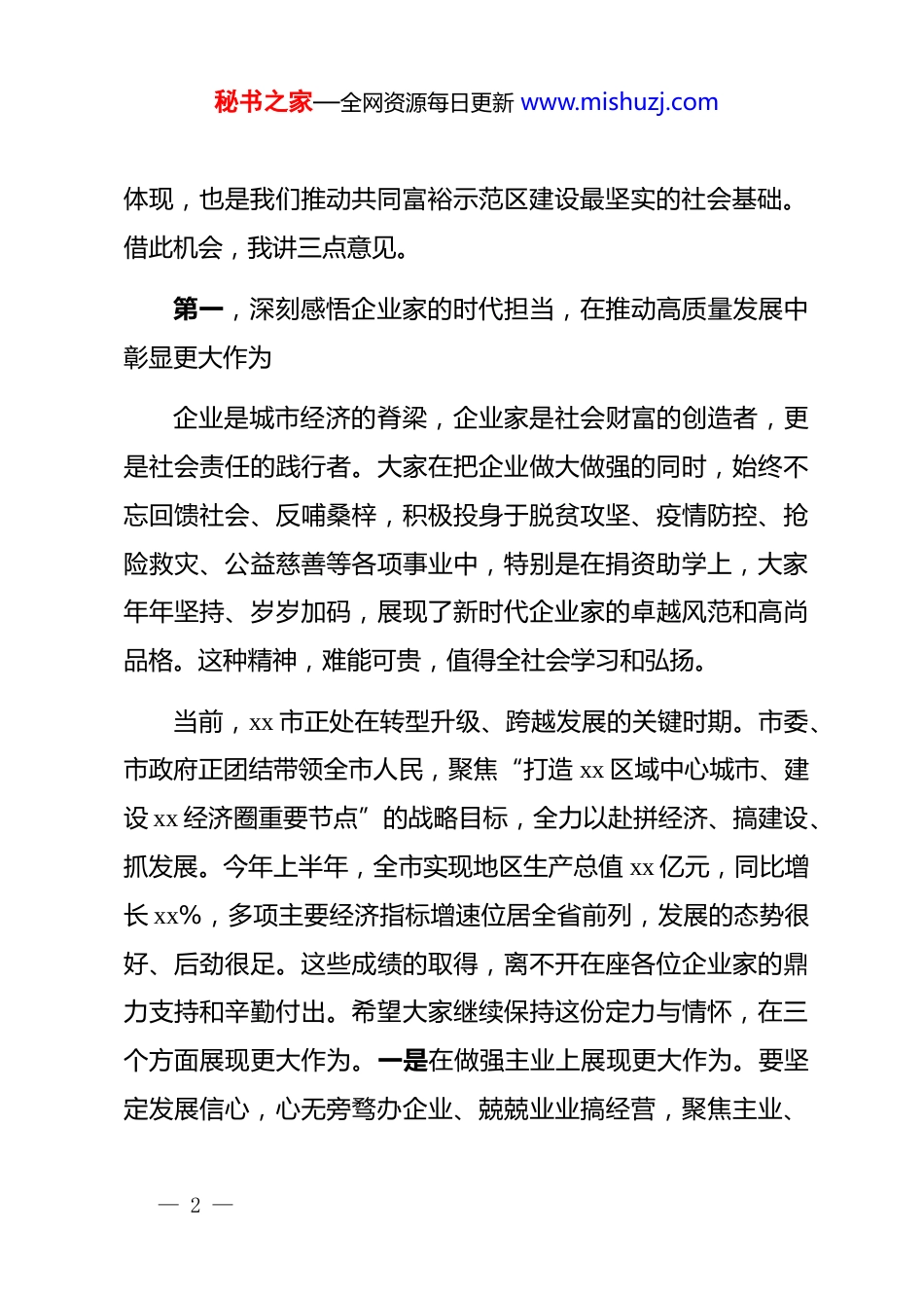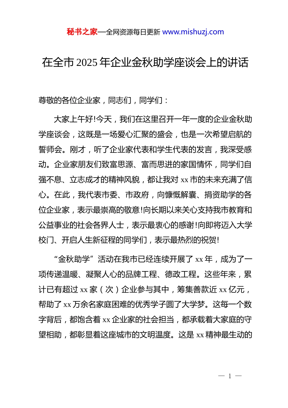 秘书之家—全网资源每日更新 www.mishuzj.com在全市 2025 年企业金秋助学座谈会上的讲话尊敬的各位企业家,同志们,同学们:大家上午好!今天,我们在这里召开一年一度的企业金秋助学座谈会,这既是一场爱心汇聚的盛会,也是一次希望启航的誓师会。刚才,听了企业家代表和学生代表的发言,我深受感动。企业家朋友们致富思源、富而思进的家国情怀,同学们自强不息、立志成才的精神风貌,都让我对 xx 市的未来充满了信心。在此,我代表市委、市政府,向慷慨解囊、捐资助学的各位企业家,表示最崇高的敬意!向长期以来关心支持我市教育和公益事业的社会各界人士,表示最衷心的感谢!向即将迈入大学校门、开启人生新征程的同学们,表示最热烈的祝贺!“金秋助学”活动在我市已经连续开展了 xx 年,成为了一项传递温暖、凝聚人心的品牌工程、德政工程。这些年来,累计已有超过 xx 家(次)企业参与其中,筹集善款近 xx 亿元,帮助了 xx 万余名家庭困难的优秀学子圆了大学梦。这每一个数字背后,都饱含着 xx 企业家的社会担当,都承载着大家庭的守望相助,都彰显着这座城市的文明温度。这是 xx 精神最生动的— 1 —秘书之家—全网资源每日更新 www.mishuzj.com体现,也是我们推动共同富裕示范区建设最坚实的社会基础。借此机会,我讲三点意见。第一,深刻感悟企业家的时代担当,在推动高质量发展中彰显更大作为企业是城市经济的脊梁,企业家是社会财富的创造者,更是社会责任的践行者。大家在把企业做大做强的同时,始终不忘回馈社会、反哺桑梓,积极投身于脱贫攻坚、疫情防控、抢险救灾、公益慈善等各项事业中,特别是在捐资助学上,大家年年坚持、岁岁加码,展现了新时代企业家的卓越风范和高尚品格。这种精神,难能可贵,值得全社会学习和弘扬。当前,xx 市正处在转型升级、跨越发展的关键时期。市委、市政府正团结带领全市人民,聚焦“打造 xx 区域中心城市、建设 xx 经济圈重要节点”的战略目标,全力以赴拼经济、搞建设、抓发展。今年上半年,全市实现地区生产总值 xx 亿元,同比增长 xx%,多项主要经济指标增速位居全省前列,发展的态势很好、后劲很足。这些成绩的取得,离不开在座各位企业家的鼎力支持和辛勤付出。希望大家继续保持这份定力与情怀,在三个方面展现更大作为。一是在做强主业上展现更大作为。要坚定发展信心,心无旁骛办企业、兢兢业业搞经营,聚焦主业、— 2 —秘书之家—全网资源每日更新 www.mishuzj.com深耕实业,持续加大科技创新投入,积极抢占产业链、价值链的高端,努力打造更多“百年老店”和行业标杆,为 xx 市高质量发展筑牢坚实根基。二是在履行社会责任上展现更大作为。要继续弘扬义利兼顾、德行并重的优良传统,更加积极地参与到光彩事业、慈善事业中来,特别是在促进就业、关爱员工、保护环境、助力共同富裕等方面,发挥好示范引领作用,让企业发展的成果更多更公平地惠及全市人民。三是在建言献策上展现更大作为。大家身处市场一线,对经济冷暖的感受最直接,对政策得失的判断最敏锐。希望大家围绕市委、市政府的中心工作,多提宝贵意见,多献发展良策,当好市委、市政府科学决策的“智囊团”和“参谋部”。市委、市政府也将一如既往地当好企业发展的坚强后盾,持续优化营商环境,精准落实各项惠企政策,用心用情为企业排忧解难,构建“亲”“清”新型政商关系,让大家在 xx 投资放心、发展安心、生活舒心。第二,深刻领会***的殷切期望,在实现人生理想中书写无悔青春******对青年一代寄予厚望,***指出:“青年一代有理想、有本领、有担当,国家就有前途,民族就有希望。”同学们,你们是幸运的一代,成长在国家繁荣富强、社会和谐稳定的伟— 3 —秘书之家—全网资源每日更新 www.mishuzj.com大时代;你们也是肩负重任的一代,实现中华民族伟大复兴的中国梦,将在你们的接力奋斗中变为现实。今天,社会各界的爱心,帮助你们顺利开启了大学生活。希望你们把这份关爱转化为前行的动力,努力做到以下四点:一是要立鸿鹄之志,做志存高远的追梦人。志不立,天下无可成之事。大学是人生的“拔节孕穗期”,确立什么...