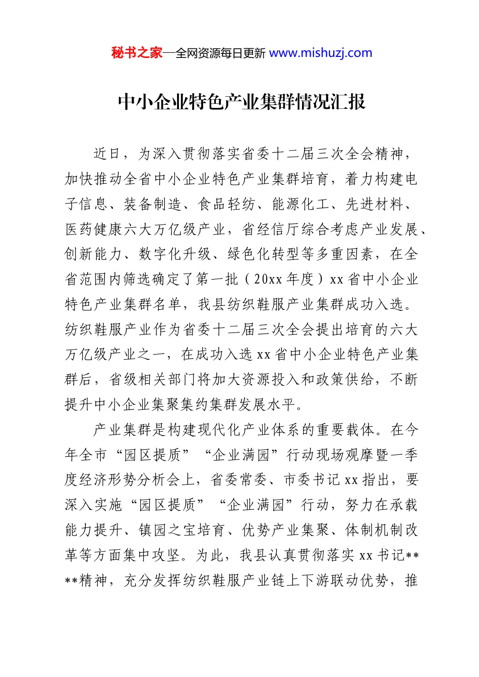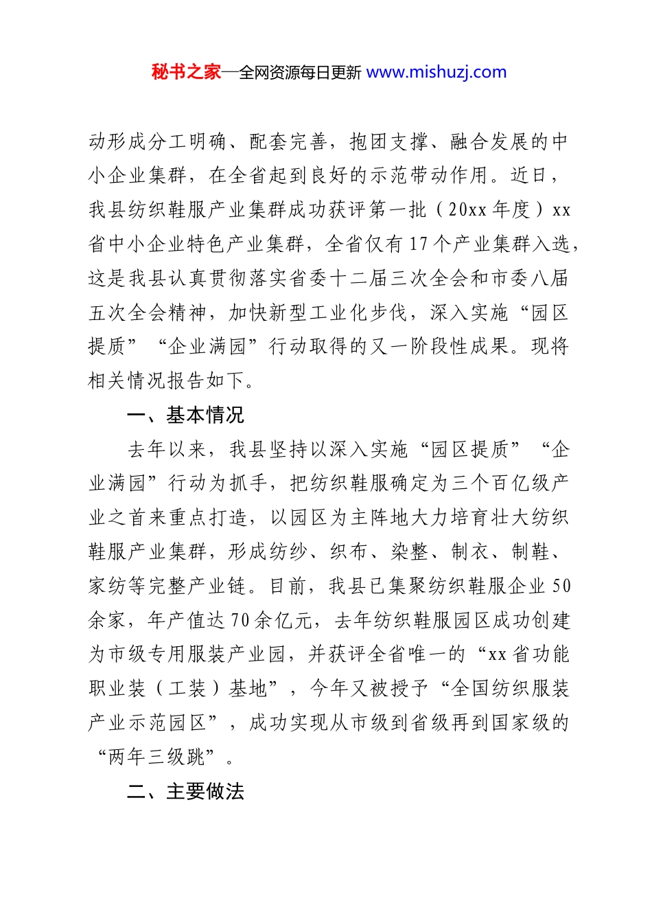 秘书之家—全网资源每日更新 www.mishuzj.com中小企业特色产业集群情况汇报近日,为深入贯彻落实省委十二届三次全会精神,加快推动全省中小企业特色产业集群培育,着力构建电子信息、装备制造、食品轻纺、能源化工、先进材料、医药健康六大万亿级产业,省经信厅综合考虑产业发展、创新能力、数字化升级、绿色化转型等多重因素,在全省范围内筛选确定了第一批(20xx 年度)xx 省中小企业特色产业集群名单,我县纺织鞋服产业集群成功入选。纺织鞋服产业作为省委十二届三次全会提出培育的六大万亿级产业之一,在成功入选 xx 省中小企业特色产业集群后,省级相关部门将加大资源投入和政策供给,不断提升中小企业集聚集约集群发展水平。产业集群是构建现代化产业体系的重要载体。在今年全市“园区提质”“企业满园”行动现场观摩暨一季度经济形势分析会上,省委常委、市委书记 xx 指出,要深入实施“园区提质”“企业满园”行动,努力在承载能力提升、镇园之宝培育、优势产业集聚、体制机制改革等方面集中攻坚。为此,我县认真贯彻落实 xx 书记****精神,充分发挥纺织鞋服产业链上下游联动优势,推秘书之家—全网资源每日更新 www.mishuzj.com动形成分工明确、配套完善,抱团支撑、融合发展的中小企业集群,在全省起到良好的示范带动作用。近日,我县纺织鞋服产业集群成功获评第一批(20xx 年度)xx省中小企业特色产业集群,全省仅有 17 个产业集群入选,这是我县认真贯彻落实省委十二届三次全会和市委八届五次全会精神,加快新型工业化步伐,深入实施“园区提质”“企业满园”行动取得的又一阶段性成果。现将相关情况报告如下。一、基本情况去年以来,我县坚持以深入实施“园区提质”“企业满园”行动为抓手,把纺织鞋服确定为三个百亿级产业之首来重点打造,以园区为主阵地大力培育壮大纺织鞋服产业集群,形成纺纱、织布、染整、制衣、制鞋、家纺等完整产业链。目前,我县已集聚纺织鞋服企业 50余家,年产值达 70 余亿元,去年纺织鞋服园区成功创建为市级专用服装产业园,并获评全省唯一的“xx 省功能职业装(工装)基地”,今年又被授予“全国纺织服装产业示范园区”,成功实现从市级到省级再到国家级的“两年三级跳”。二、主要做法秘书之家—全网资源每日更新 www.mishuzj.com一是坚持招大育强,打造集群发展“生力军”。遵照 xx 书记“着力招大引强、招新引优,打造具有全国影响力、核心竞争力的创新产业集群”指示精神,我县坚持有什么招什么、缺什么招什么、什么弱招什么,科学编制纺织鞋服产业招商图谱,依托活动,组建专业招商分队前往福建、广东等地开展“链”式招商活动 40 余次,去年以来累计招引安吉纳体育(xx)数字化产业园、秦禾轻纺产业园等项目 45 个、总投资 367.95 亿元。建立中小企业梯次培育储备库,实行专班服务和“一对一”培育指导,推动佳联佳禧、鸿星尔克等企业发展壮大,佳联印染成功入选全省制造业“贡嘎培优”名单、“全省 20xx 制造业企业 100 强”。20xx 年纺织鞋服领域新增20 亿级企业 1 户、10 亿级企业 1 户,实现历史性突破。二是坚持数智赋能,激活创新升级“动力源”。遵照 xx 书记“整合行业创新资源,组建龙头企业牵头、院所和高校支撑、各类创新主体协同的创新联合体,推进产学研一体化”指示精神,我县坚持围绕产业链部署创新链、围绕创新链布局产业链,累计发放奖补资金 9000余万元,支持企业锚定细分市场、技术领域和客户需求,走“专精特新”的发展道路,持续提升技术创新能力和秘书之家—全网资源每日更新 www.mishuzj.com生产工艺水平,佳禧印染成为首批国家级专精特新“小巨人”企业,近期开工建设的安吉纳体育数字化产业园建成之后将成为全省首个服装智能制造数字化产业园。支持引导县内企业牵头成立“xx 工装产业链战略联盟”,联合省内产业链上下游企业开展共性技术、关键技术攻关,并定期举办“揭榜挂帅”活动,招募优秀科研团队推动技术攻关和成果转化,提升产品技术含量和质量,目前集群企业拥有国家发明专利 15 项,研发经费年均增长超过 80%。三是坚持精准服务,下好要素保障“...